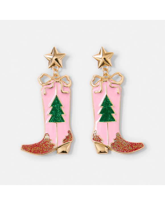 Christmas Cowboy Boot Earrings - Gold Tone and Pink