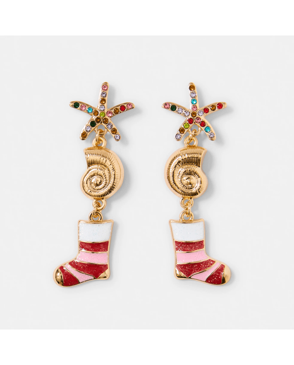 Christmas Shells Stocking Earrings - Gold Tone, Red, White and Pink