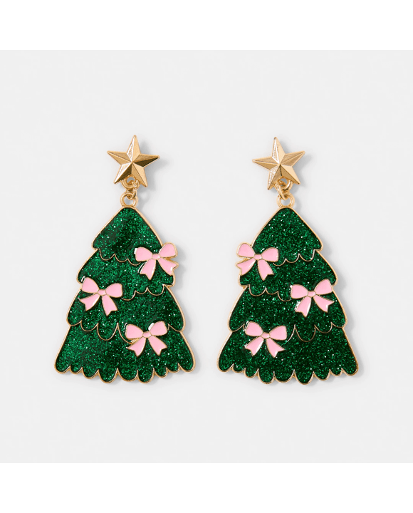 Christmas Bow Christmas Tree Earrings - Green, Pink and Gold Tone