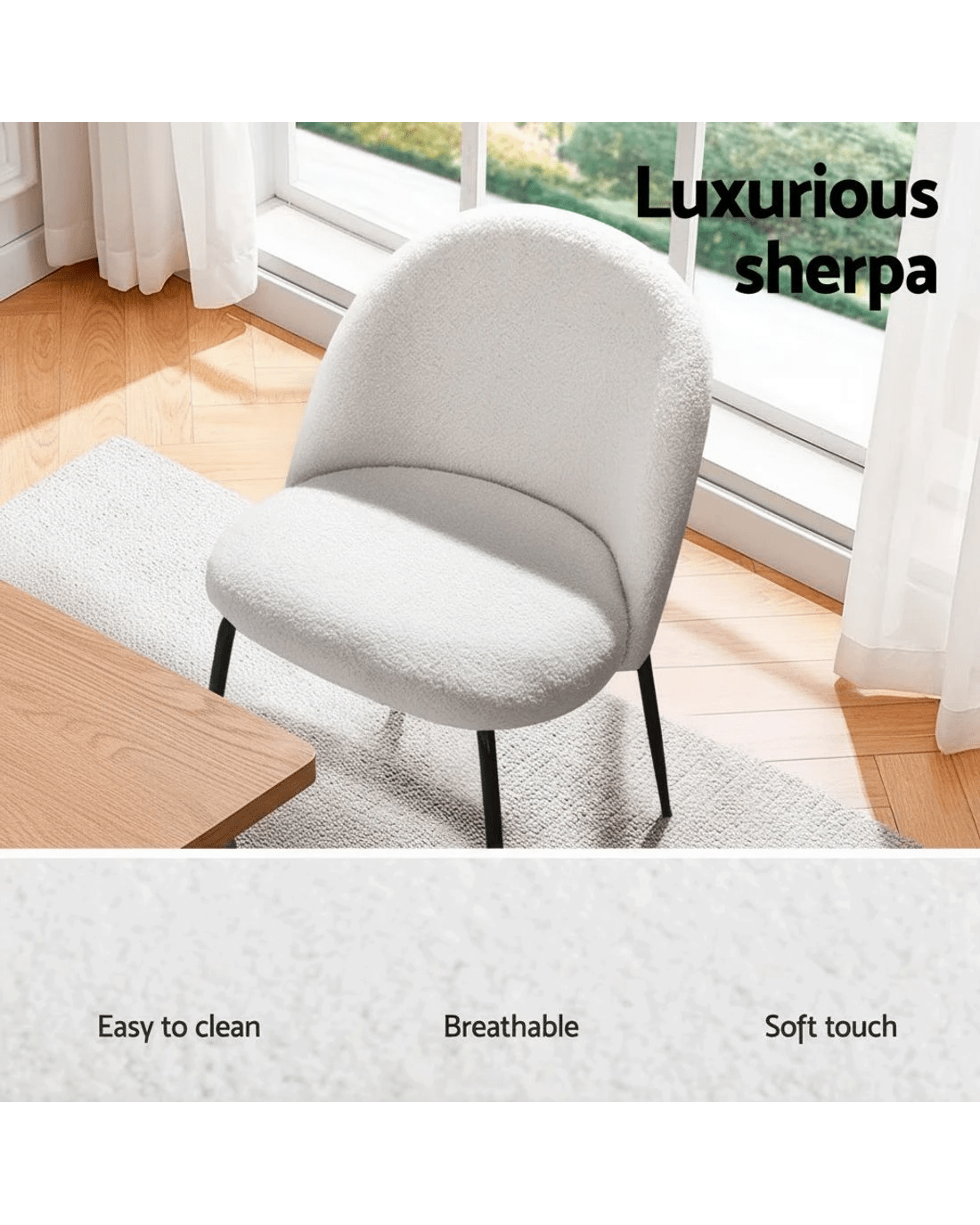 Incredibly stylish and sophisticated, our Artiss dining chairs feature inner solid construction with luxurious sherpa upholstery that ensures lasting quality and ultimate comfort when seated. It features solid steel legs with an anti-slip floor protectors for ultimate stability and keeping your floors scratch-free. The dining chairs flaunt plush seats made with high-resilience foam that offer incredible comfort and support, and the curvy winged backrest with cushioned support allow you to dine with great comfort. Our dining chairs can hold up to 150kg weight, and their sturdy steel legs make them super stable and reliable.