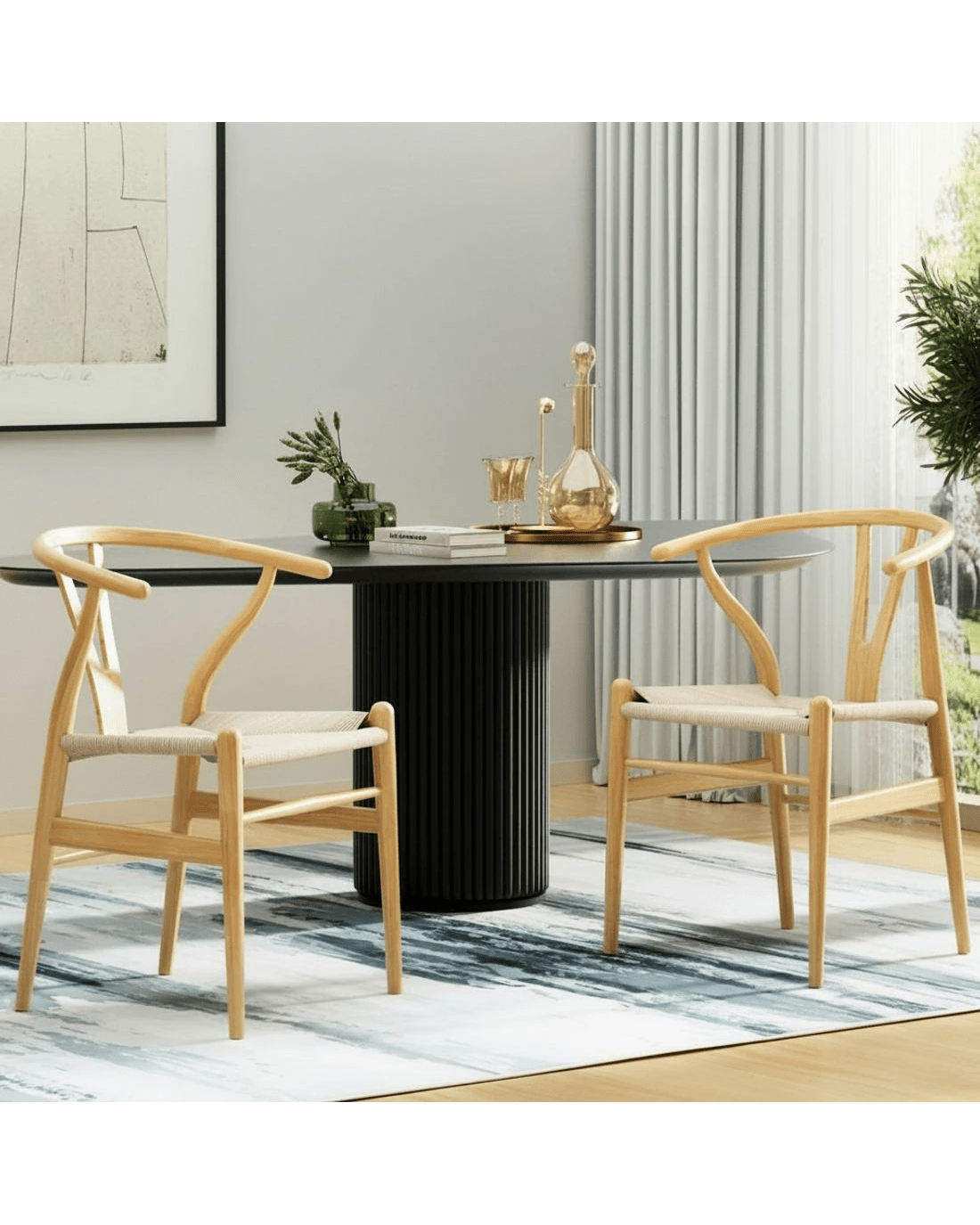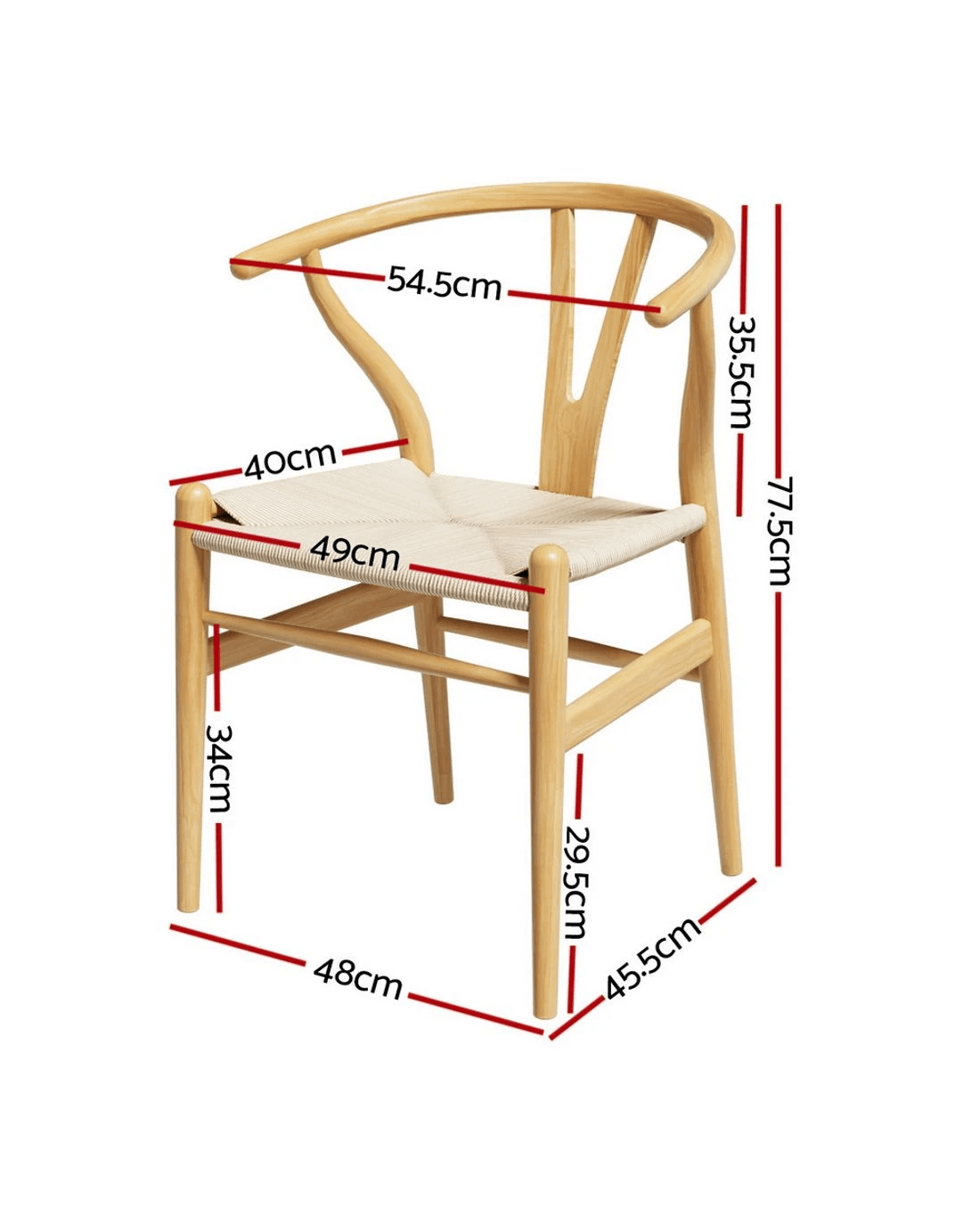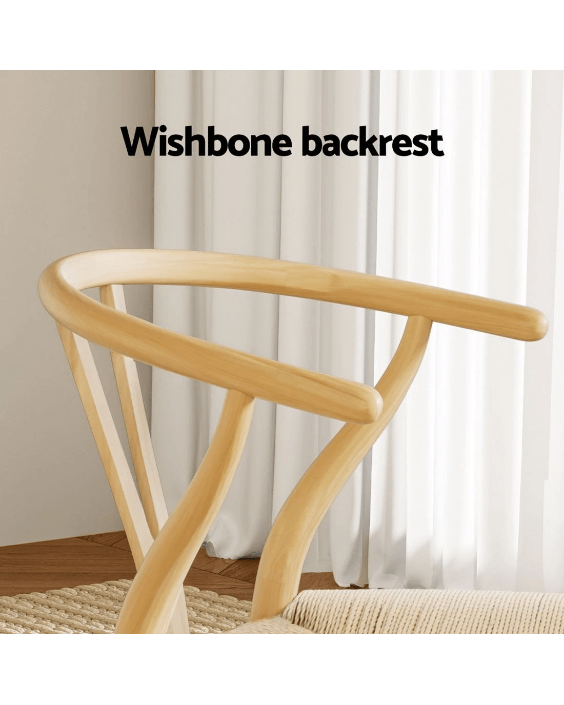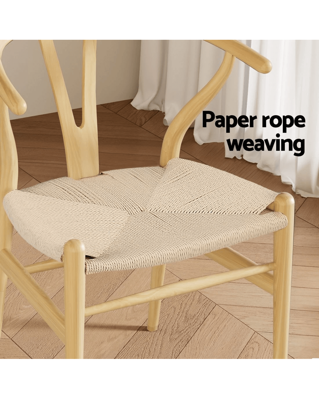 Dine in style with the Artiss Wishbone Dining Chair. Expertly crafted by skilled artisans, this chair features a contemporary silhouette that suits any interior style. The burnished rubberwood frame ensures a strong and durable structure that can withstand daily use, while the kraft paper seat offers a unique and stylish touch. The seat is ergonomically designed to provide maximum comfort, with its curved shape and smooth finish. The backrest features the classic 'wishbone' shape, which provides both form and function, ensuring proper posture and support. The braided seat is designed to be comfortable, elastic and breathable, and has a weight capacity of 120kg. Anti-slip floor protectors keep the chair sturdy and prevent scratches on your floors. The combination of rubberwood and kraft paper makes this chair lightweight, comfortable, and visually appealing. Brighten up your home décor with the Artiss Wishbone Dining Chair today.