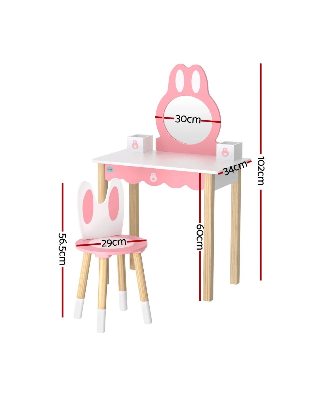Inspire magical play times with Keezi's Bunny Ear Dressing Table Set. Featuring an adorable rabbit-ear silhouette with detachable mirror, this MDF-and-pinewood vanity grows with your child. The 30kg-capacity table pairs with a 50kg-rated stool, both finished in dreamy pink with safety-rounded edges. Easy-to-clean surfaces withstand makeup play, while the pinewood legs ensure lasting stability.