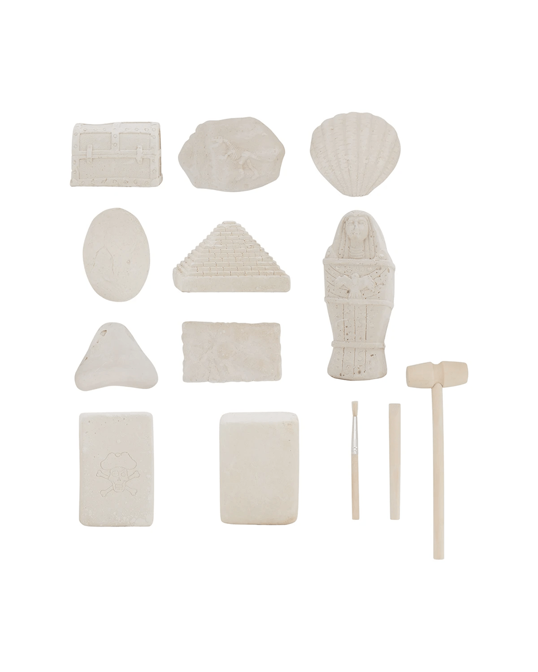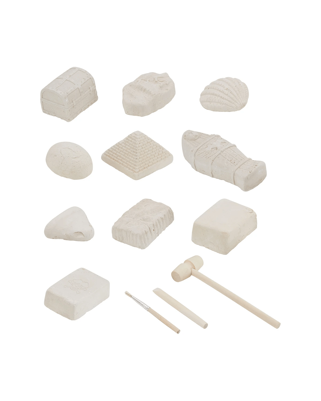 - Includes 10 clay formations, 1 chisel, 1 brush, 1 hammer and instructions