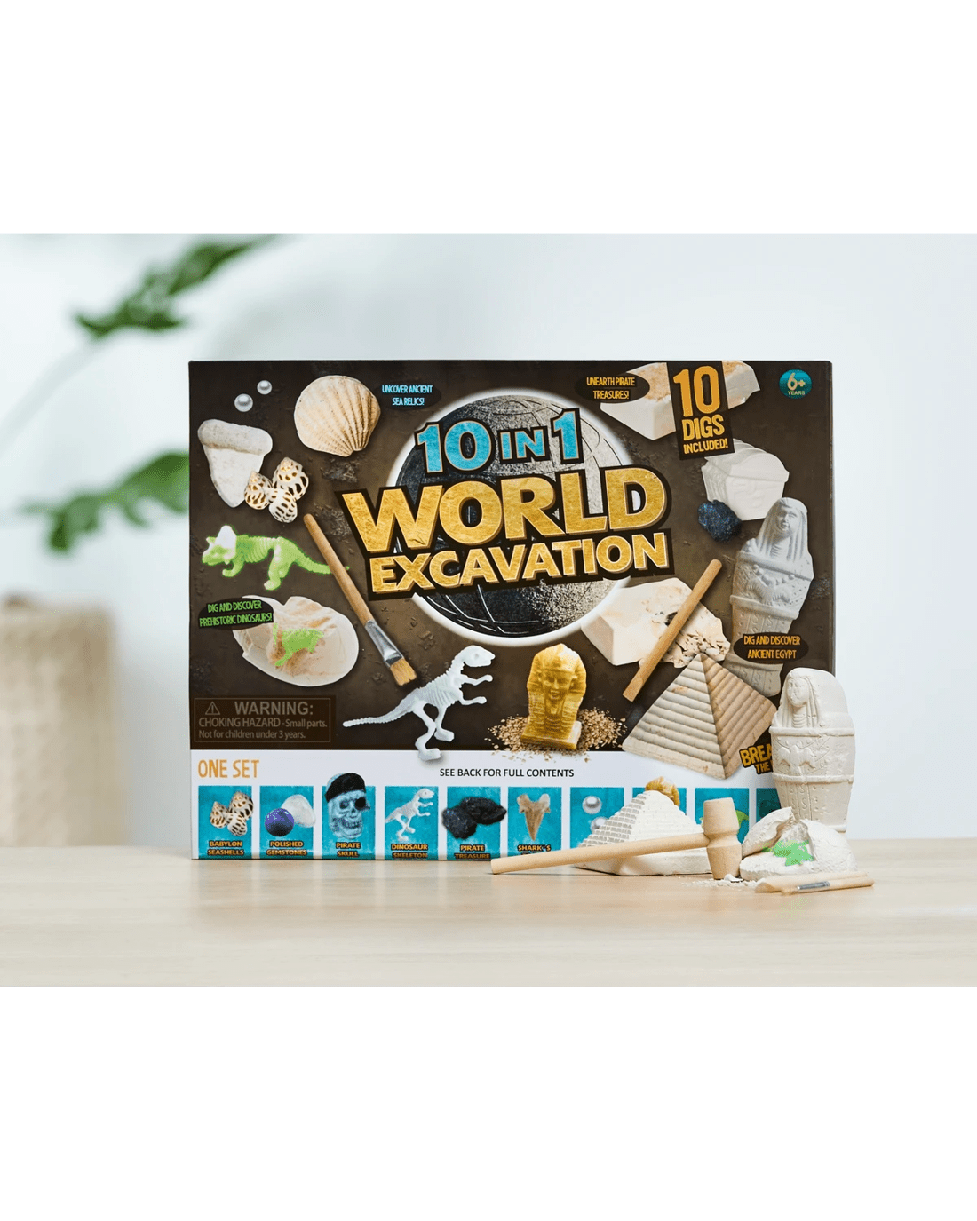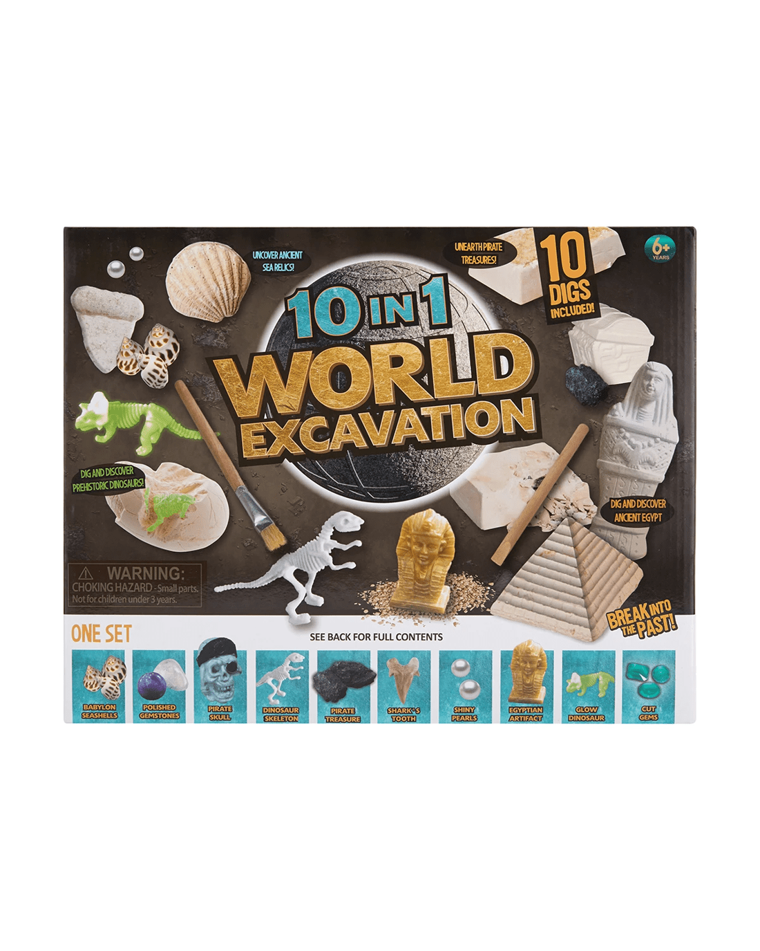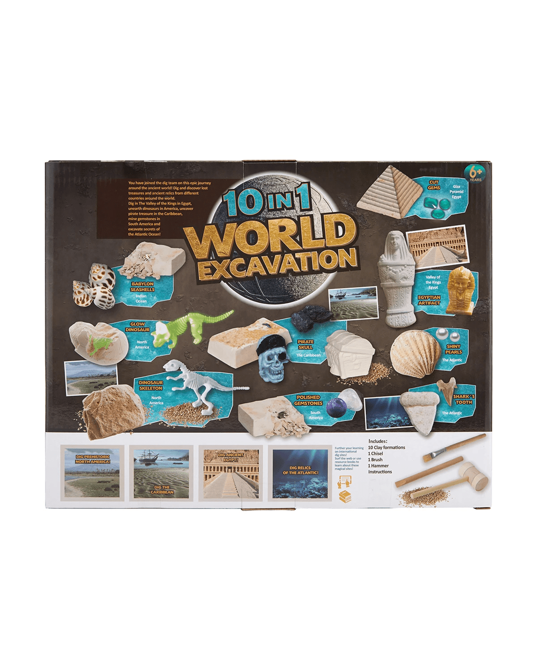 Your young one can dig and discover lost treasures and ancient relics from different continents with this 10 in 1 world excavation kit.