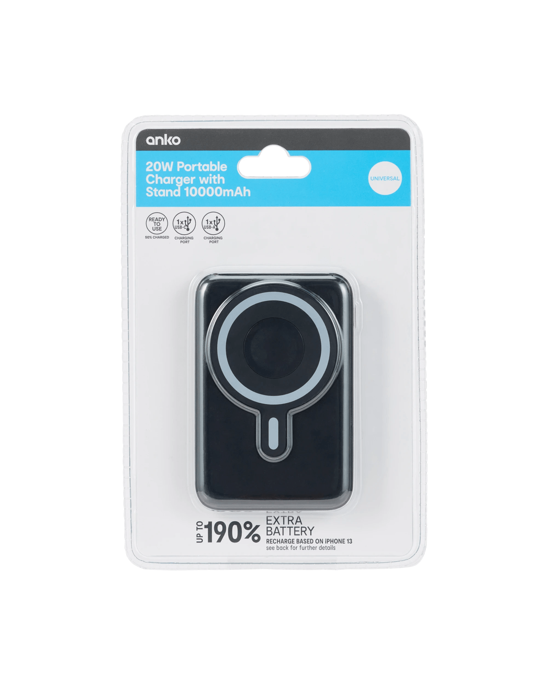 - 10,000mAh battery capacity provides up to 190% recharge based on iPhone 13* (recharge result may vary depending on device and number of USB charging ports used)