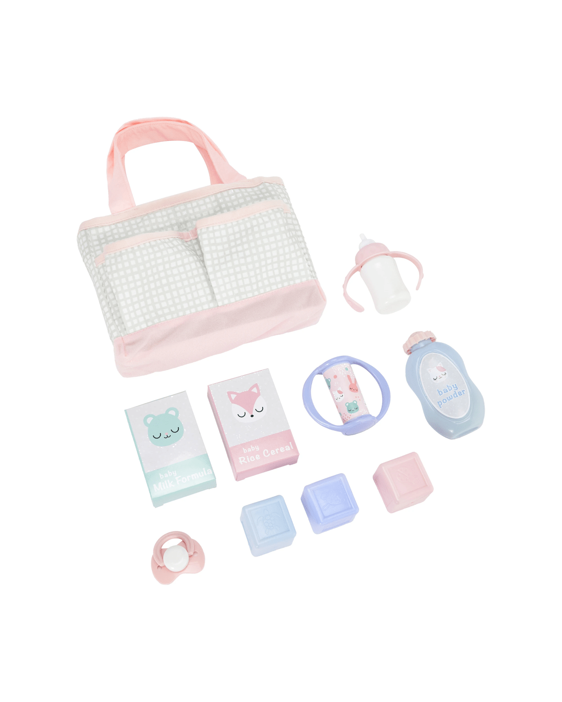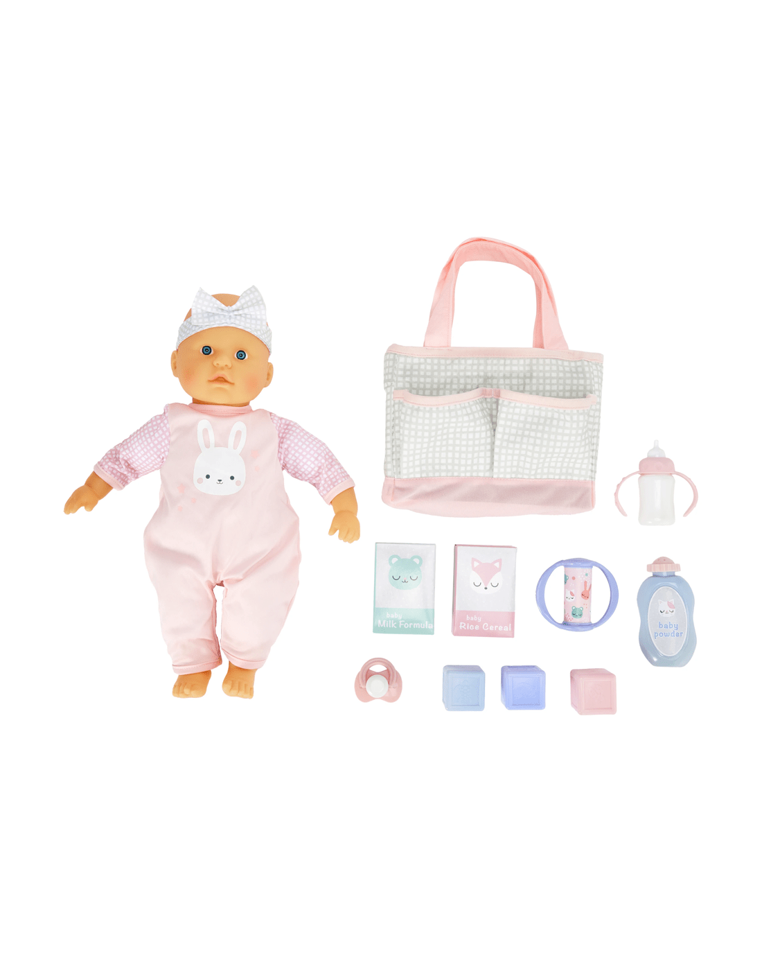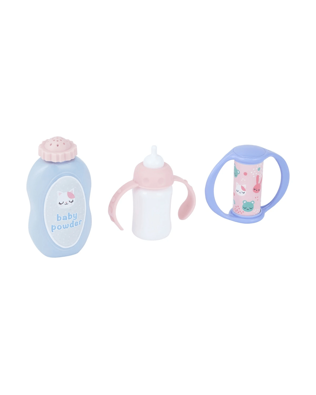 - Includes 1 x doll, 1 x dummy, 1 x milk bottle, 1 x rattle, 1 x baby powder bottle, 1 x carry bag, 2 x paper boxes and 3 x blocks
