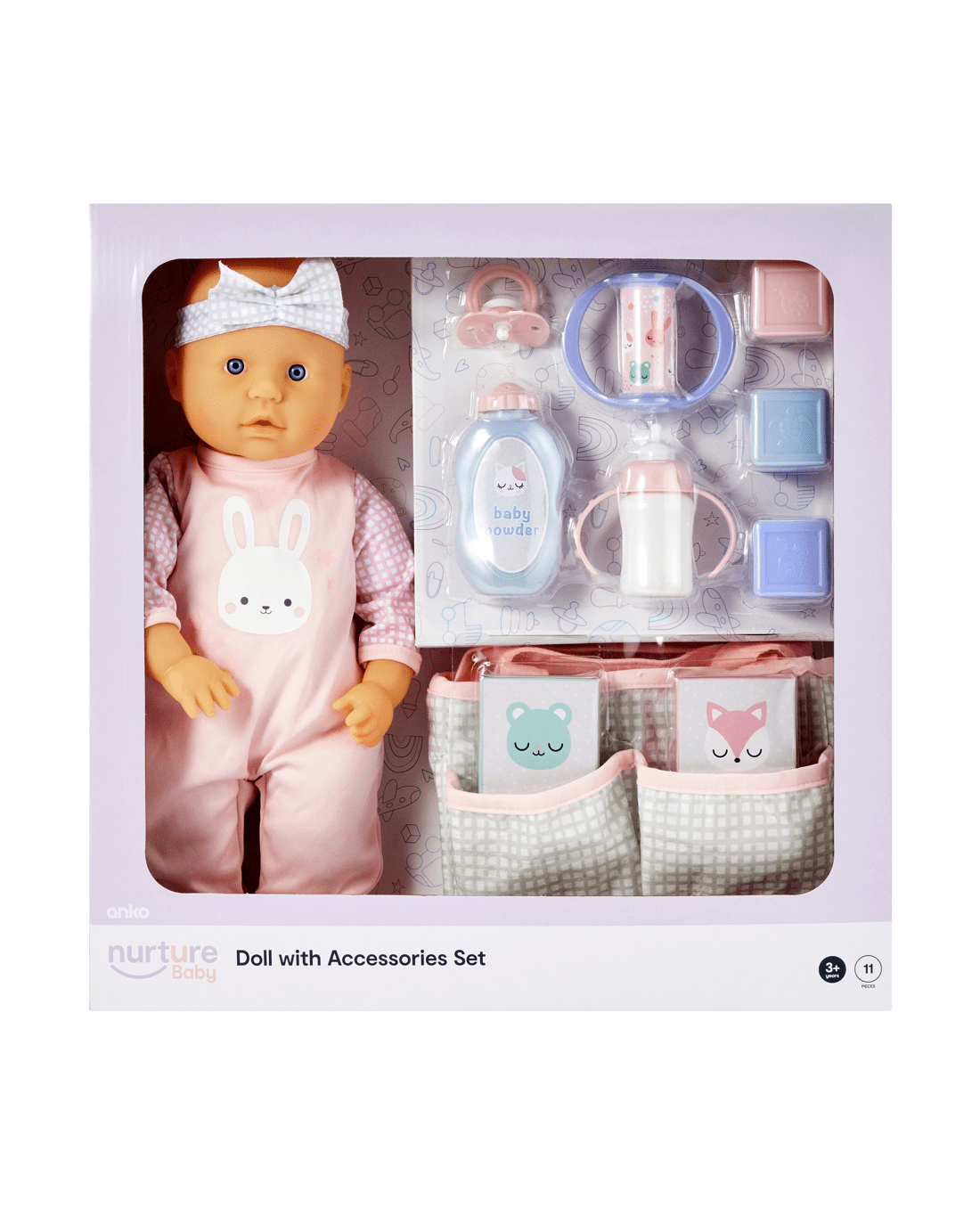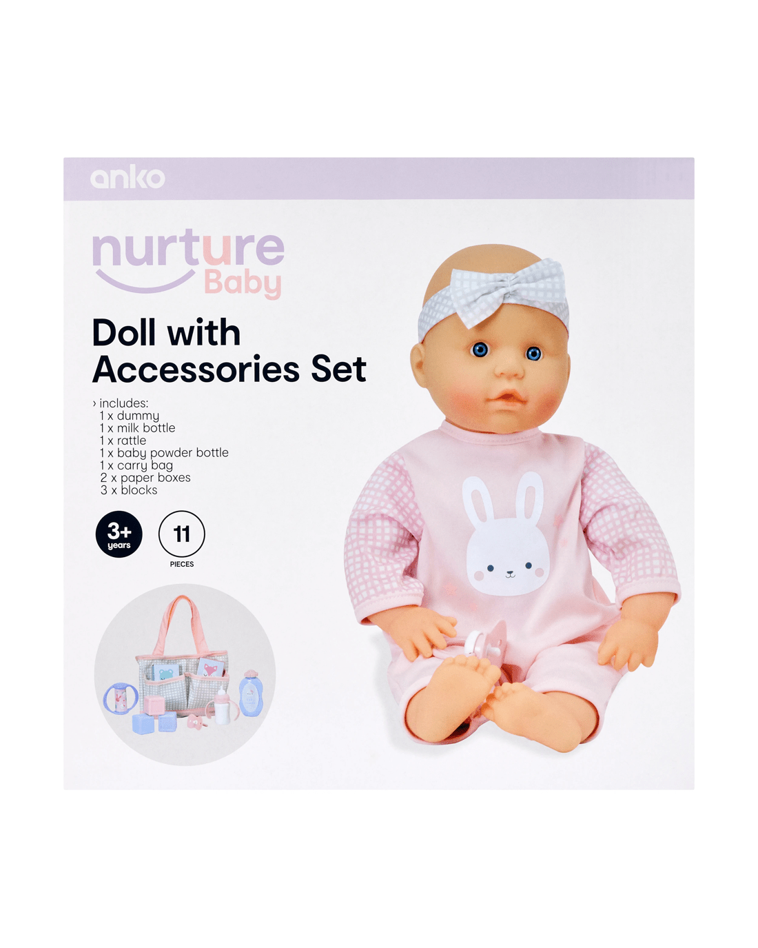 Your little one can pretend to take care of a baby while playing with this 11 Piece Doll with Accessories Set.