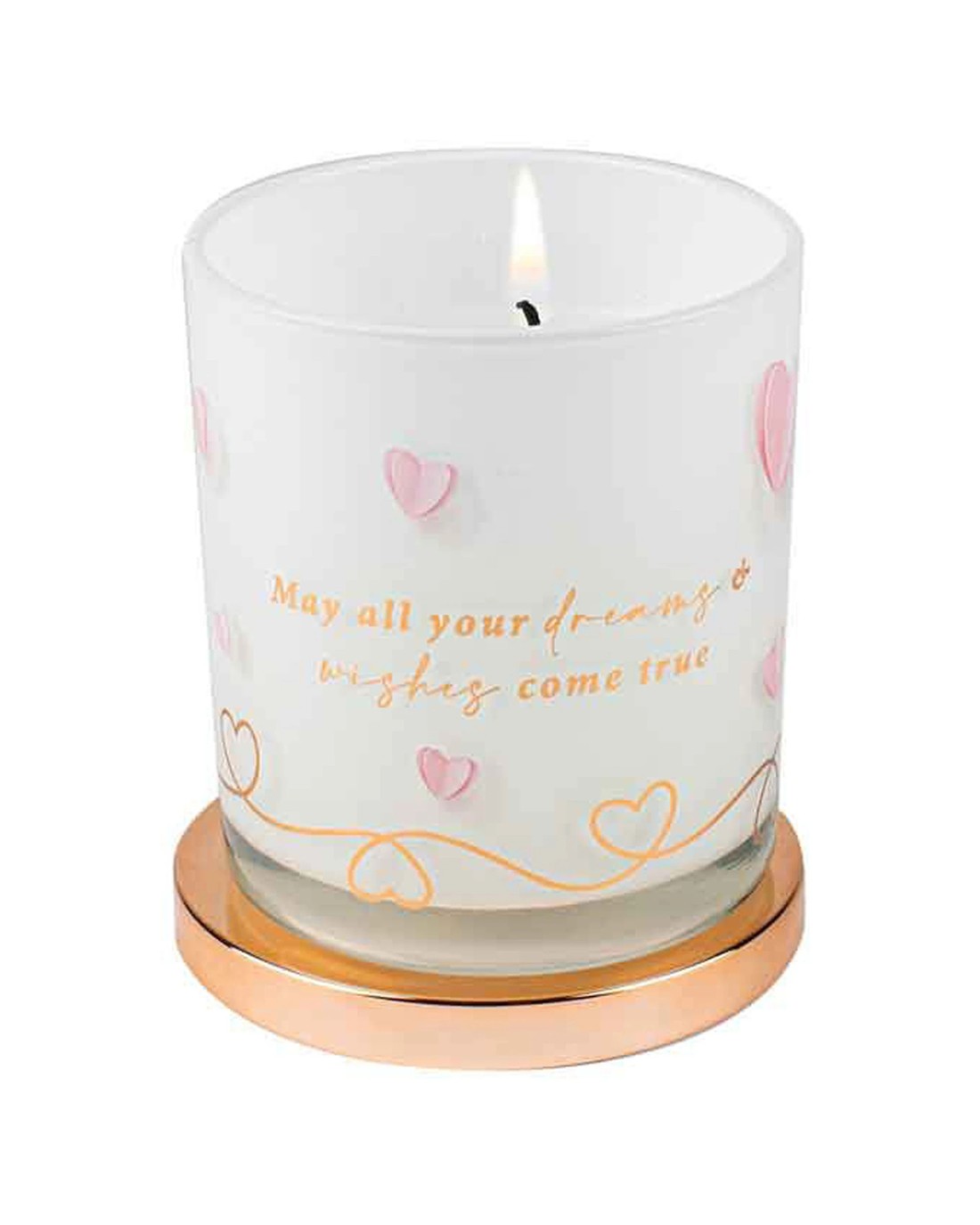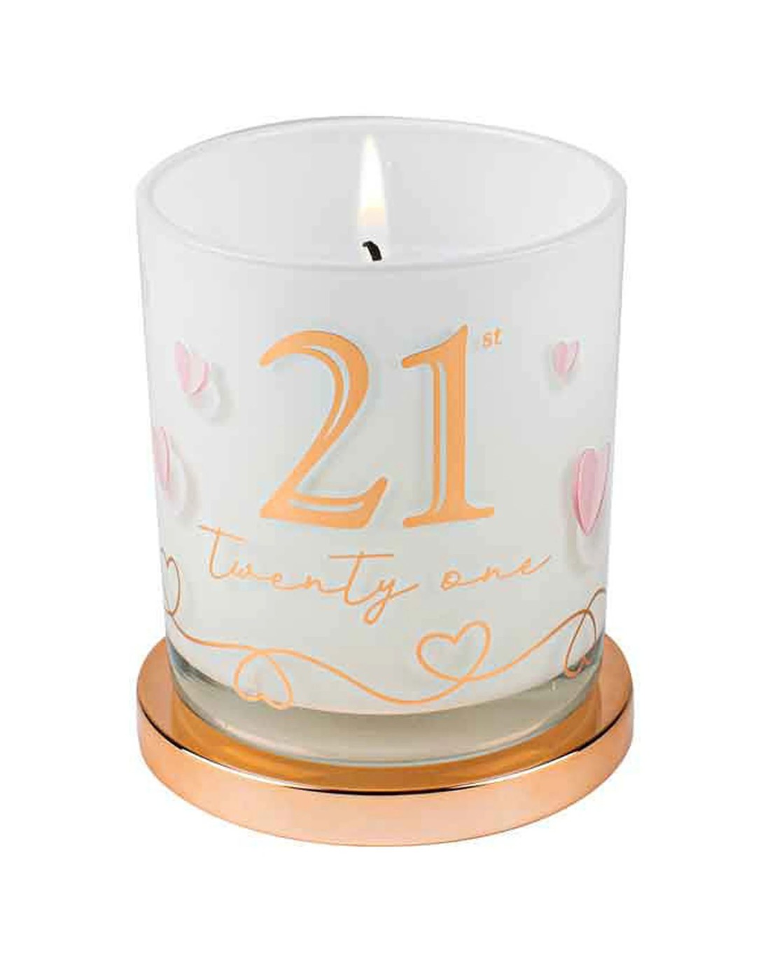 The LMD 21st Birthday Party Candle is designed for celebrating a milestone birthday with style and elegance. This decorative candle features a white wax interior in a clear glass container, adorned with pink and orange design elements including the number 21 and small heart motifs, sitting on a rose gold-toned round base. Its charming appearance makes it a perfect centrepiece or gift for the special occasion.