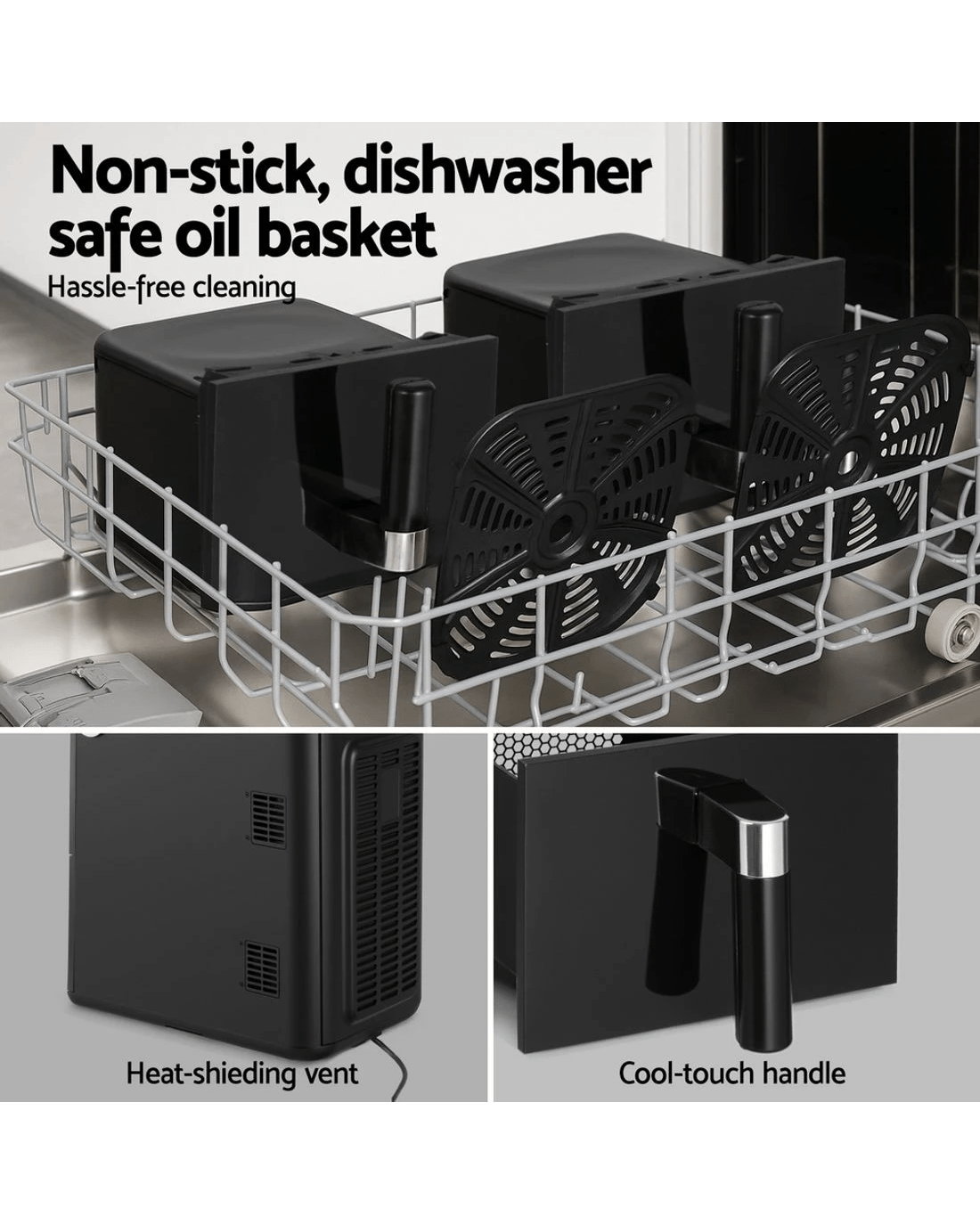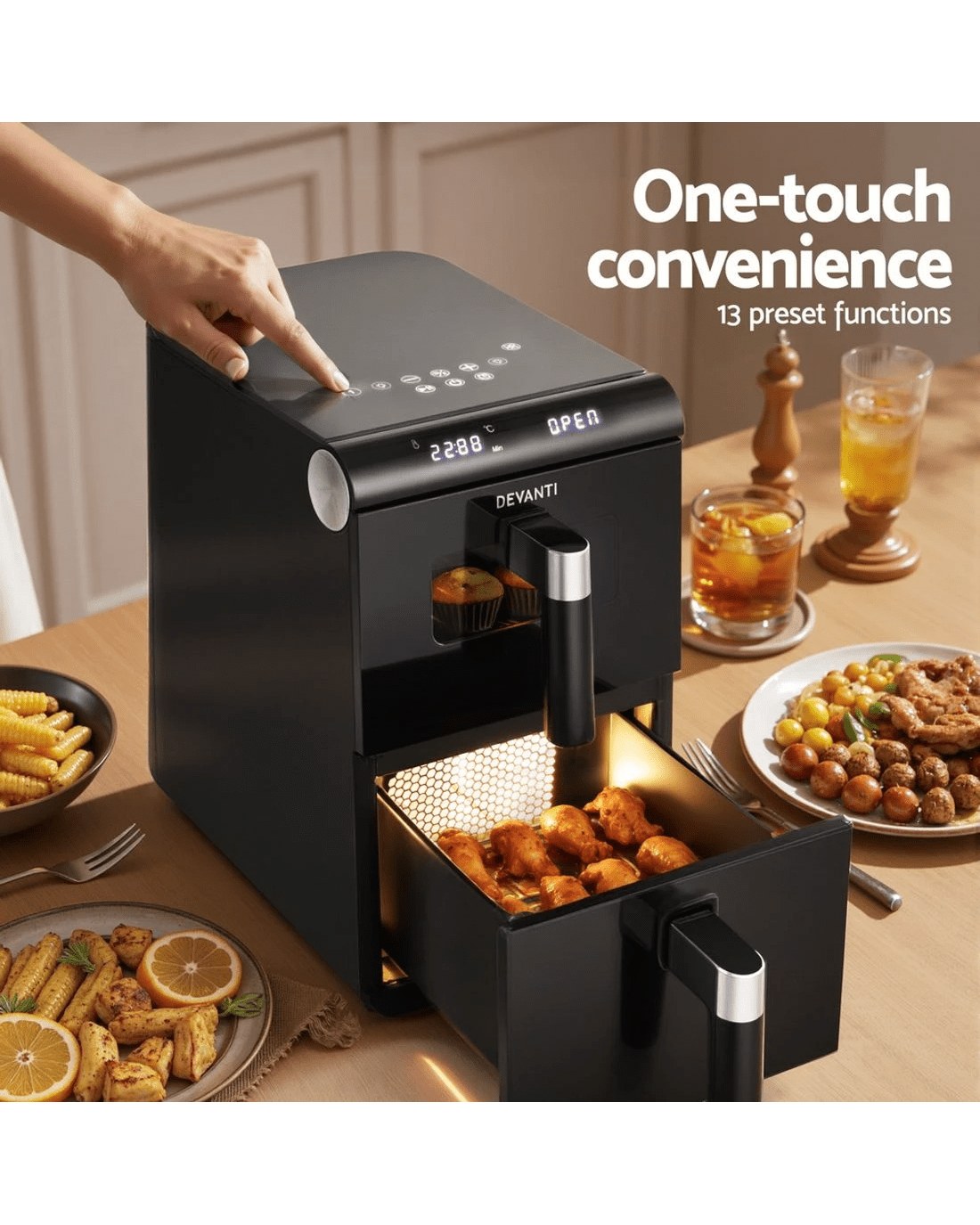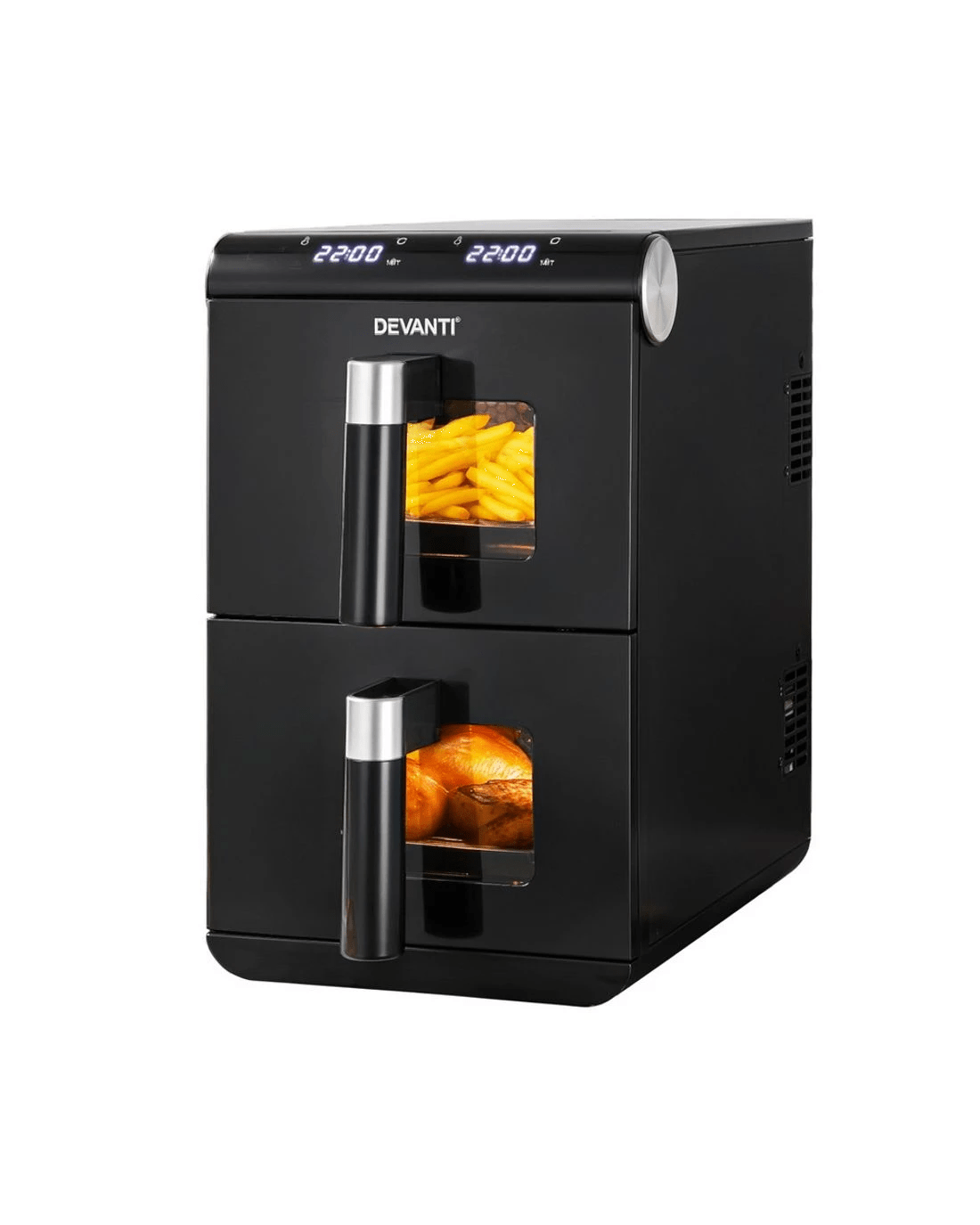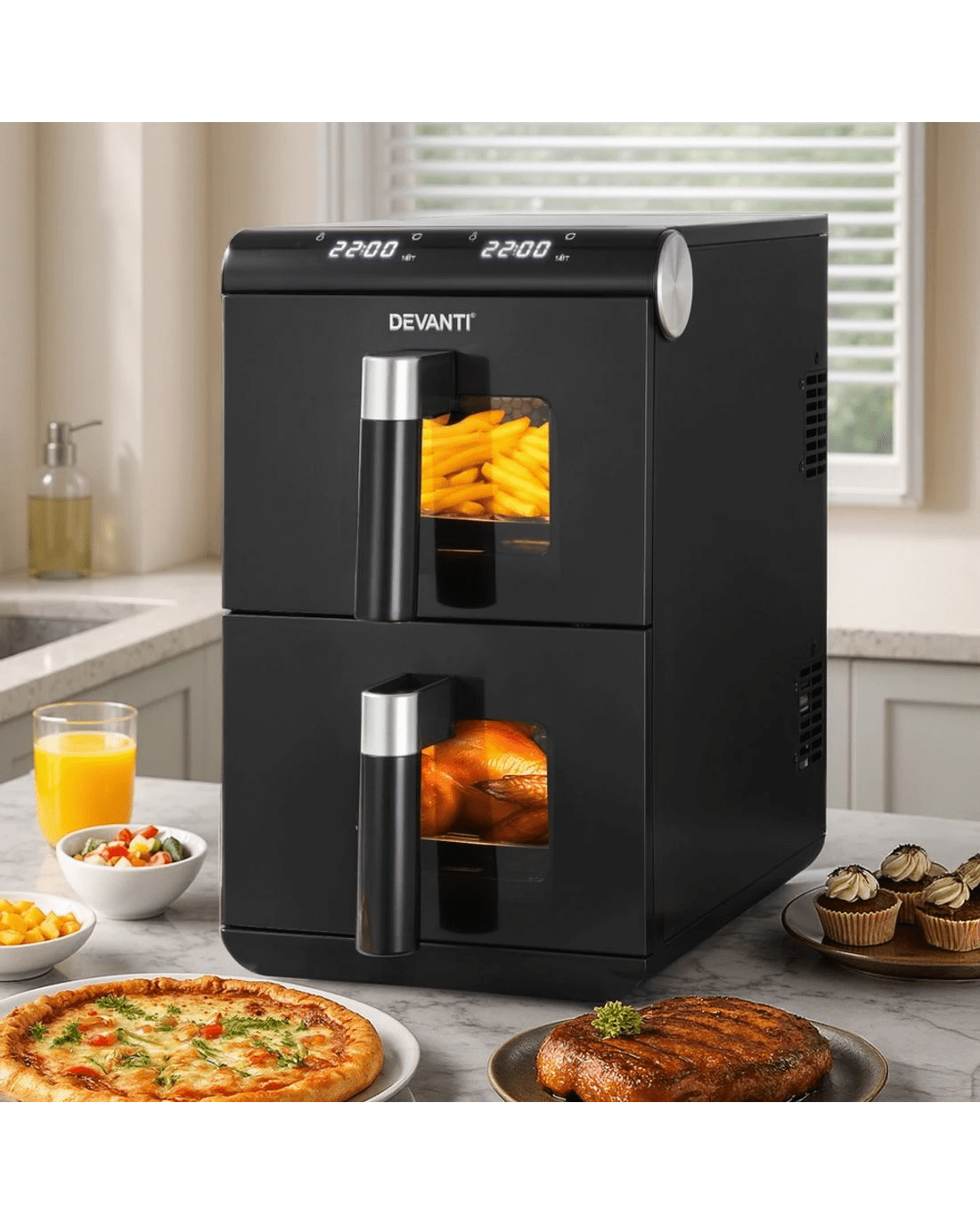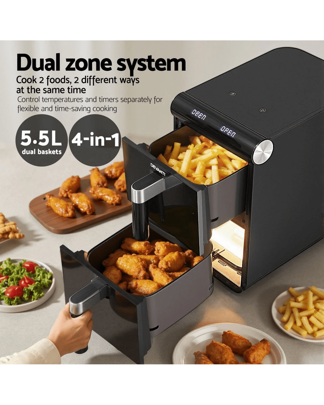 This 11L large-capacity dual-zone air fryer features two independent 5.5L baskets, allowing you to cook different foods simultaneously without flavor transfer! Fry chips, roast wings, reheat pizza, or dehydrate fruits—separate temperature control saves time and meets the whole family's diverse needs.The best part is that the Devanti air fryer heats food at all directions and most of the ingredients do not need any oil.