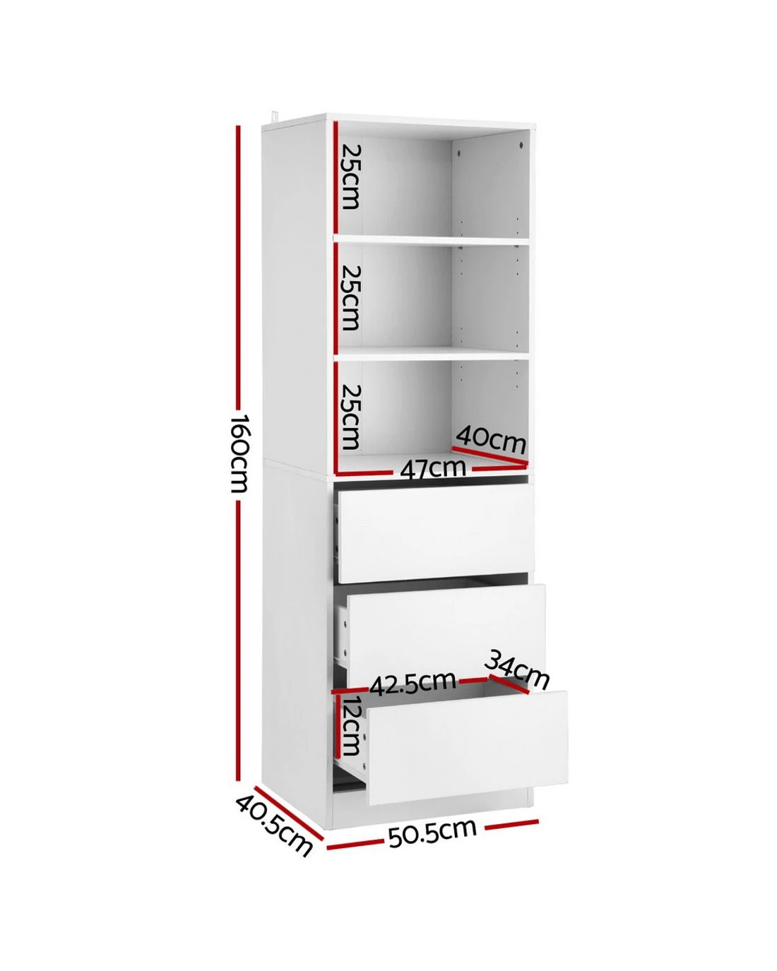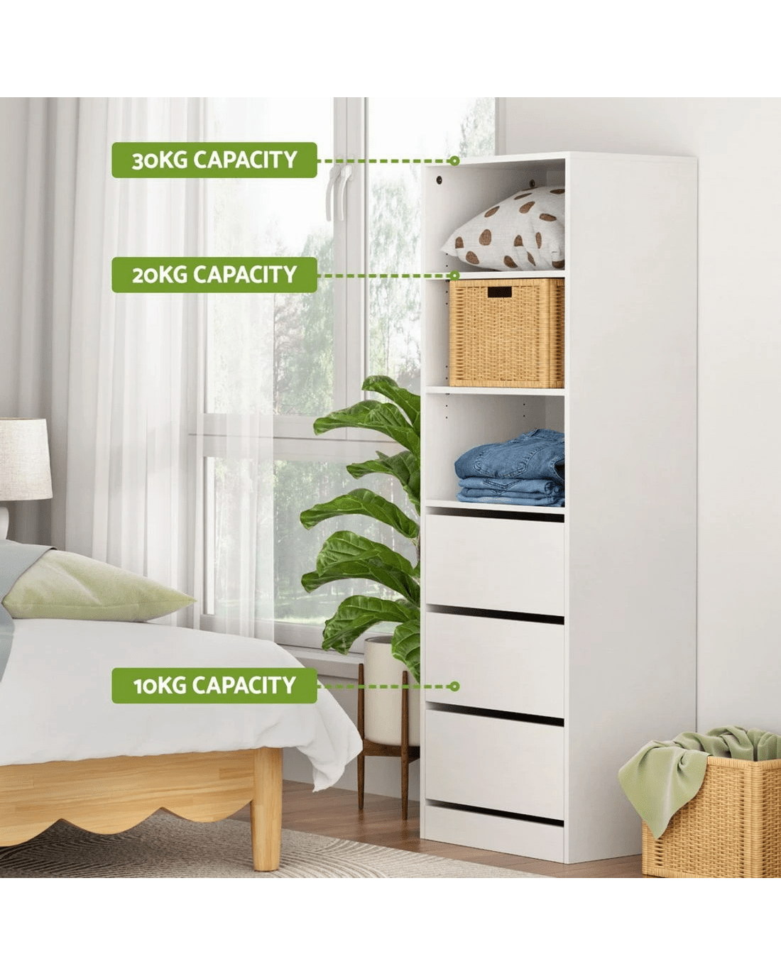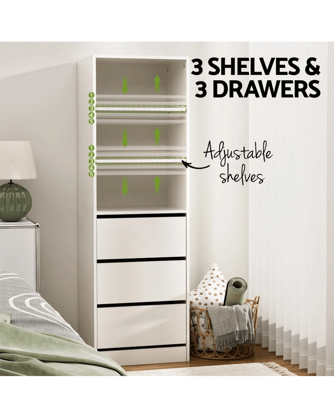 Artiss Chest of Drawers – A modern dresser tallboy with 3 adjustable shelves & 3 smooth-gliding drawers. Designed as a versatile storage cabinet, it features a handle-free design, wall attachment for stability, and high weight capacity for heavy loads. Perfect for storing clothing, linens, or accessories in bedrooms or hallways. Easy to assemble and easy to clean, ideal for Australian homes.