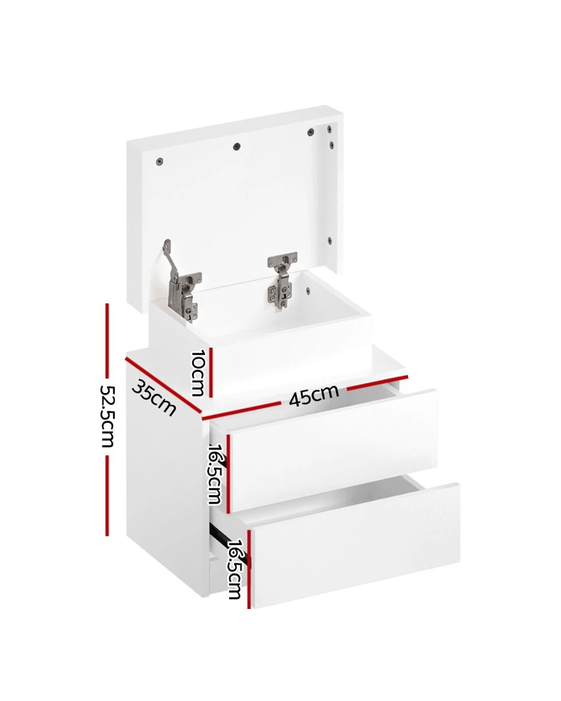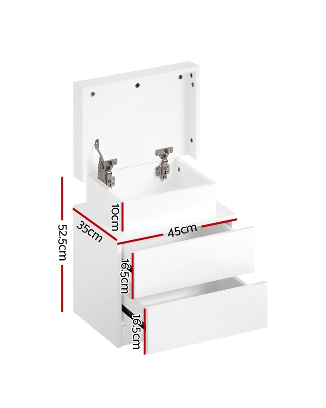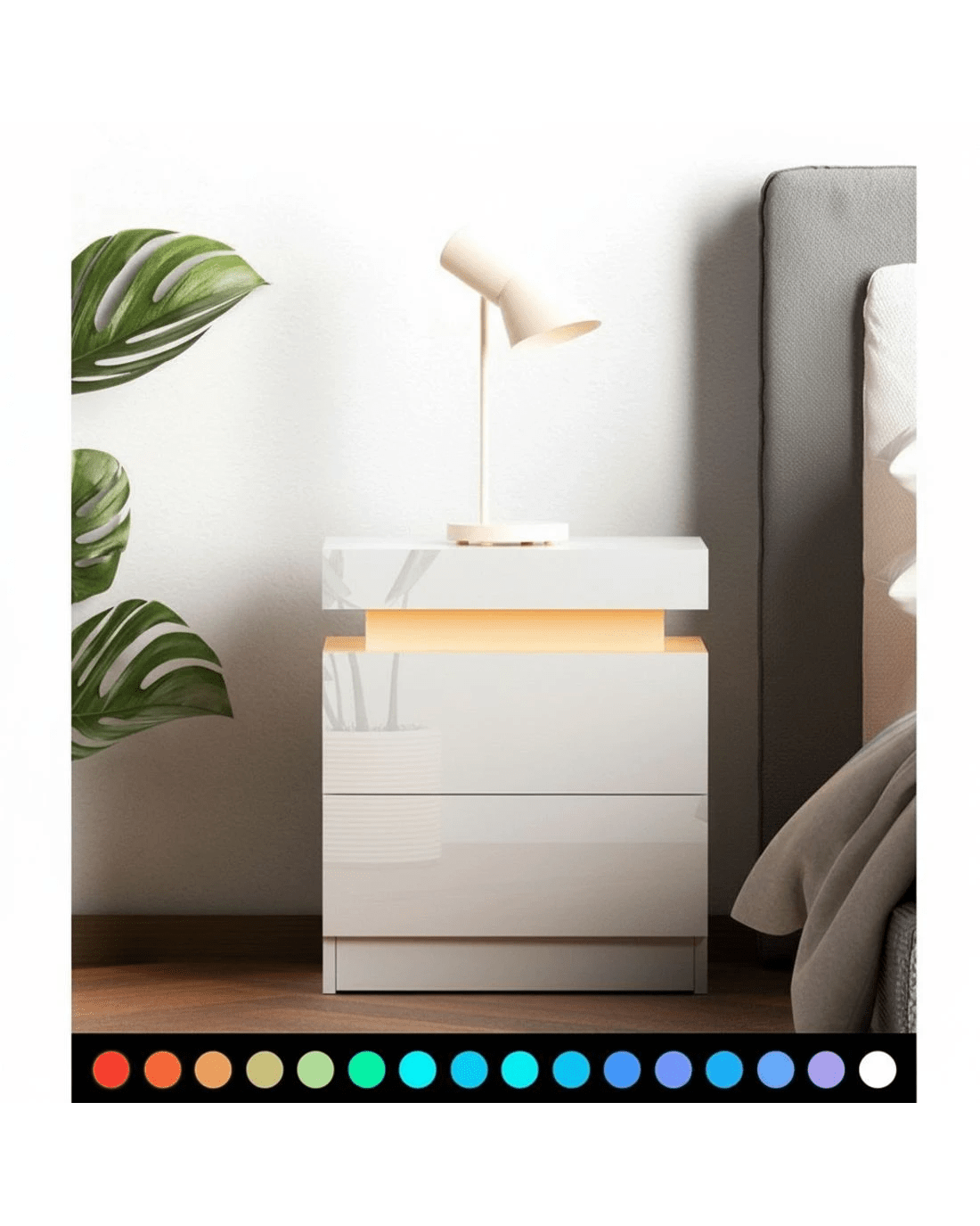 Tired of fumbling in the dark for a light switch in the middle of the night? With our Artiss LED Bedside Table, your problems are solved. The bedside table comes with built-in LED lighting that can be customised into 16 different colours to suit your preference. Not only will it create a beautiful ambience, it will also save you from buying extra bedside lamps or nightlights. Two deep drawers sliding on smooth anti-rust runners provide ample storage space. There is also a top storage compartment that opens with a lift-up lid like a treasure trunk, which you can fittingly fill with your own personal treasures. Better still, the handle-free design gives it a modern vibe that stands out from the mundane. Constructed from quality particle board and MDF with melamine finish and UV high-gloss front, the bedside table is durable and easy to maintain. And it will be the perfect addition to your modern bedroom with its contemporary and linear design. Or you can keep one in the living room to wow all your houseguests.