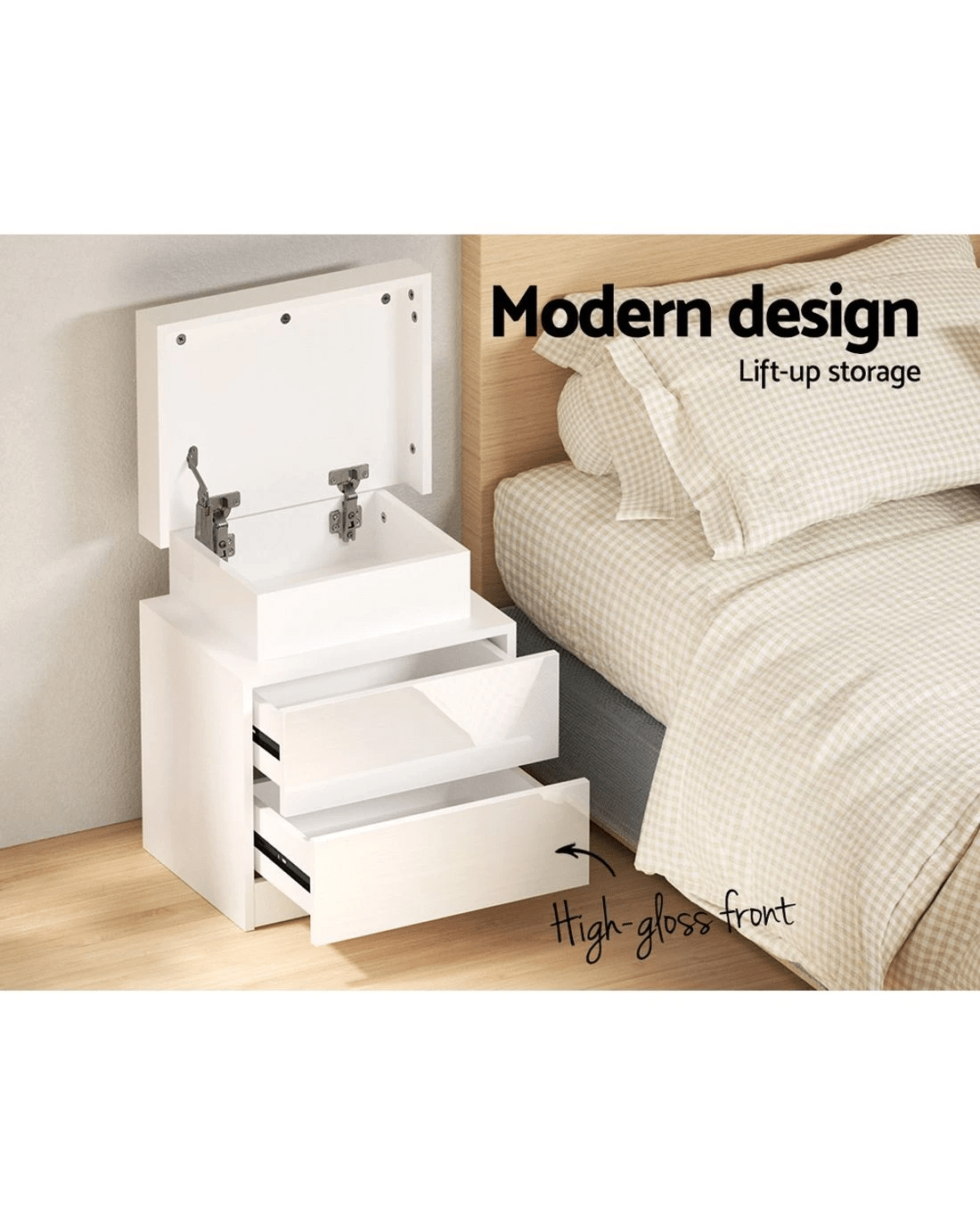 Sold by Aisle SixArtiss Bedside Table Led 2 Drawers Lift-up Storage Led Lighting Remote Control Bedroom Furniture Easy Assembly - White