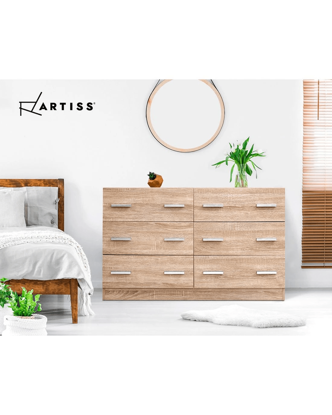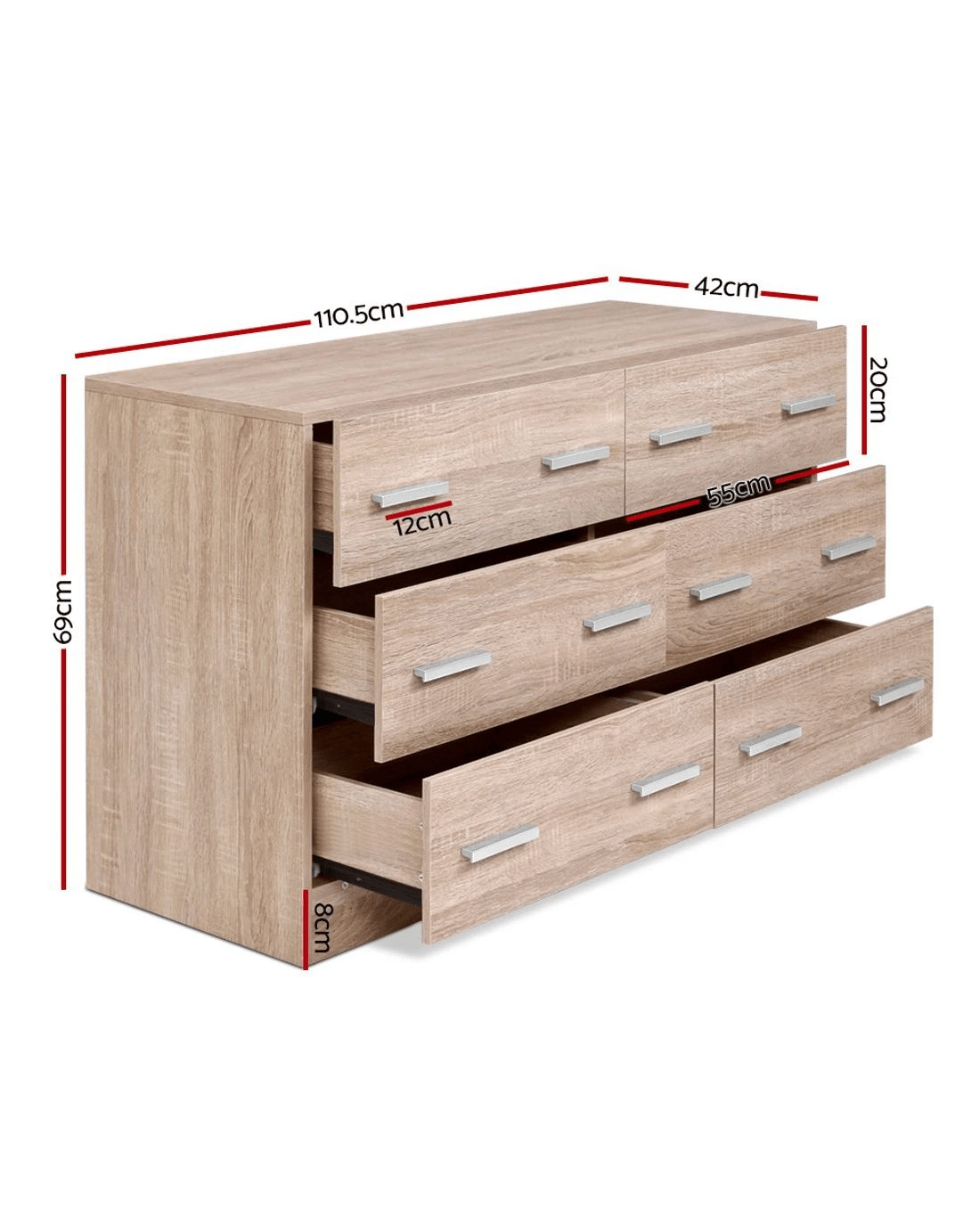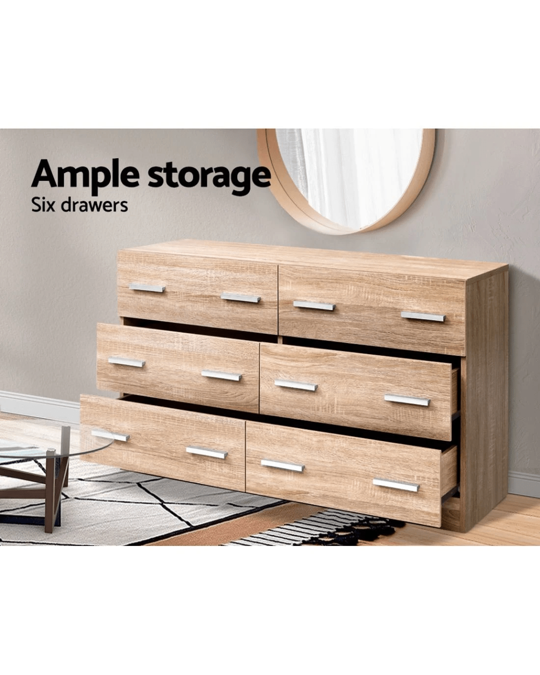 Practical and handsome, our Artiss 6-drawer Lowboy is perfect for those looking for extra storage space for your home. Contemporary and simply designed, this beauty features a flawless melamine finish with elegant handles that will easily match your home decor. Made with premium 15mm thick particle board with anti-rust coated drawer runners, our lowboy works ever so smoothly with minimum hassle. Not least, it provides plenty of storage space with six generous-sized drawers for all your clothing, fashion essentials and more.