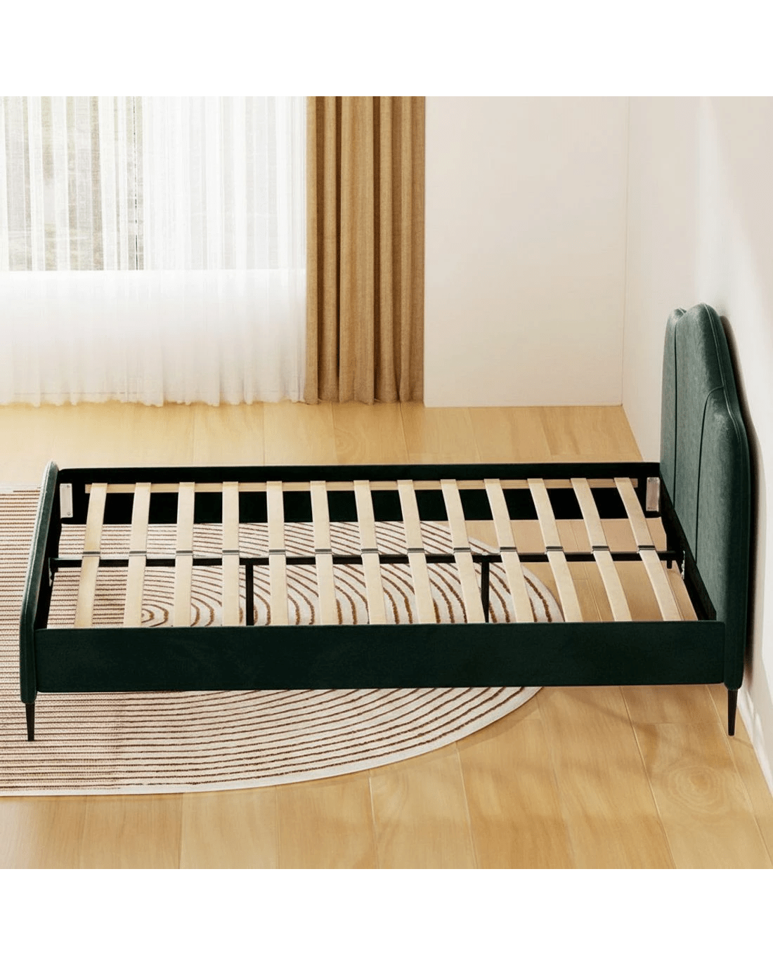 Take restful nights to a new level with the Olan bed frame. Constructed with solid hardwood with sturdy slats, this frame provides ample support, giving you peace of mind as you drift off to dreamland. Upholstered in premium dark green velvet fabric, it offers comfort in style. Sleep soundly, feel cozy, and look fabulous with the Olan bed frame!