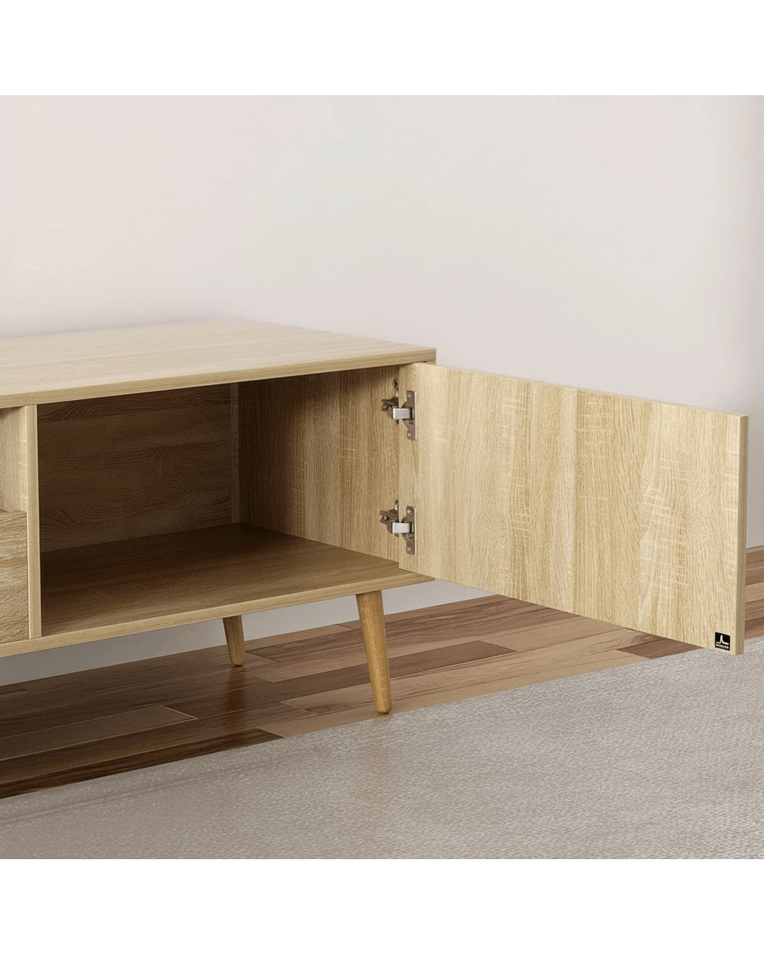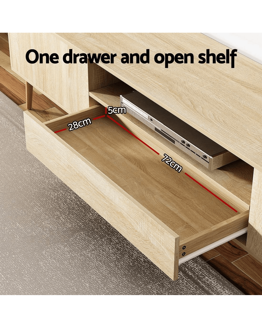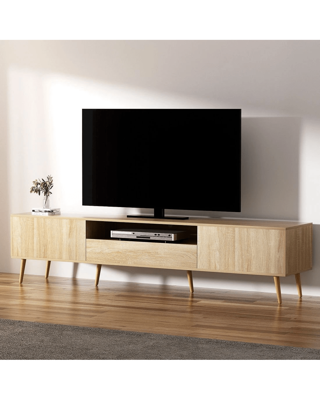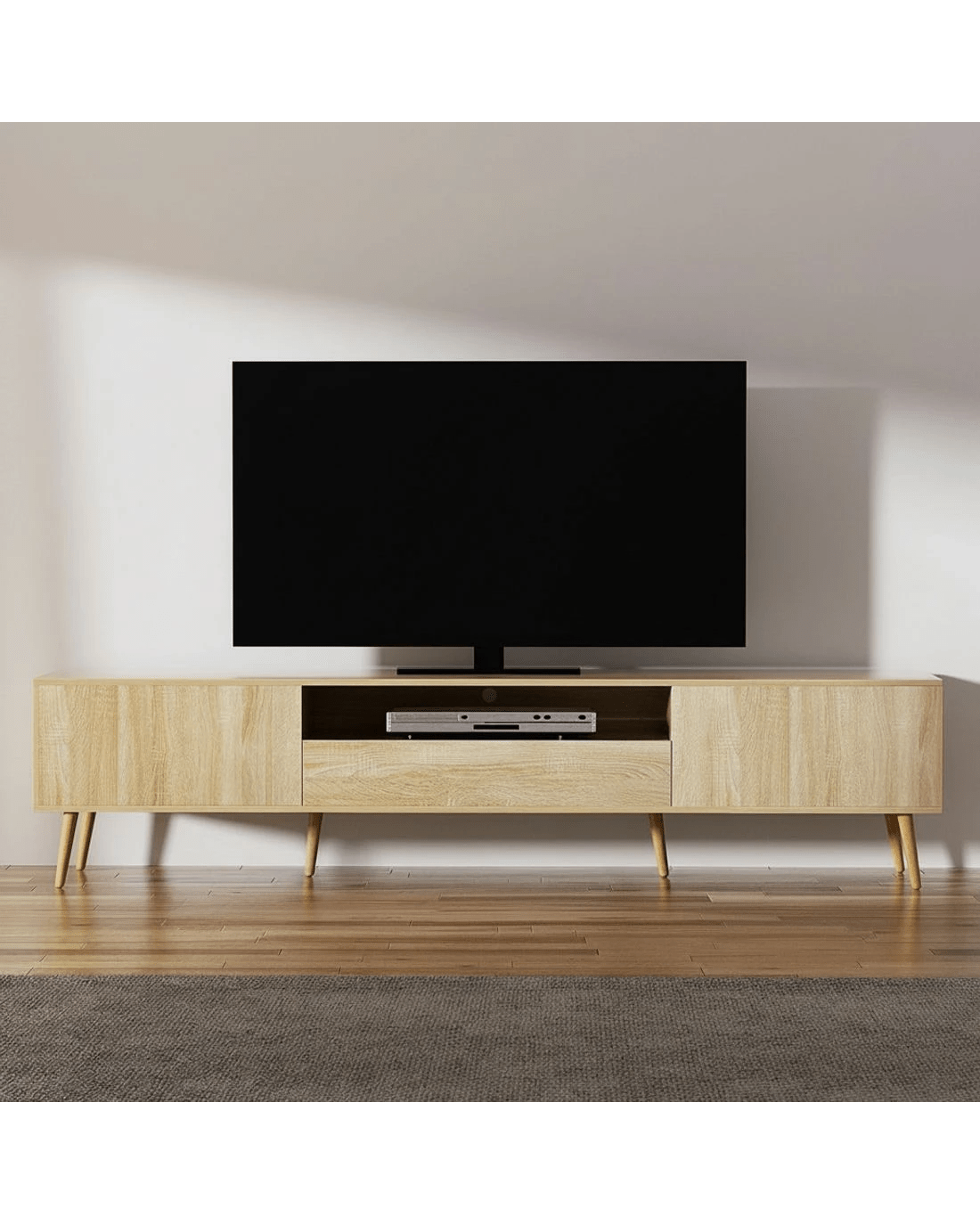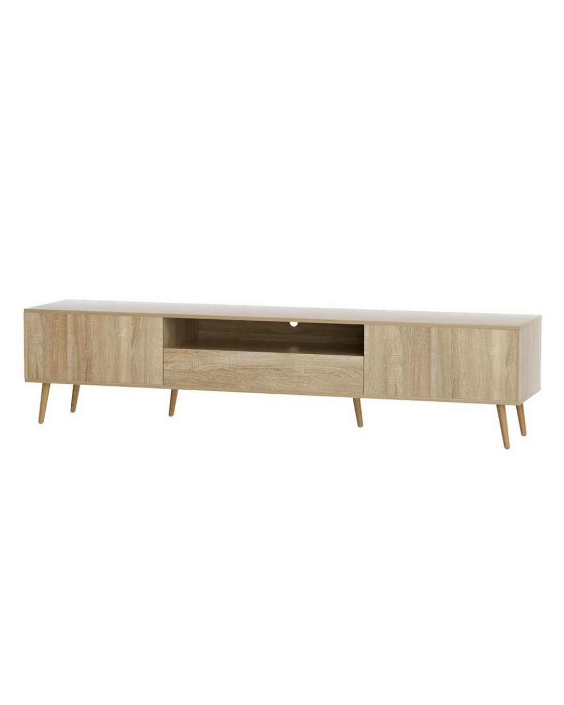 Style and functionality blend together in the beautiful Alex Entertainment Unit from Artiss. This lowline entertainment unit has the perfect height and storage capacity for all your entertainment needs, from your television to your sound system and consoles. The simple handle-less design and natural wood-grain finish will blend in perfectly with modern homes. Made from thick particleboard with a smooth melamine finish and solid rubberwood, the unit is sturdy and durable for long-lasting use. Two storage cabinets, one spacious drawer and an open shelf with cable management are perfect for your media, books, equipment and other trinkets. The solid rubberwood legs feature anti-slip feet to ensure the unit stays standing and prevents scratches to your floors. Easy to assemble and even easier to maintain, the Alex Entertainment Unit will keep your home theatre organised for years to come.