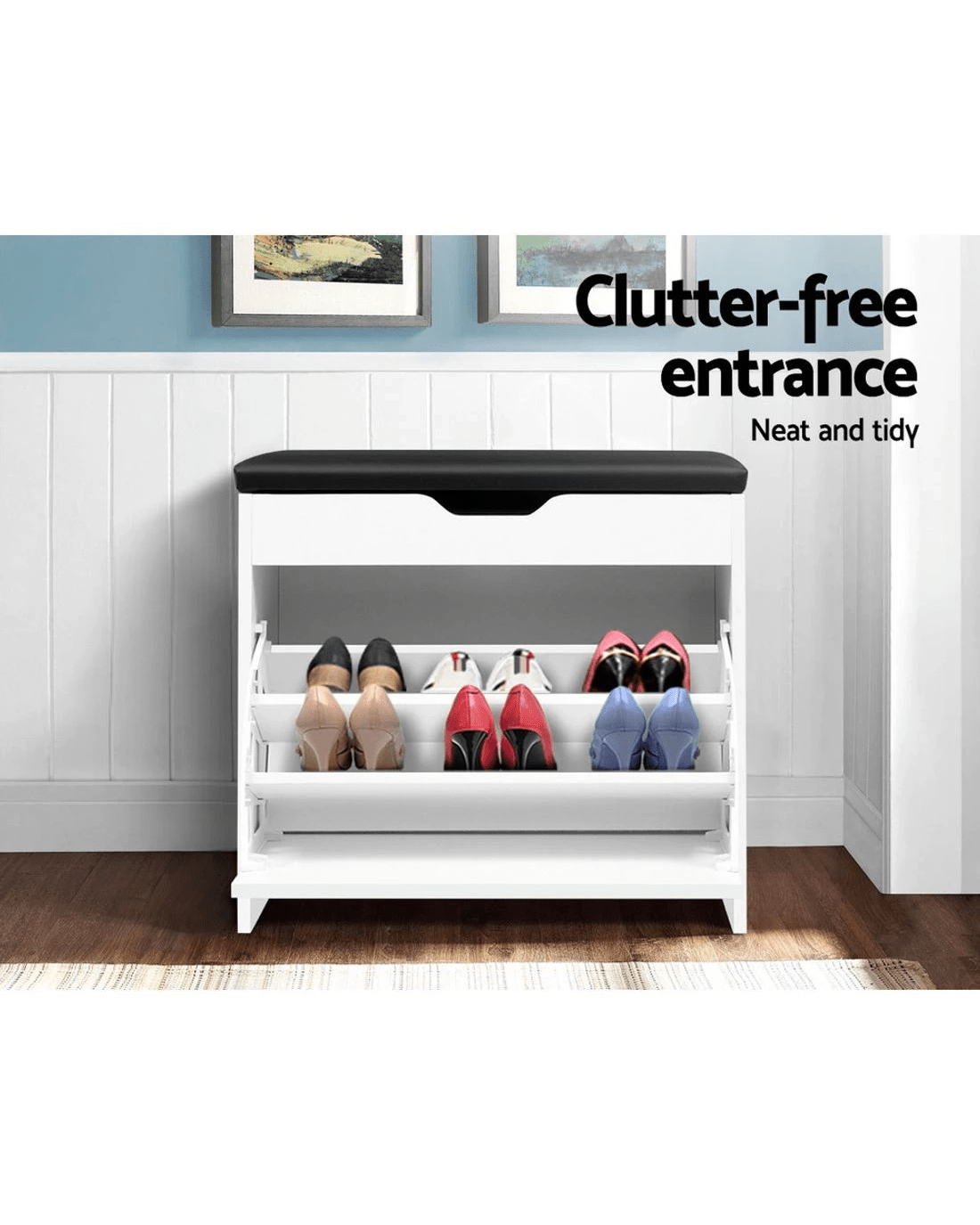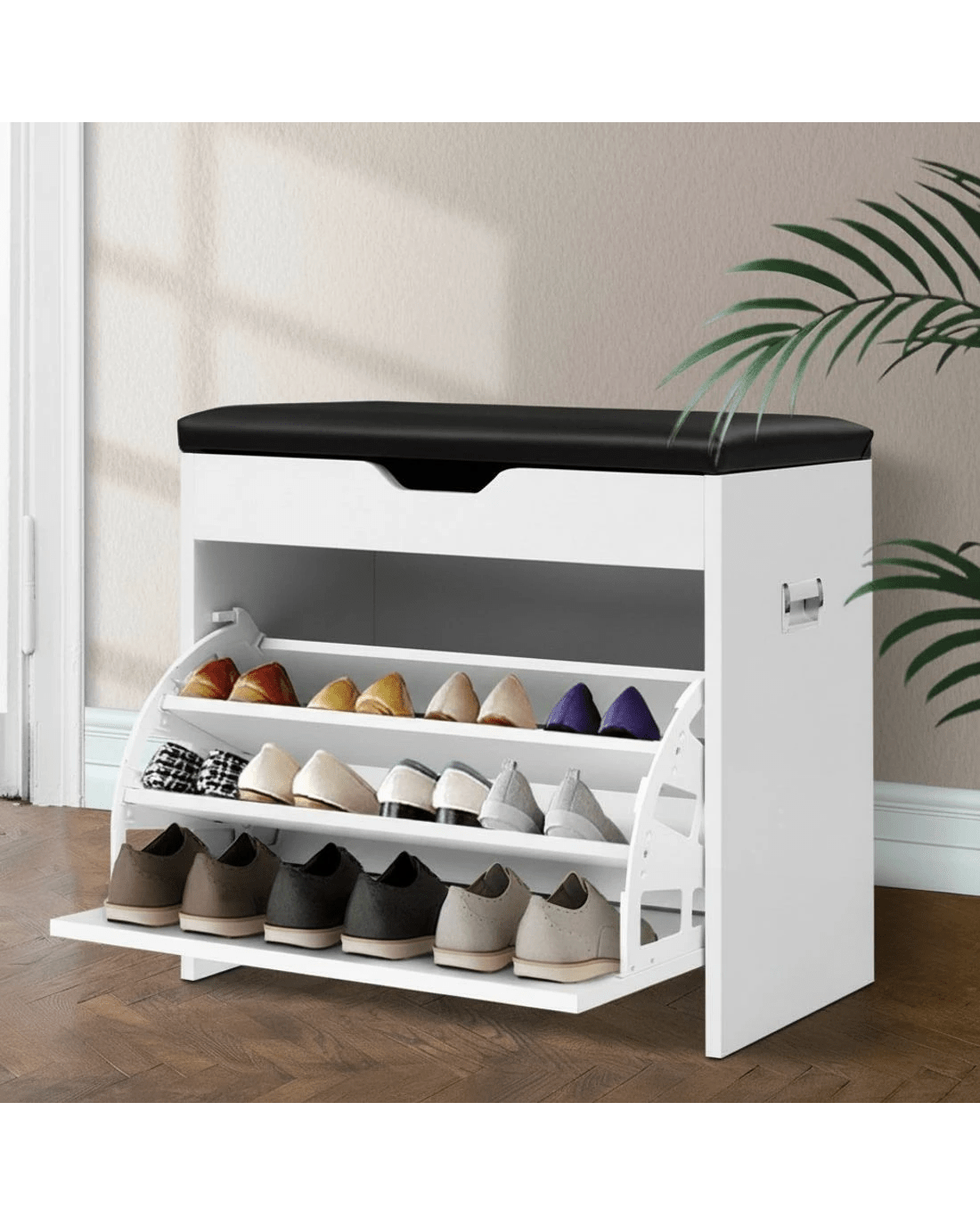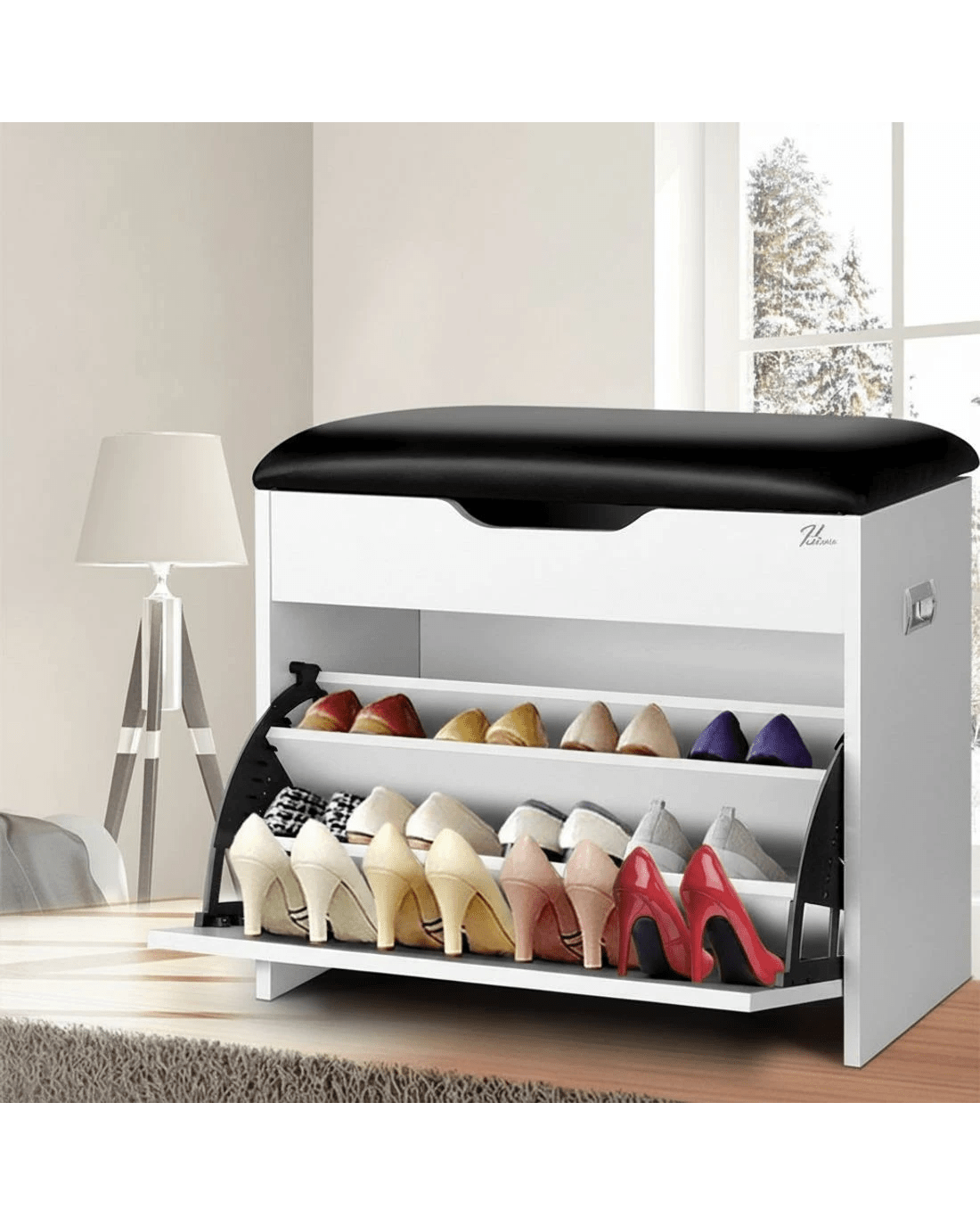 Get yourself a shoe cabinet with an aesthetic difference. Our Artiss Shoe Cabinet Bench adds a touch of luxury and multi-functionality to the ubiquitous shoe cabinet. On first impression, it looks just like a plush PU leather stool. Pull down the front panel and you find three tiers of adjustable shoe shelves with ample space for up to 15 pairs of various footwear. There is also a closed storage compartment hidden under the seat, with cut-out handles for easy opening. Made from quality particle board, the bench is sturdy and finished in melamine for durability and easy maintenance. Not least, its thoughtful design means that you can place it in your hallway or entrance for a neat and tidy look that blends seamlessly with your home decor. So remove the clutter and get organised with our shoe cabinet bench. We are sure it will feet right in with your discerning taste for all things stylish and chic.