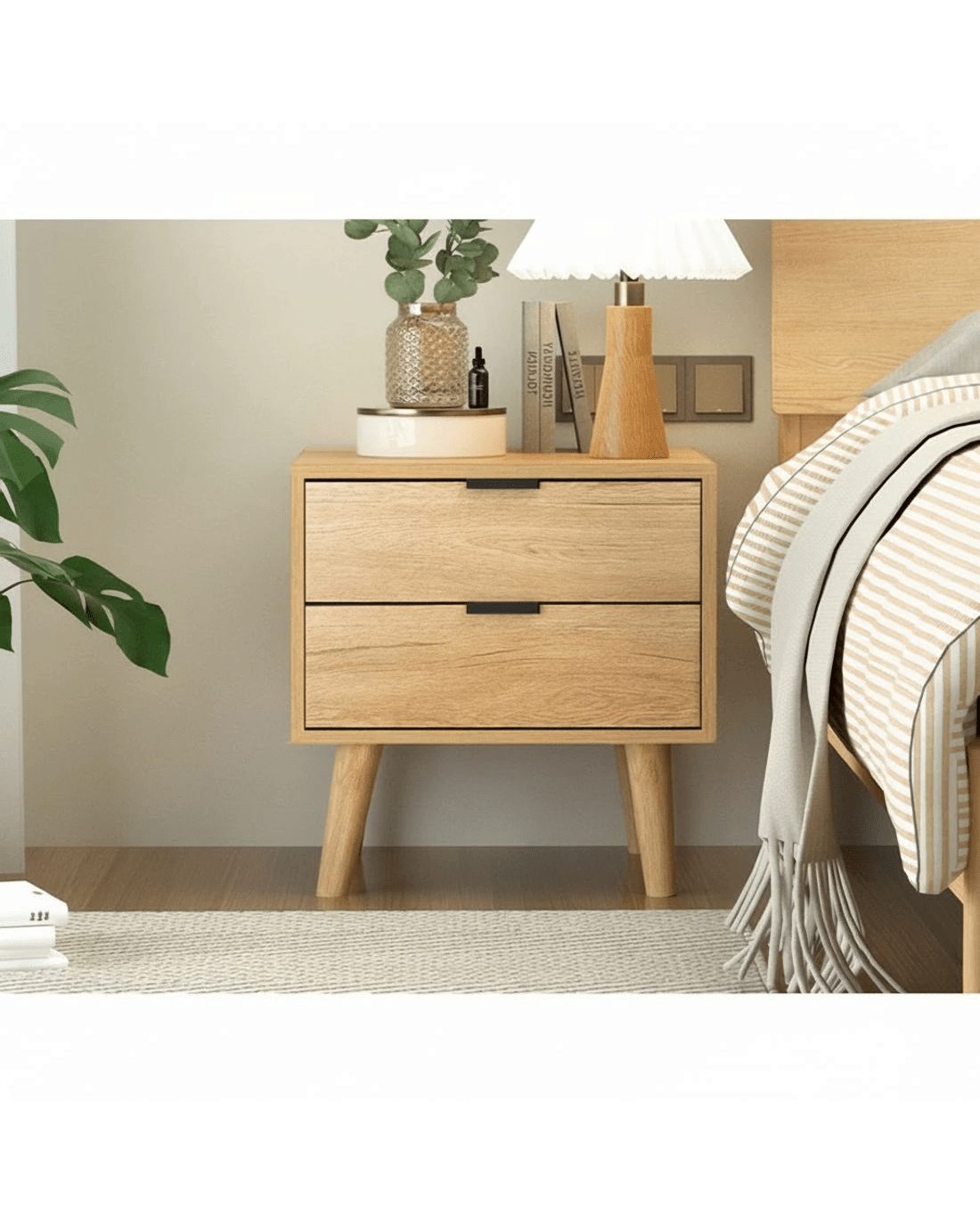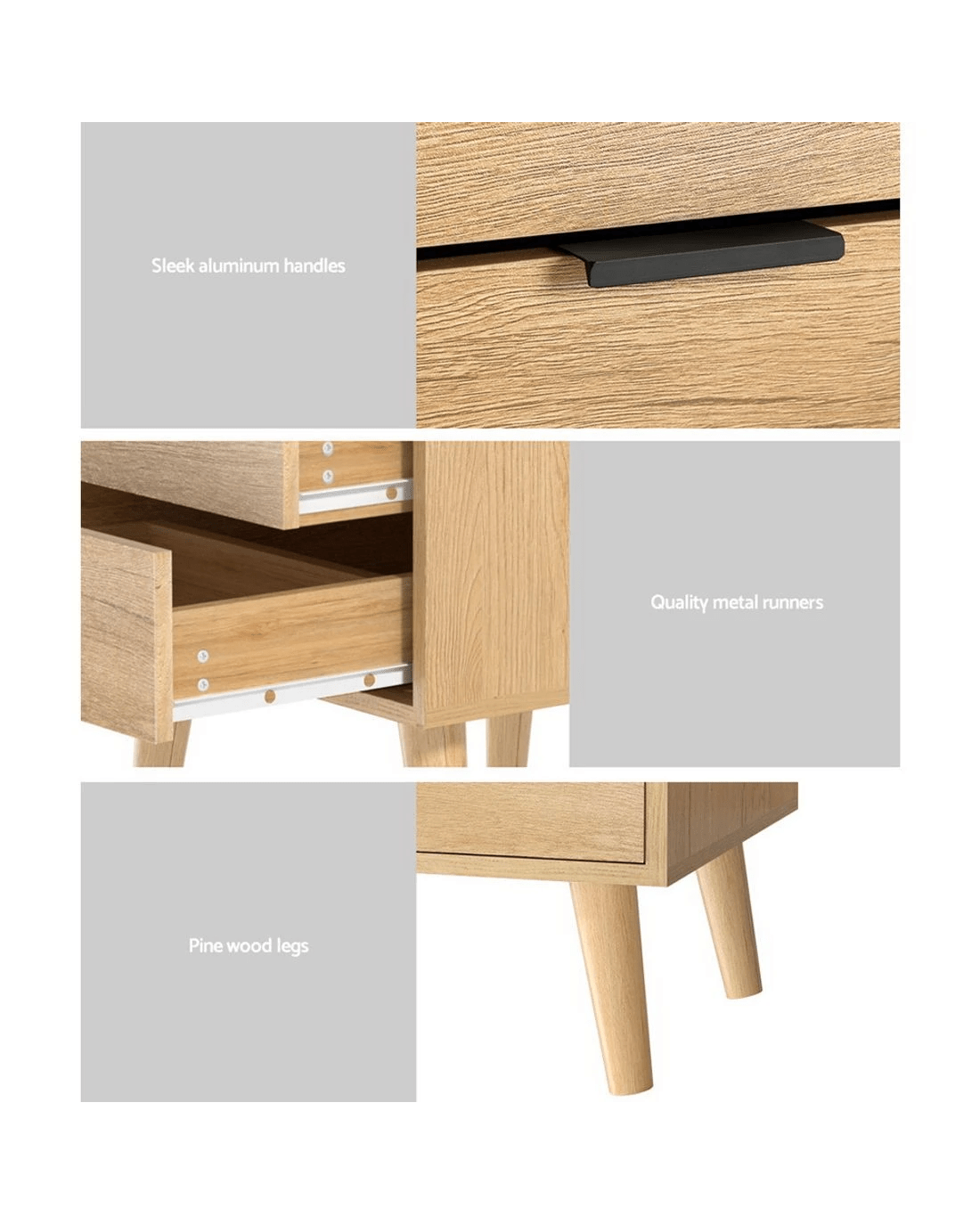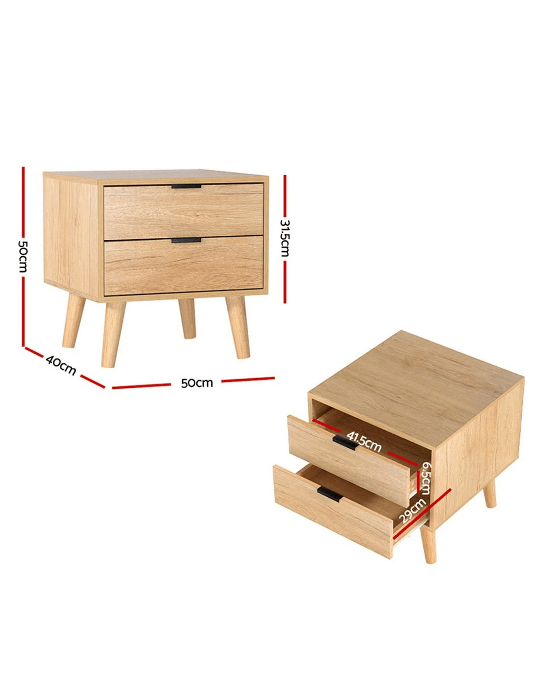 A design that is Scandinavian-inspired and yet reminiscent of decades-old influences, our Artiss Bedside Table offers full functionality with stylish cues. Made from quality particle board with smooth paper finish, the bedside table is the perfect choice to grace any bedroom, study or any other space in a discerning home or establishment. The sturdy legs are topped with anti-slip floor protectors to keep the table in place and prevent scratches on your floors. The piece comes with aluminium handles and smooth anti-rust drawer slides for hassle-free use. Not least, ample storage space is found with the two drawers for all your bedside or personal essentials. For everything that needs to be close at hand anytime, the Artiss Bedside Table is convenience at its best.