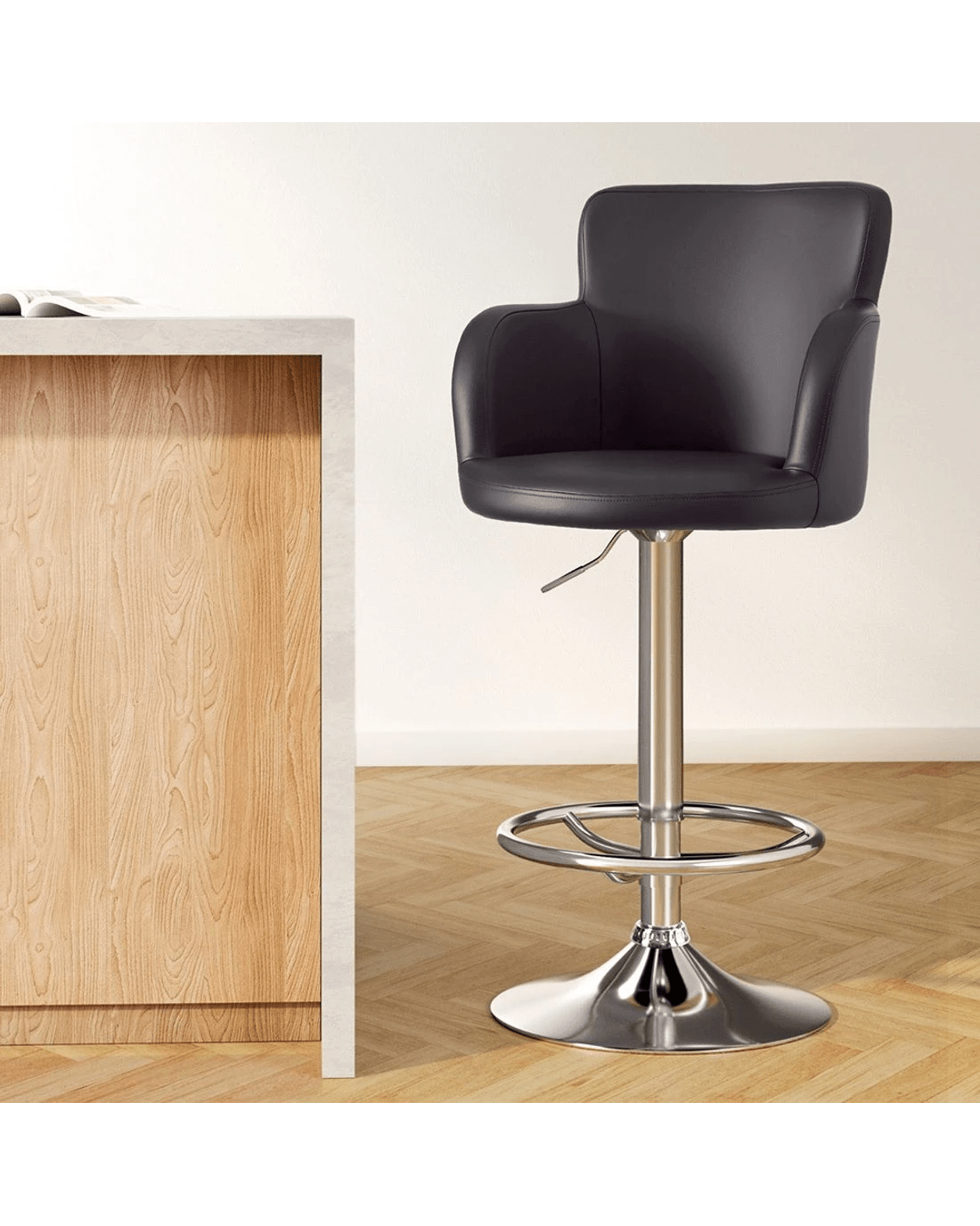 The Artiss 1x Leather Bar Stools combine modern functionality with enduring comfort for kitchen islands, breakfast bars, or entertainment spaces. Featuring luxe PU leather upholstery over plush foam padding, these swivel bar stools with full backrests provide all-day seating comfort. The SGS-certified gas lift lever allows effortless height adjustment, while the 360-degree rotation ensures easy mobility. Built with a corrosion-resistant chrome steel frame and stabilising base, these counter-height stools safely support up to 150kg. Complete with protective floor pads and tool-free assembly, they seamlessly blend durability with contemporary style in sleek black.