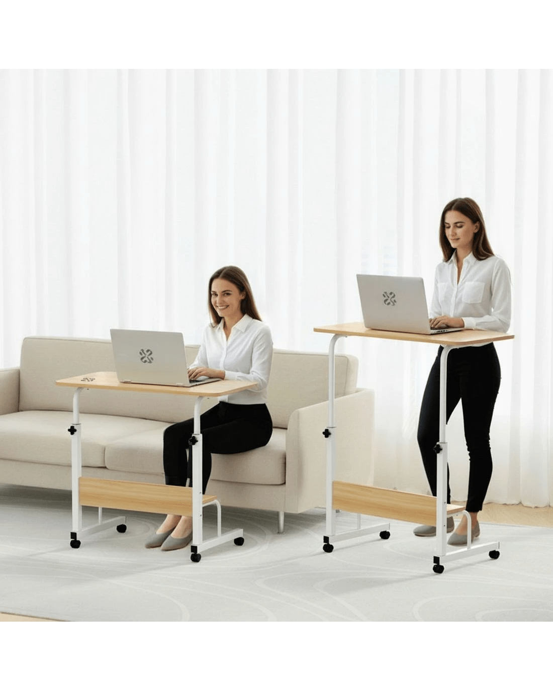 Experience ultimate flexibility with our portable and lightweight mobile laptop desk, designed to adapt to your lifestyle. The sturdy steel frame with U-shape design ensures stability while remaining easy to move. Detachable lockable caster wheels allow smooth mobility and secure placement wherever you need it - perfect for use near beds, couches, or recliners.