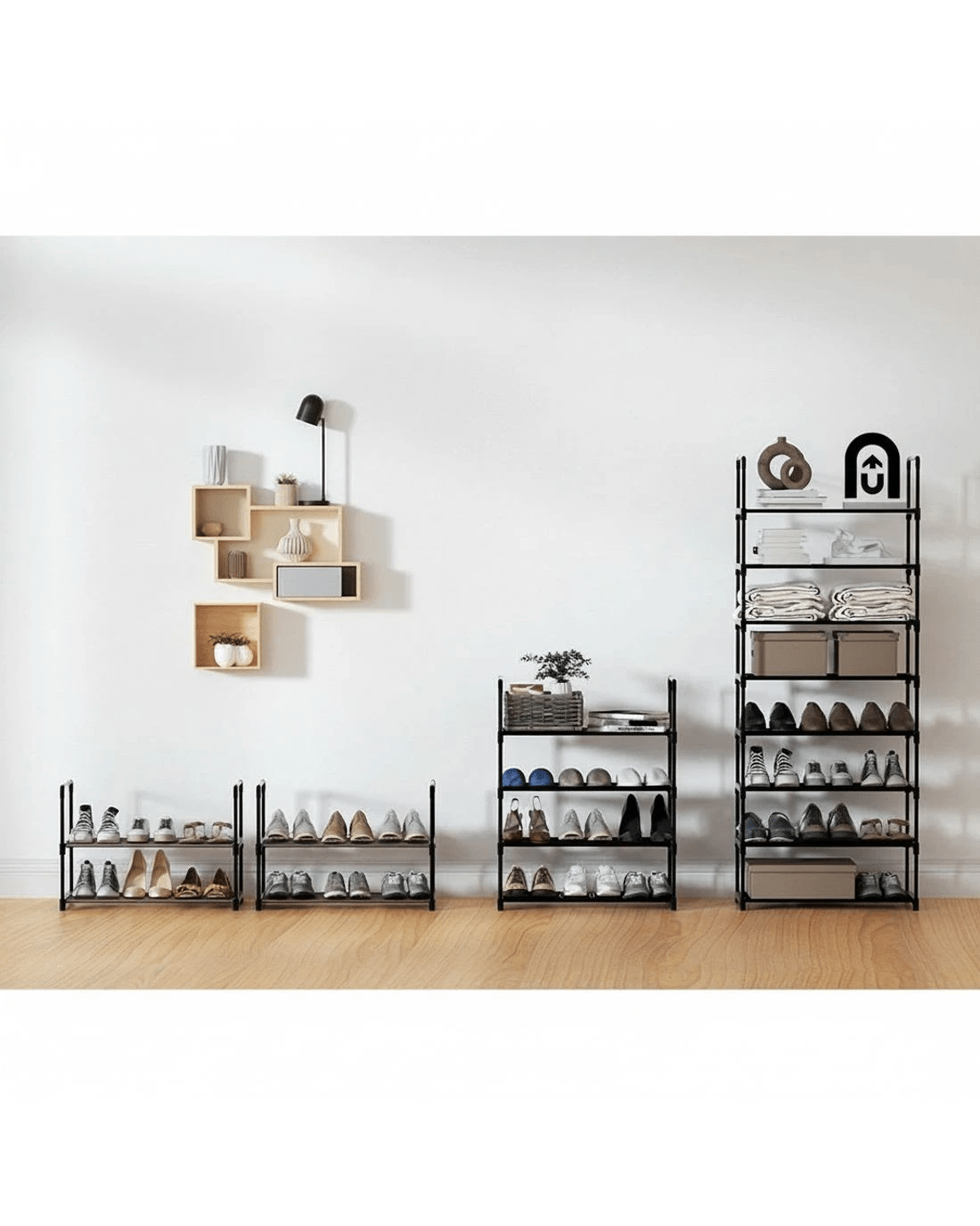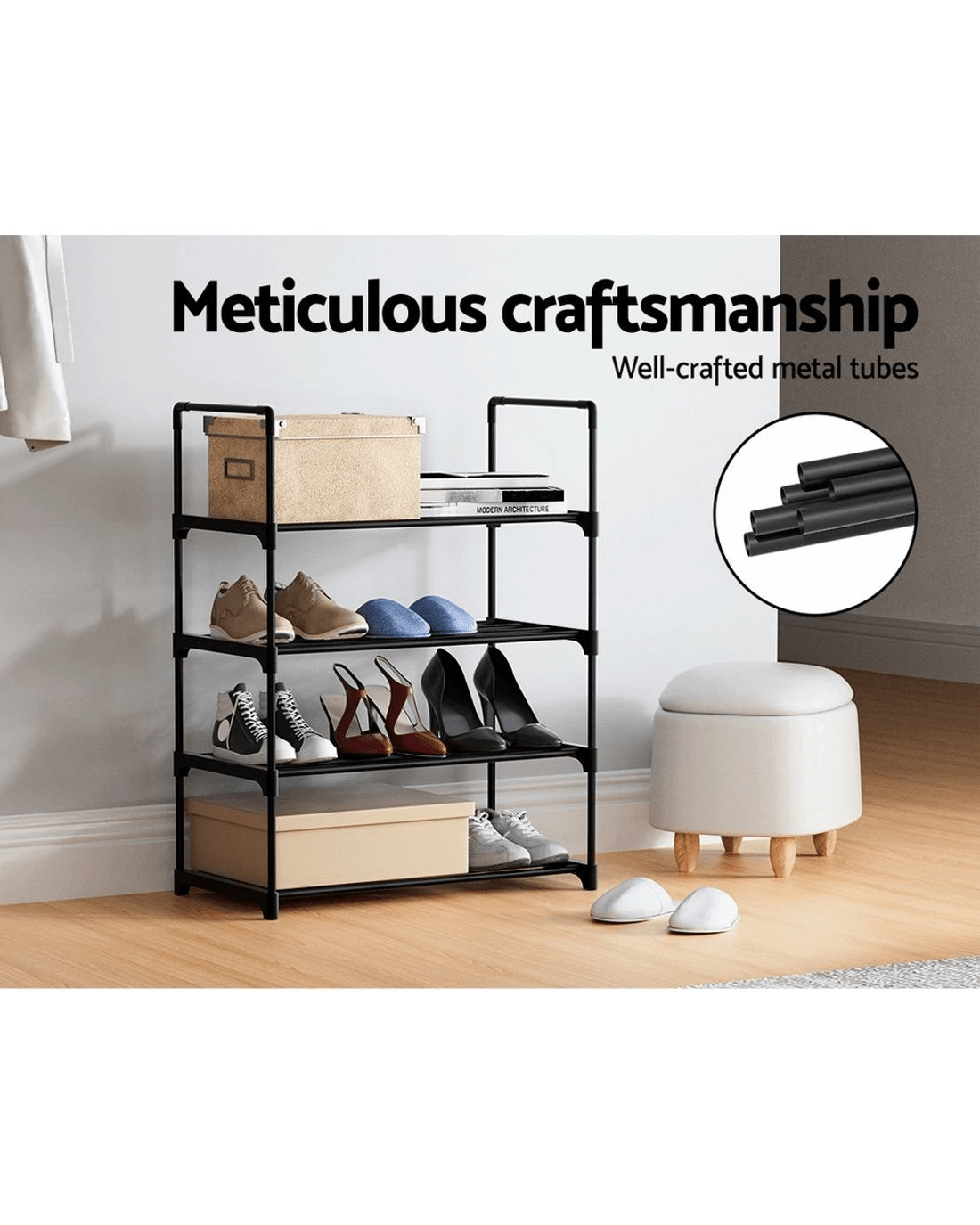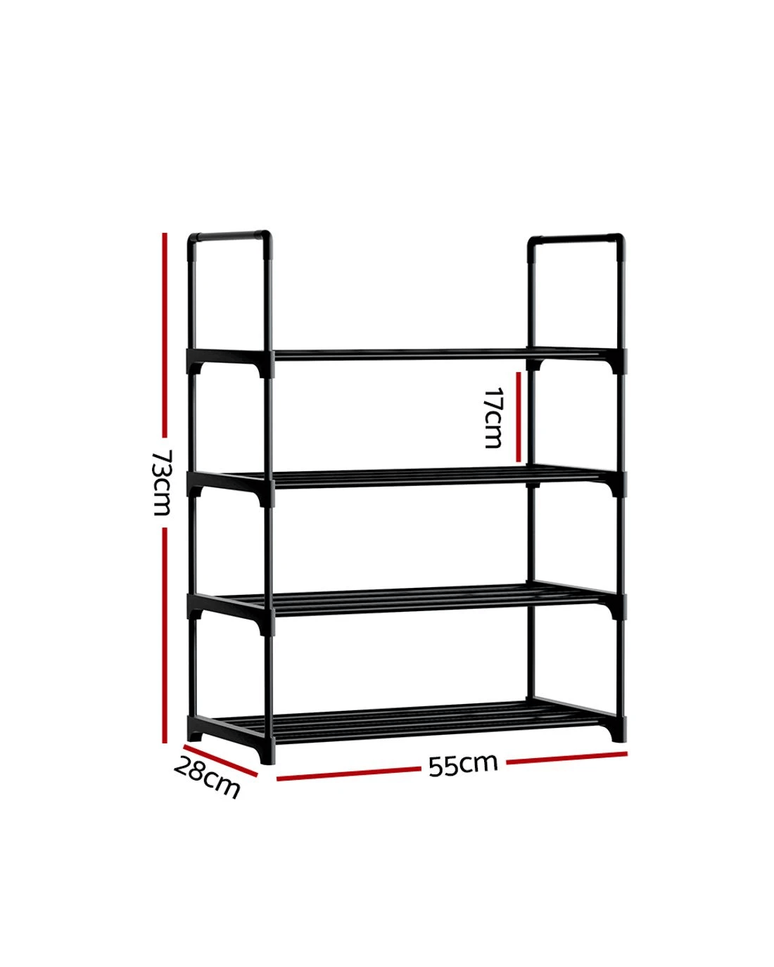 Sneakers, running shoes, flip-flops, boots, high heels, and special-occasion footwear, shoes are never enough! As our shoe collection gets out of hand, your first instinct may be to chuck them on the floor, gradually resulting in a shoe explosion. With our Artiss DIY shoe rack, you can keep your beloved shoes organised and prevent them from getting scuffed or looking worn. Our four-tier DIY shoe rack features a stackable design that allows you to store your shoes and find them easily. You can use this shoe rack together or separately, considering your shoe size and preferences. Featuring meticulous craftsmanship, our shoe rack boasts a sturdy and durable structure with black powder-coated metal tubes and non-slip foot pads. Each tier has a 10kg weight holding capacity and comes with 17cm each tier height, which makes it suitable for most shoe types. Our shoe rack comes in a complete package. Its convenient design makes for hassle-free assembly. Furthermore, you don't require any tools to assemble it. Convenient and versatile, get our Artiss DIY shoe rack today.