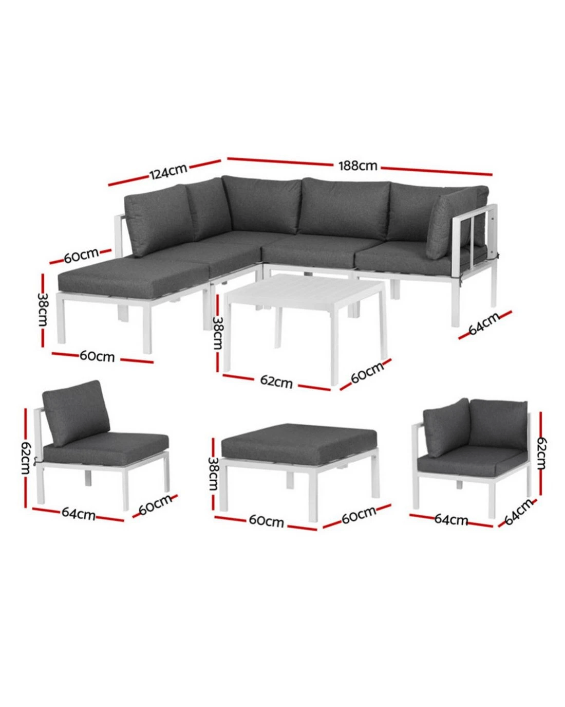 Get outdoors just in time for summer with the Gardeon 5-seater Outdoor Aluminium Sofa Set. Featuring two single sofa, two corner sofas, a ottoman and a wide coffee table, there's plenty of space for the whole family.