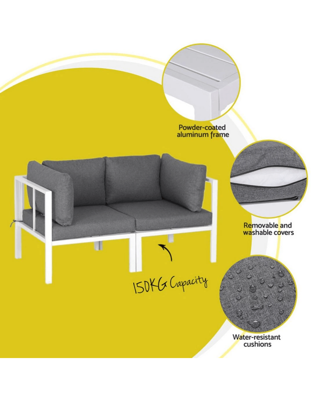 The set is easy to assemble, and you can easily configure the seating into your perfect outdoor set-up. The set is made using powder-coated aluminium for rust and water resistance, while the outdoor cushions feature water and UV-resistant covers and thick 10cm high-density foam for comfort.
