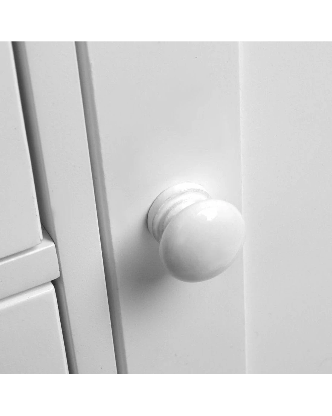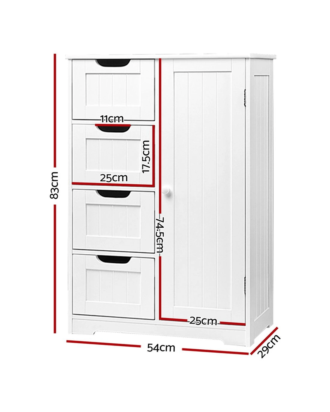 Featuring a MDF construction with an eco-friendly non-toxic white painted finish, our Bathroom Storage Cabinet comprises four large and spacious drawers and a two-shelf cupboard. You will find magnetic door fittings to ensure tighter closing, air gap handles for hassle-free opening and closing and smooth round edges for safe use. More importantly, there is ample space for every bathroom essential that you need, ranging from towels to persoanl toiletries and even bathroom cleaning equipment. Not least, its contemporary design will match easily with any modern décor as will its compact sizing.