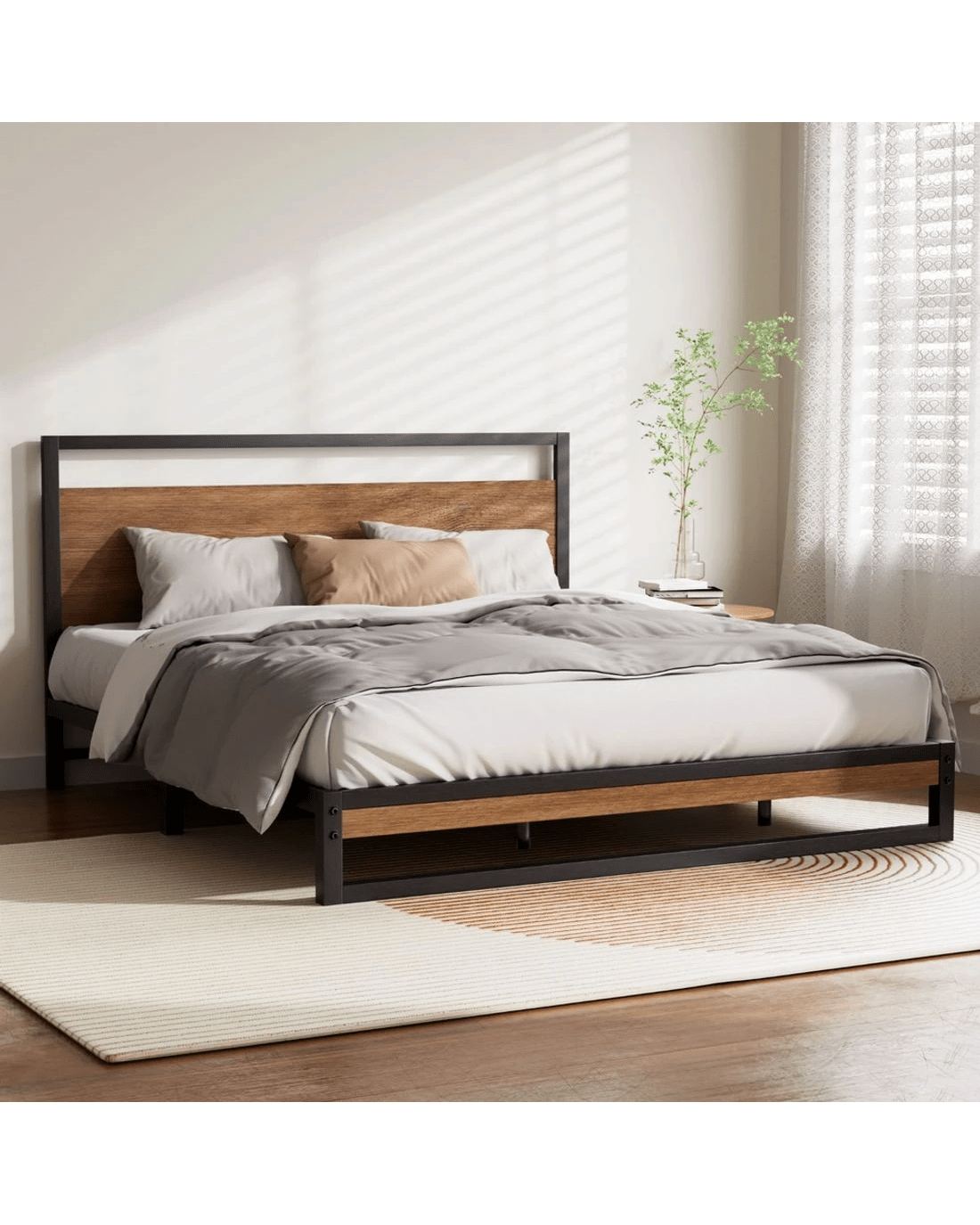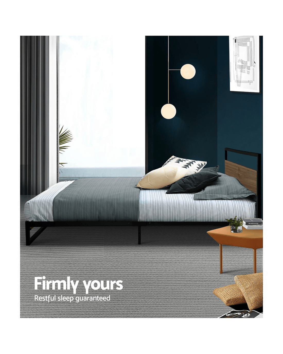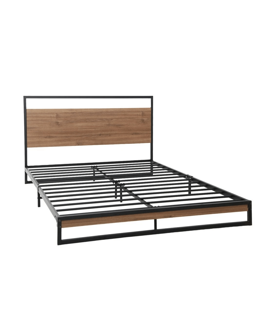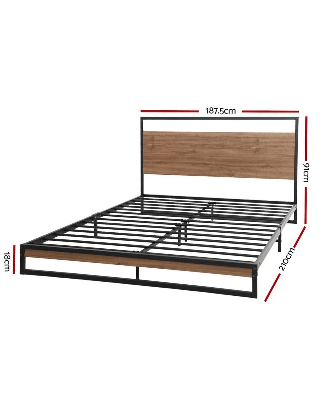 Metal and wood in perfect harmony. Our Dane Bed Frame is truly a stylish addition to any bedroom. Simple in design, the bed frame is meticulously constructed in sturdy steel and 15mm thick MDF with PVC for durability and strength. The sleek black powder-coated steel and dark wood accents lend real industrial cred to your bedroom for some standout décor. Across the frame, evenly spaced slats provide good weight distribution as well as ensuring that the mattress stays in place even with every twist and turn of your sleep. The central support beam further steadies the bed under robust use. Designed to fit standard size mattresses effortlessly, our eclectic bed frame is guaranteed to give you pleasant dreams with every sleep.