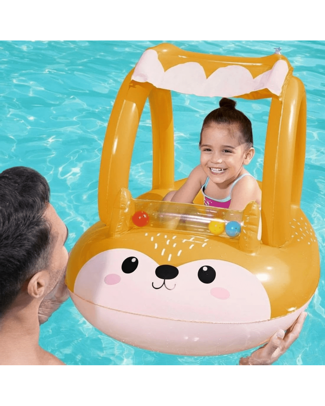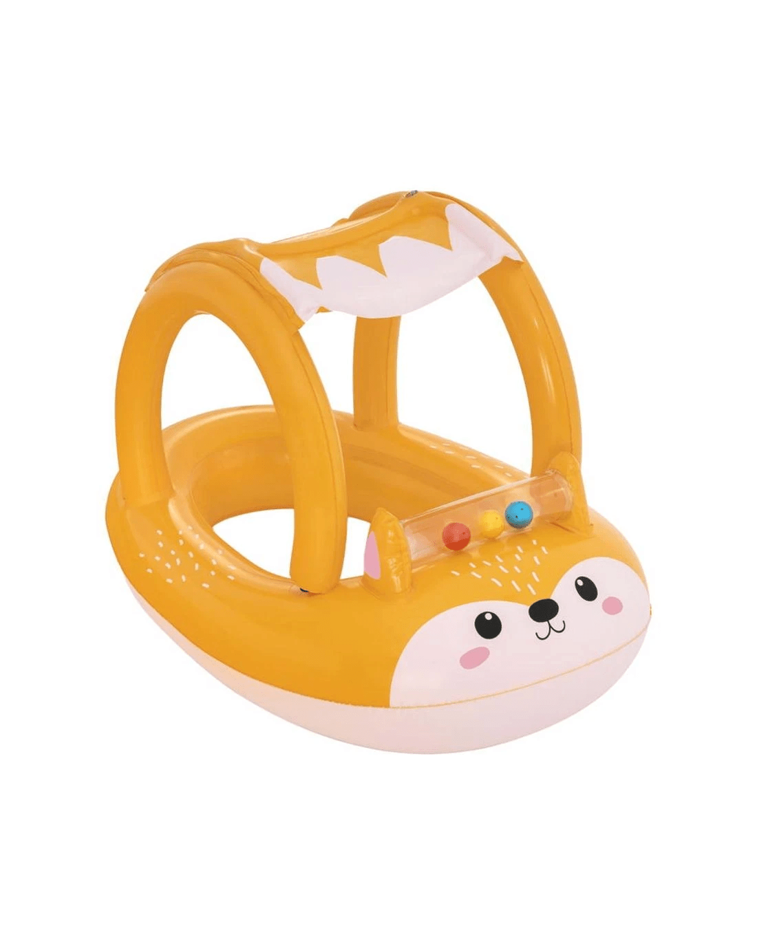 You know you're on to something awesome in the pool with our Bestway Inflatable Floats. Featuring a very cute fox design, built of sturdy PVC, the Float is durable and comprised air chambers. The boat features an enclosed tube with 3 moving, colorful balls that slide around as the boat moves and make a fun, tinkling sound to delight your little one. The boat also features a sunshade to protect your child as they splash and play. The shade is attached with velcro and can be easily removed for entry or exit, so your child is ready to float in minutes! So get ready for summer with the Bestway Inflatable Floats and have a splashing great ride. Get yours today.