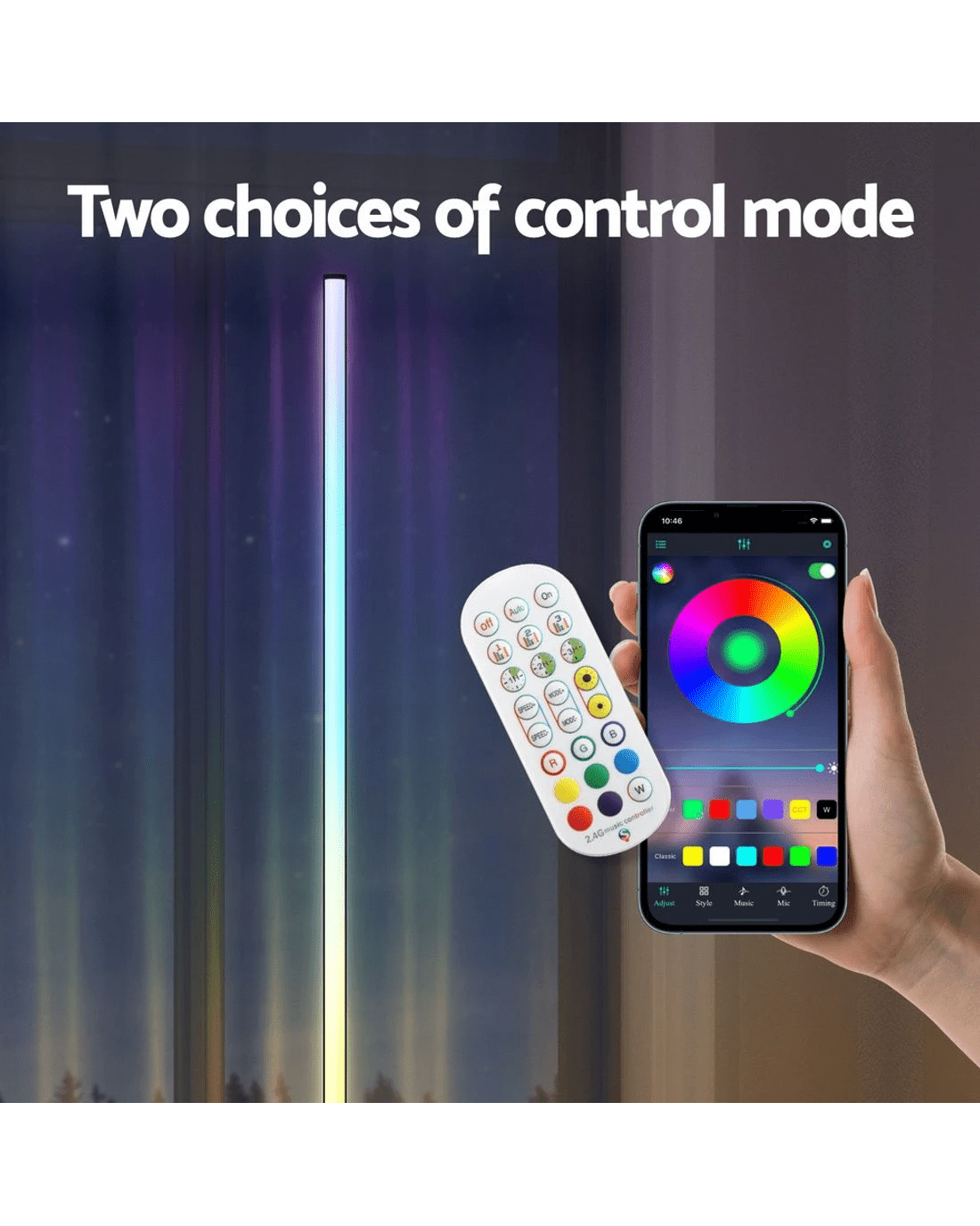 Get illuminated with the Artiss RGB Floor Lamp. With a sleek and simple design, you'll be able to light up your home anywhere, anytime. With multiple colour modes and adjustable brightness, you can find the perfect balance between mood and task lighting with the touch of a button. Lightweight and easy to construct, the light can be placed in a corner or moved around the room with ease. You can easily control the light through the included remote control or via the mobile app. A stable base keeps the light in place as you work, play and relax. The light is USB-powered for portable, consistent light anywhere with a USB port. Whether you're working in the office, cooking in the kitchen or relaxing in the living room, you'll love the creativity of the Artiss RGB Floor Lamp.