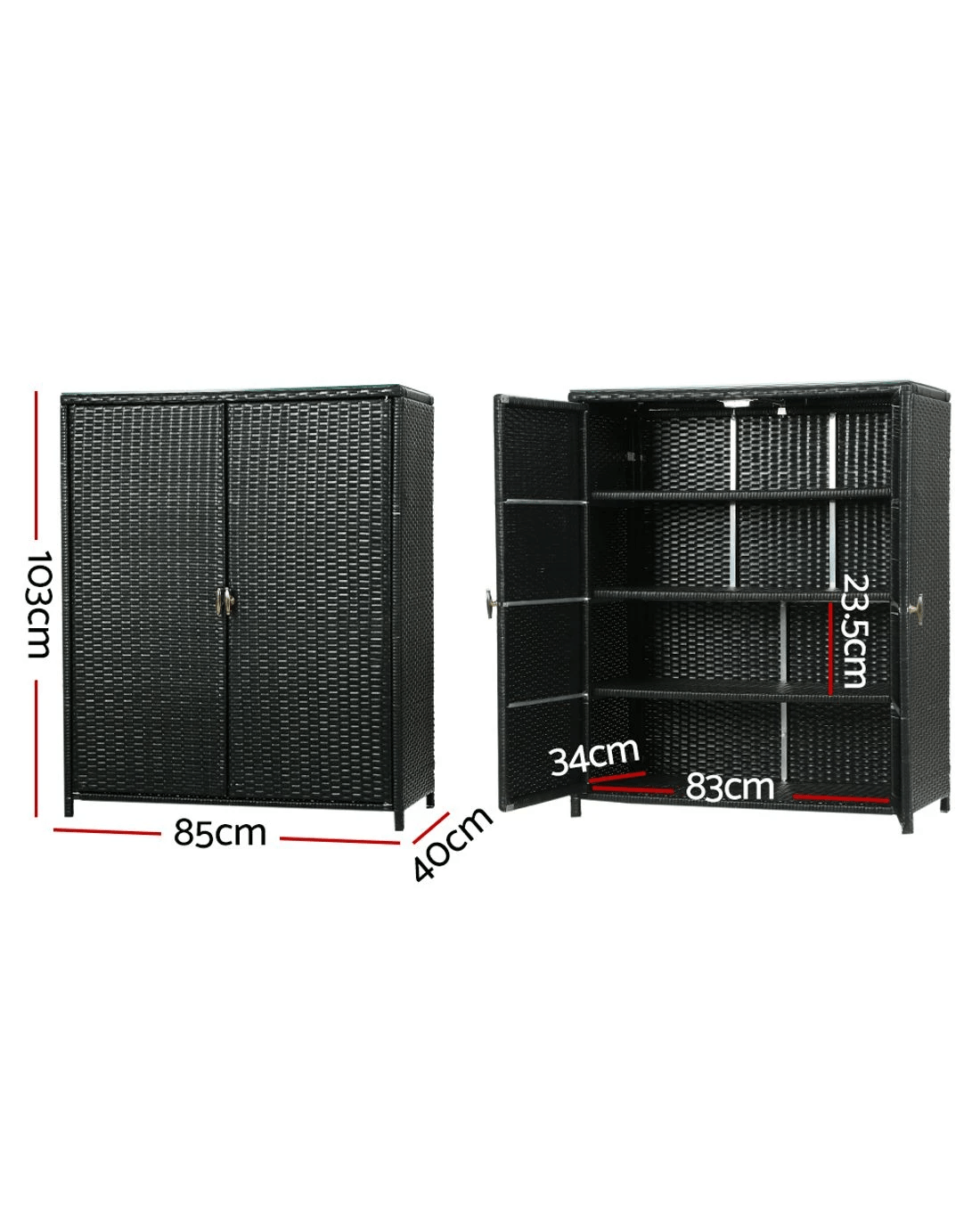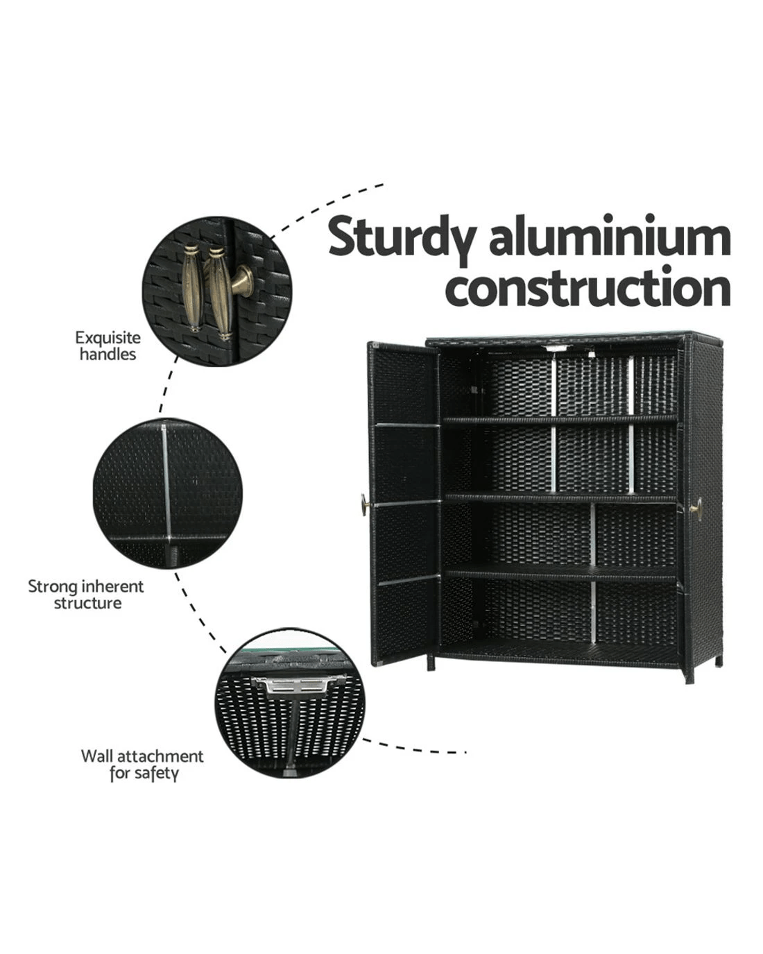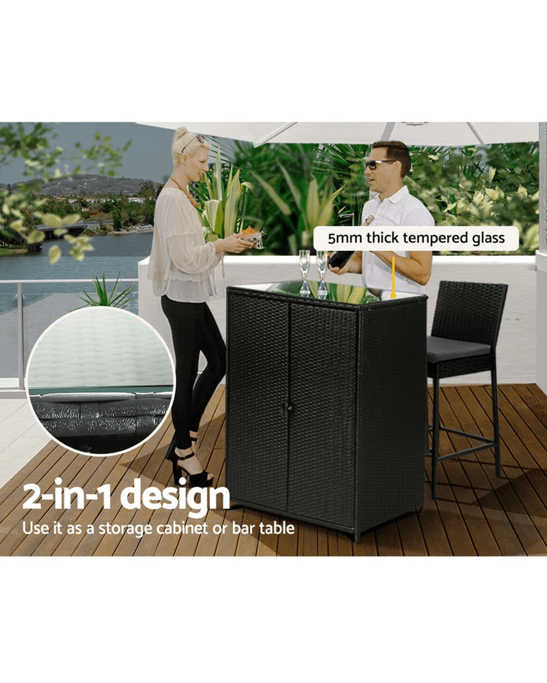 Looking for extra storage for storing your garden or outdoor essentials and expensive tools? We've got you covered. Tidy up your outdoor space and keep things organised with our excellently designed Gardeon outdoor wicker storage cabinet. It flaunts fantastic 2-in-1 design, which makes for versatile use. You can use it as a storage cabinet to store your outdoor essentials and a bar table. Our outdoor storage cabinet comes with a thick tempered glass tabletop with suction pads to keep it in place. It's boasts sturdy aluminium construction, which contributes to its strong inherent structure. It also comes with exquisite handles for easy opening and closing and wall attachment points for safety. Tall, slim, and pleasant looking, this storage cabinet features a gorgeous handwoven PE wicker look and feel that you'll love. It's spacious and has a great weight holding capacity. Additionally, it offers good weather resistance and won't rust, which makes it suitable for outdoor use. Why wait? Bring home this fabulous Gardeon outdoor wicker storage cabinet today!