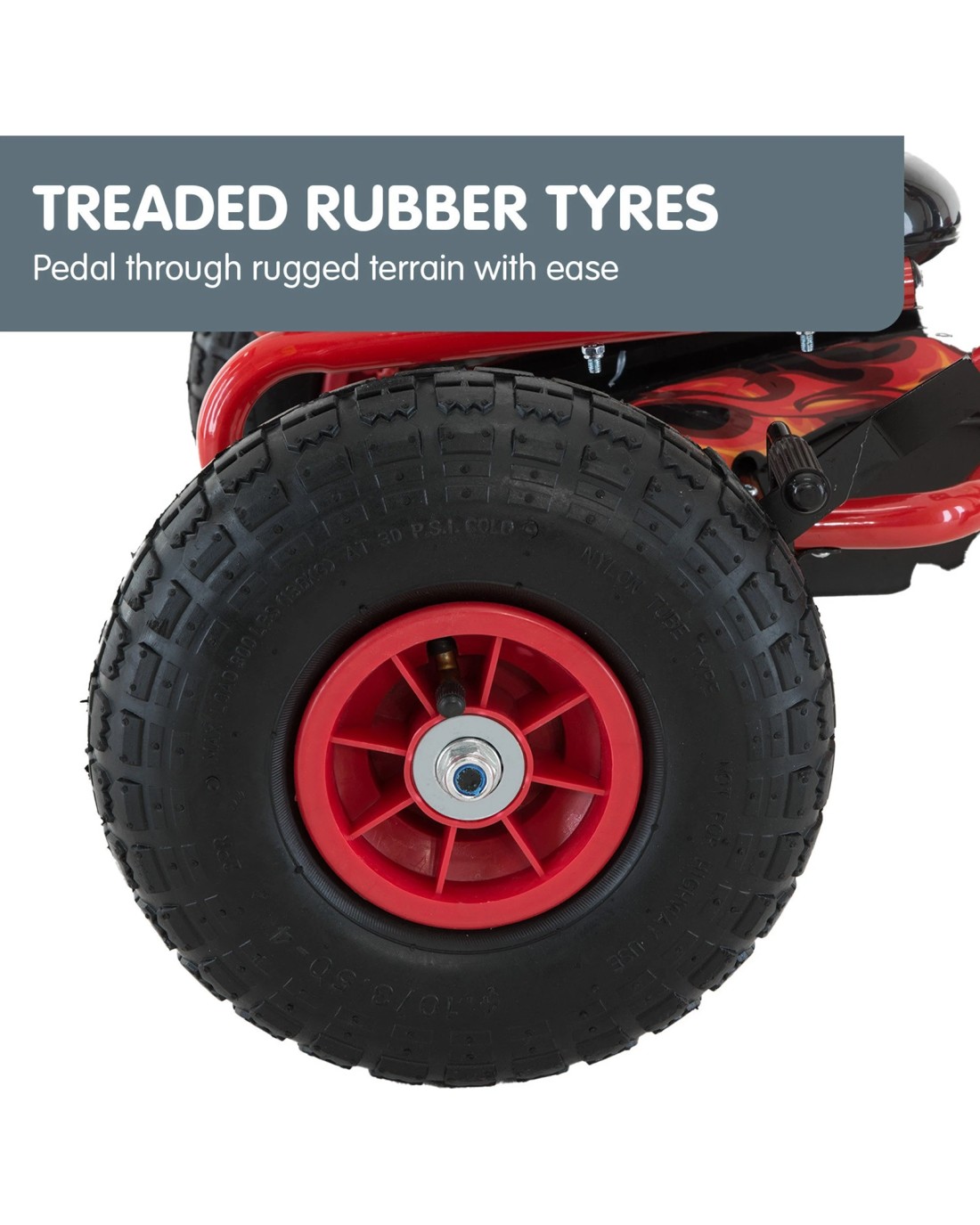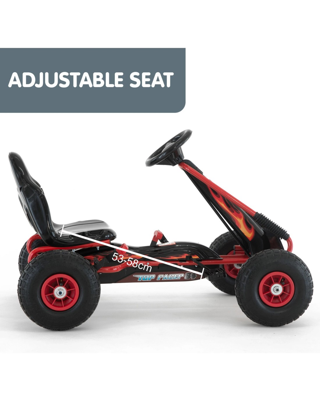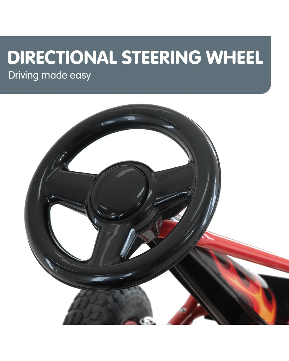 Take your kids' outdoor activity to the next level with this G95 pedal-powered go kart! With its contemporary design and cool flame decals, your little one will ride away with flair.