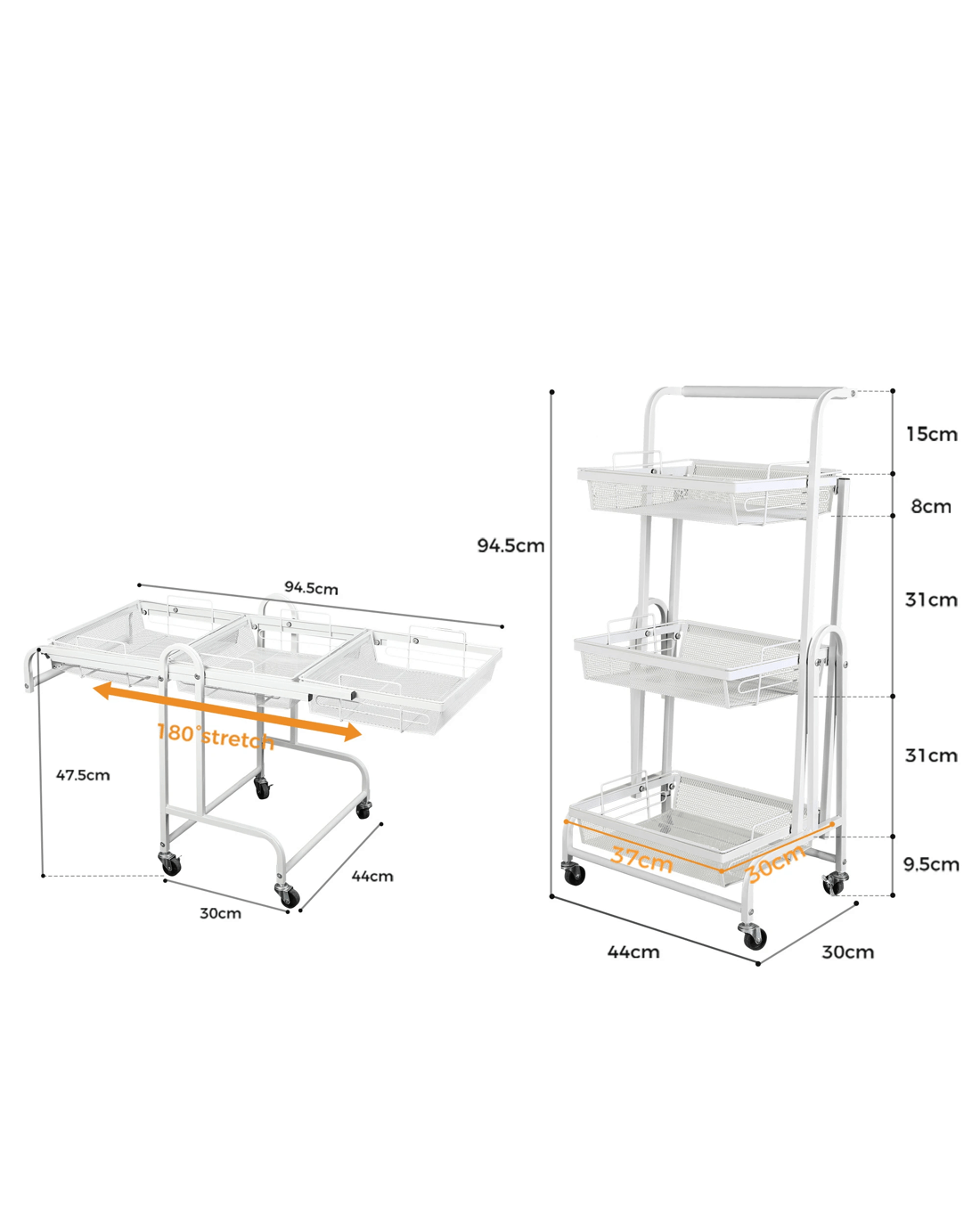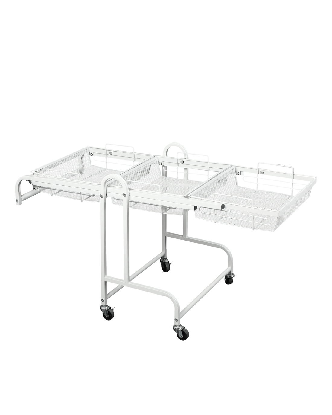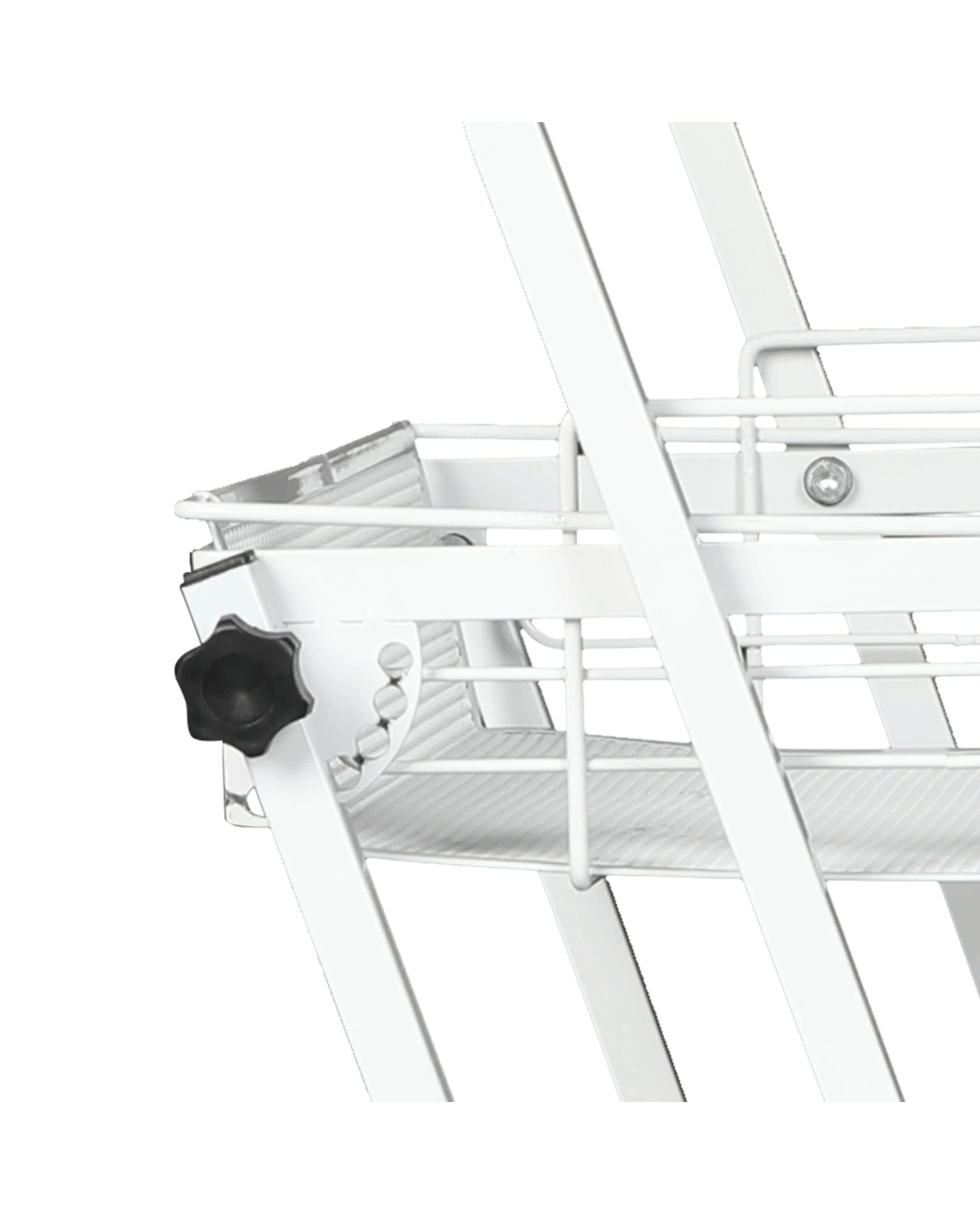 Conveniently roll your drawer trolley around the house. Need to save space in your kitchen? Adjust the angle of your shelves to full upright. Want a snack tray in the lounge? Turn the screw to rotate the baskets fully flat.