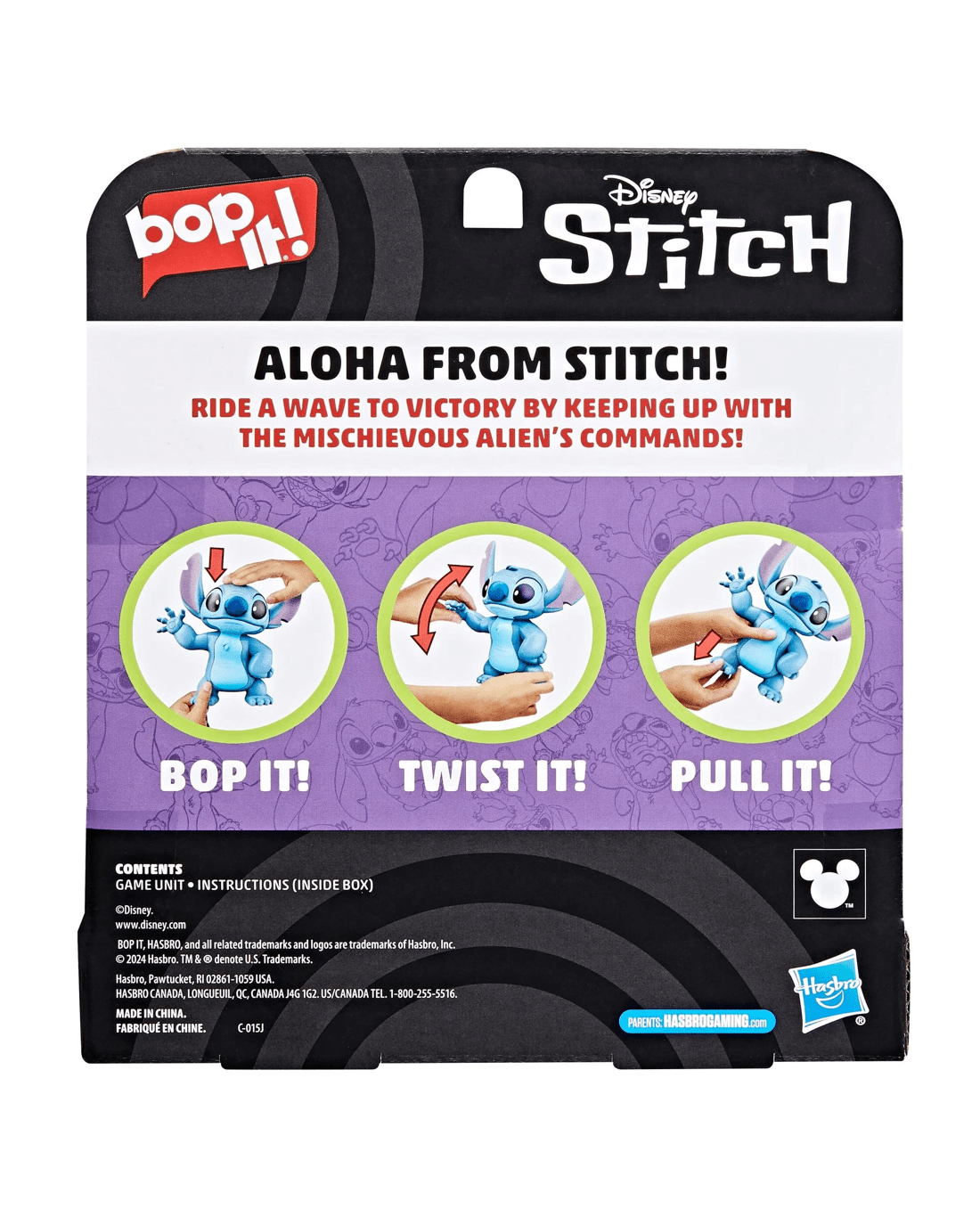 • BOP IT! WITH STITCH: Bop it, twist it, pull it with the Bop It! Disney Stitch Edition game, featuring the mischievous alien from Lilo and Stitch! It’s a fast-paced, electronic kids game for 1 or more players