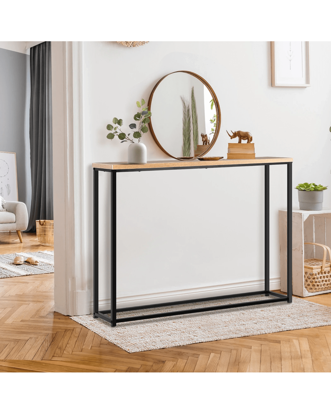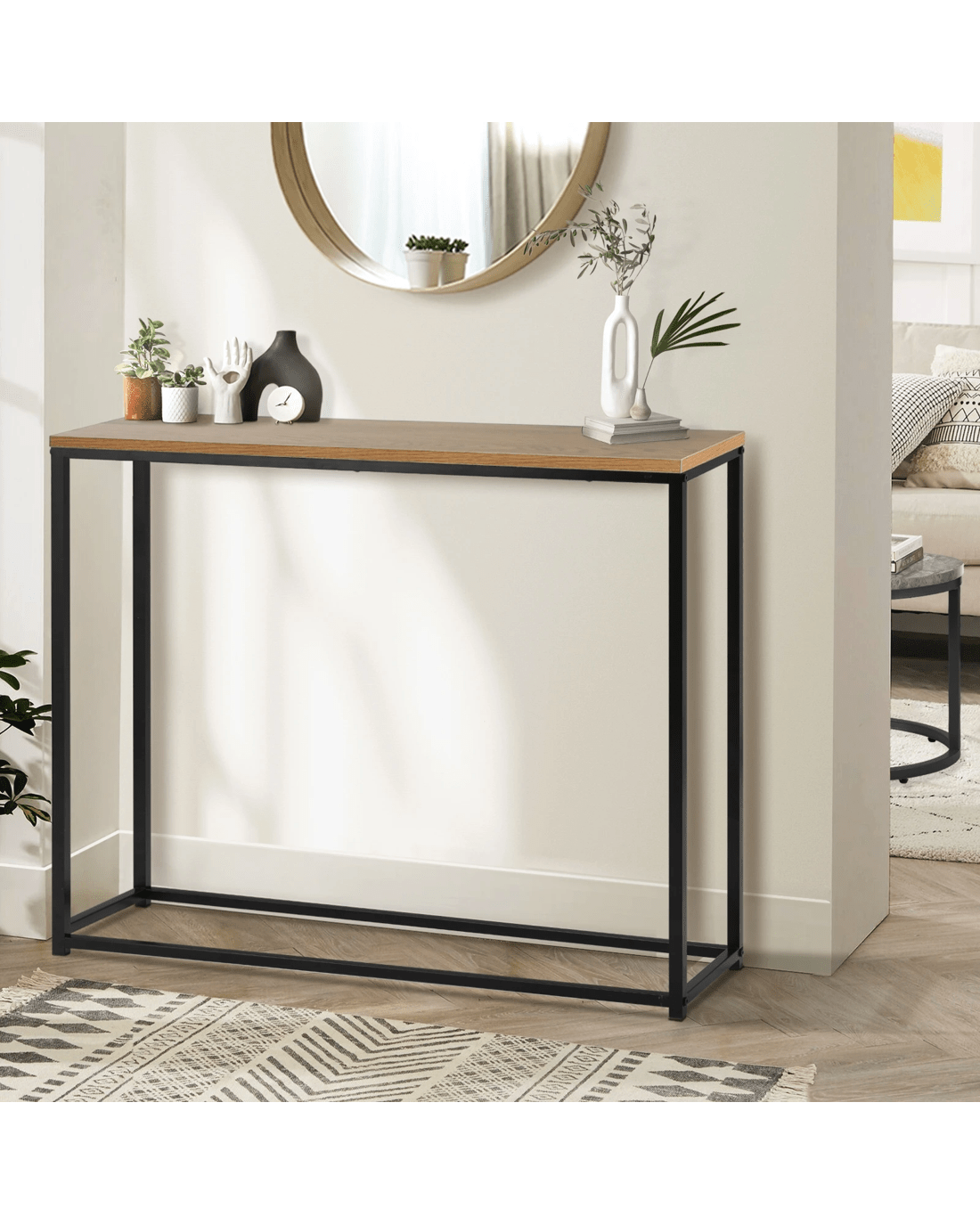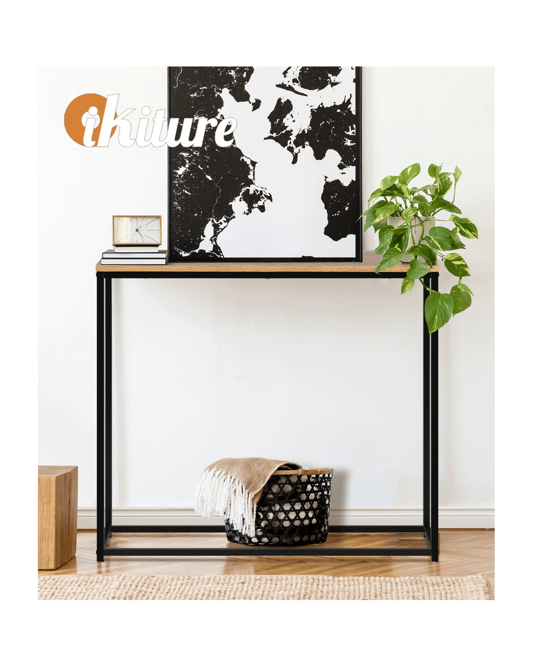 The iron frame of this console table not only adds an industrial-chic touch but also provides unrivaled stability and durability. It's designed to withstand the test of time, making it an excellent long-term investment for your home. The combination of wooden tabletop and iron frame ensures this table's versatility. It seamlessly complements various interior styles, from modern to traditional, making it a statement piece for any room, whether in your hallway, living room, or entryway.
