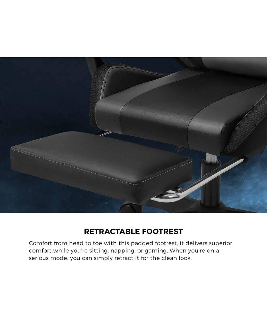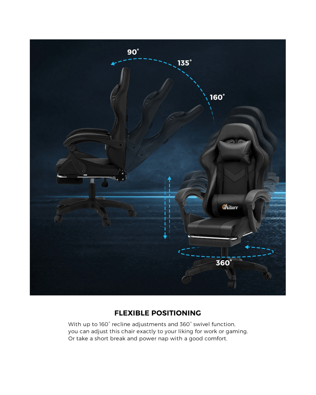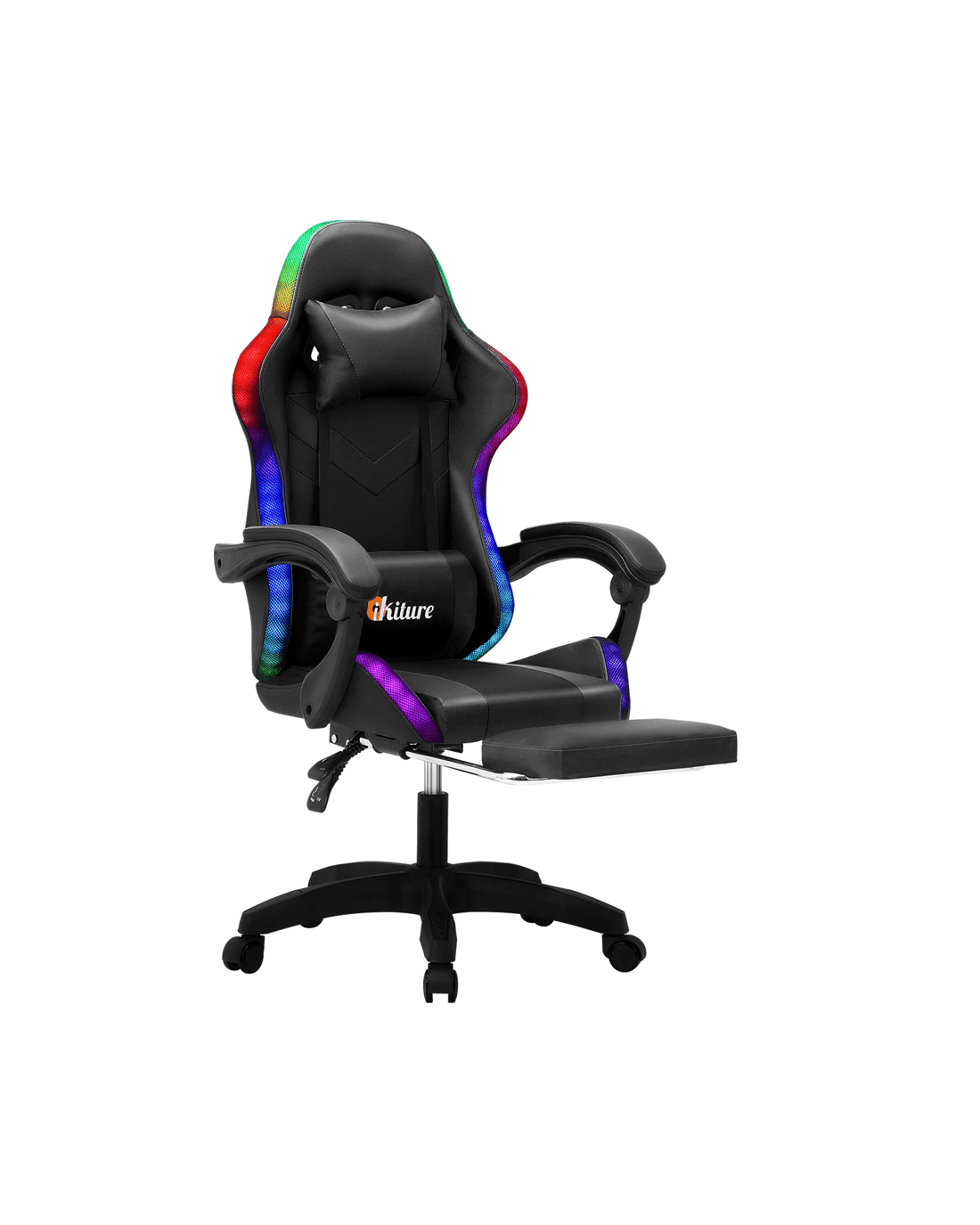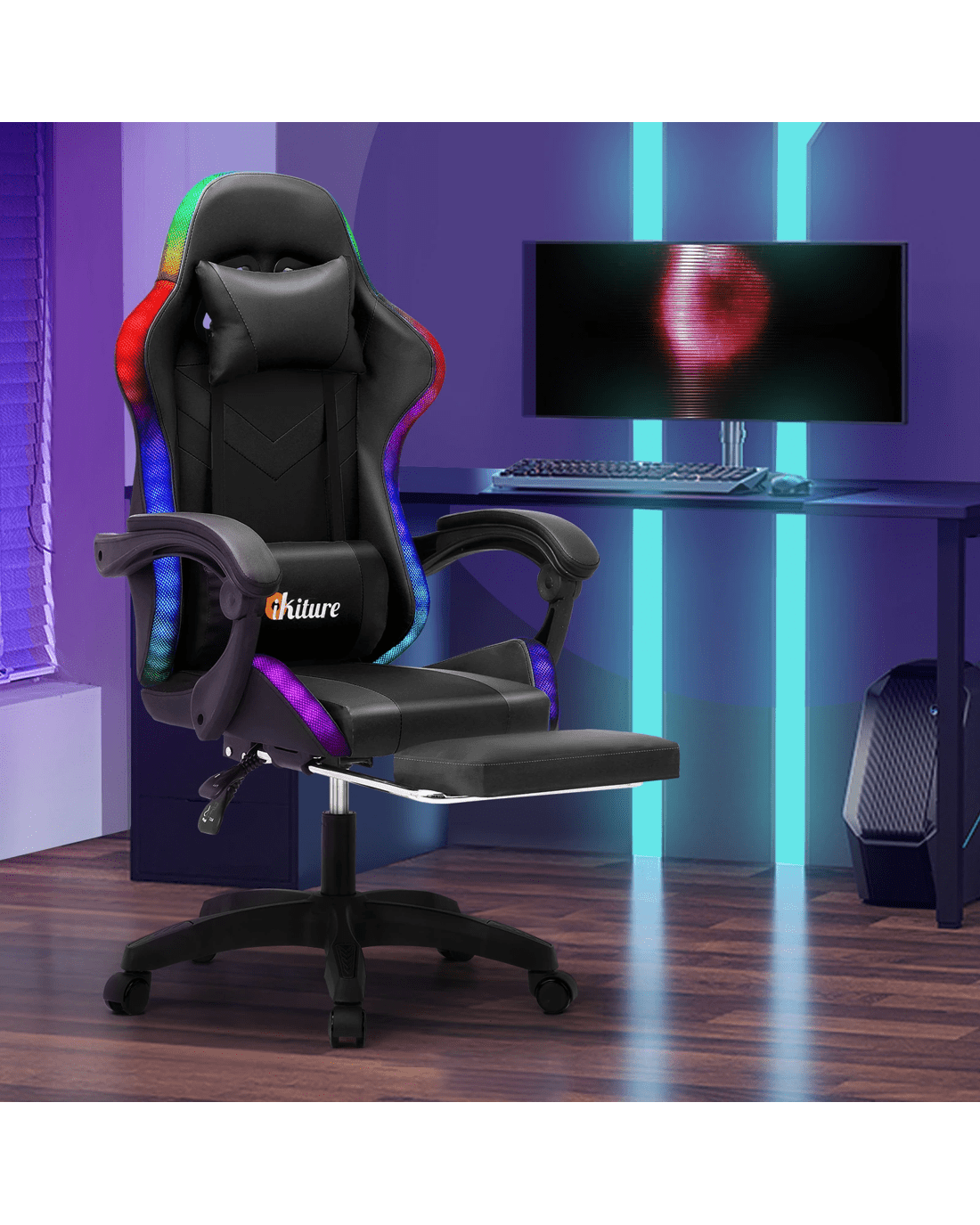 If you're into gaming or the gaming chair look, then this Oikiture LED Gaming Chair is right up your alley. Designed to create the perfect sitting positioning for play or work, our gaming chair is not short on creature comforts. Such as the plush leather seating, versatile adjustments, retractable footrest, smooth movements with omnidirectional castor wheels and certified quality components.