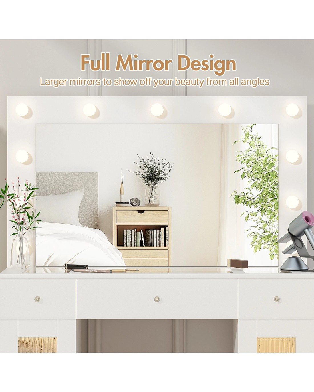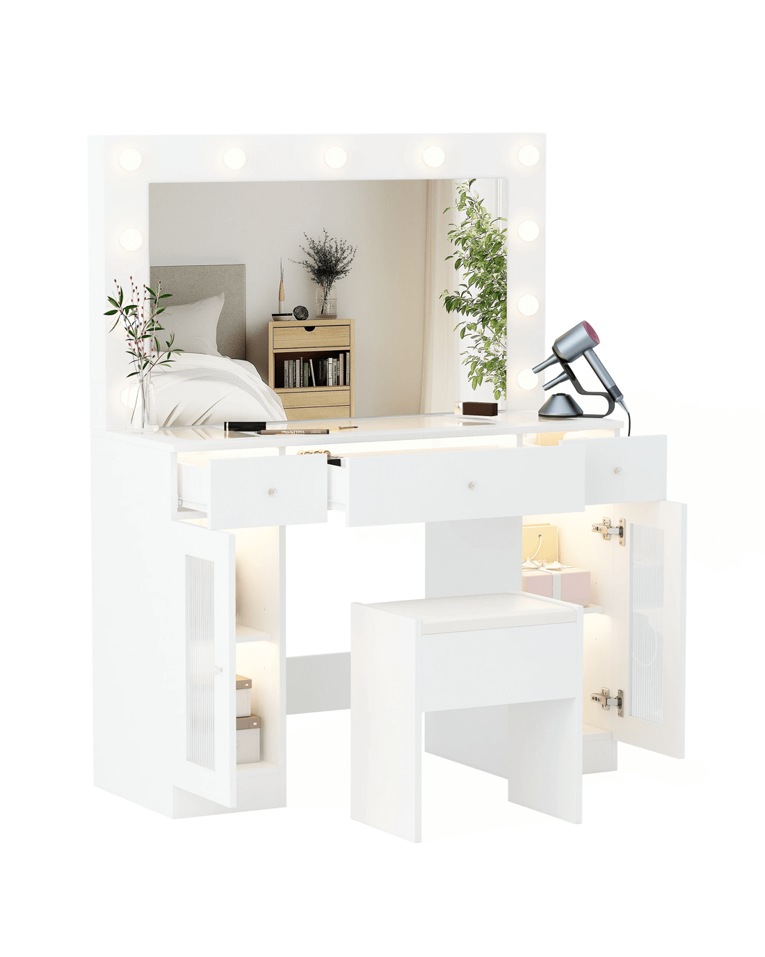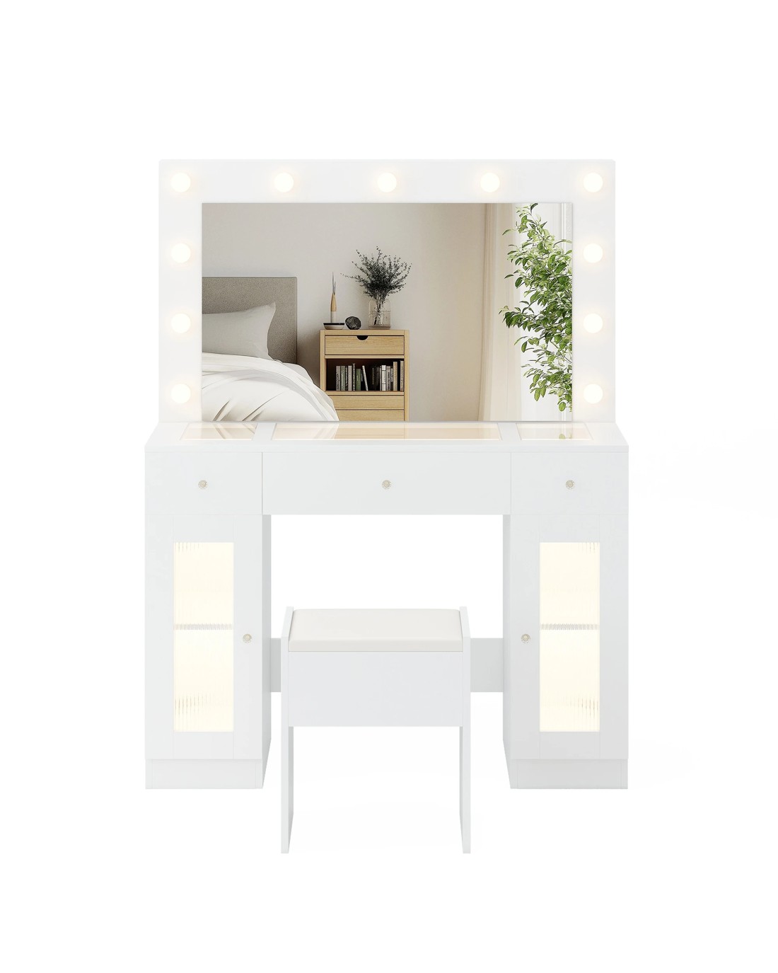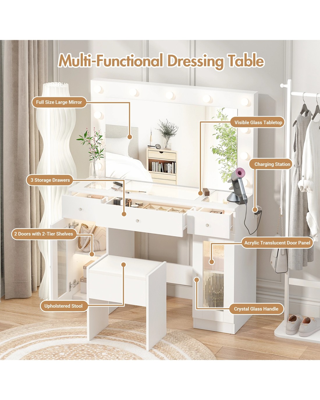 The Advwin Dressing Table is a stylish and functional addition to any bedroom. It features a large mirror with 11 built-in LED bulbs and 3 color modes (warm, natural, cool) for optimal makeup application. The table includes 3 drawers, 2 clear cabinets with adjustable shelves, and a stool with hidden storage, all designed to keep your cosmetics and jewelry neatly organized. The transparent glass top and acrylic doors add a touch of elegance, while the built-in charging station with two power outlets and two USB ports keeps your devices charged. This vanity set is not only practical but also makes a perfect gift for any special occasion.