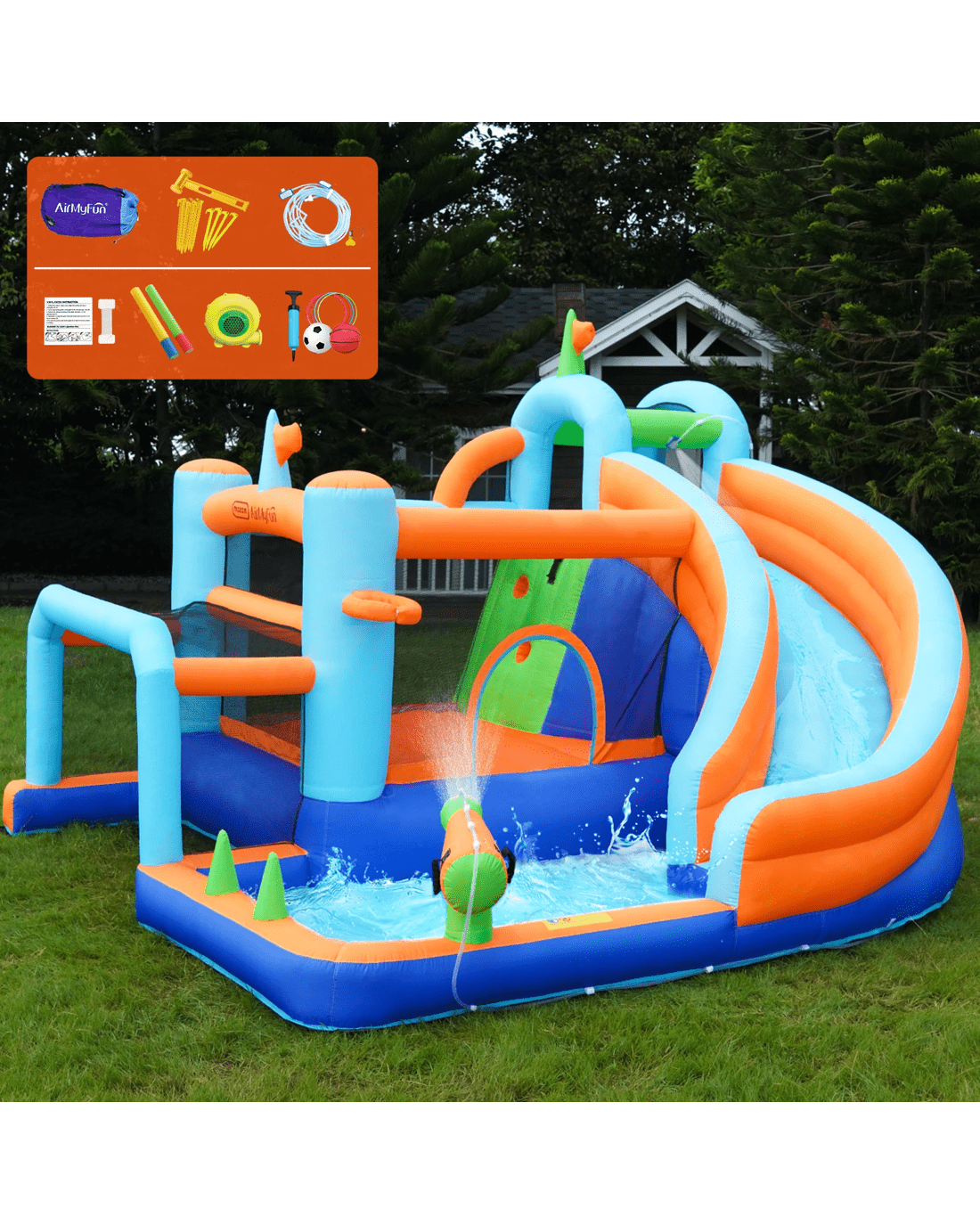Sold by Kamprad's Oikos 1943Airmyfun 9-in-1 Inflatable Water Park Jumping Castle Soccer Goalpost Blower - Multi