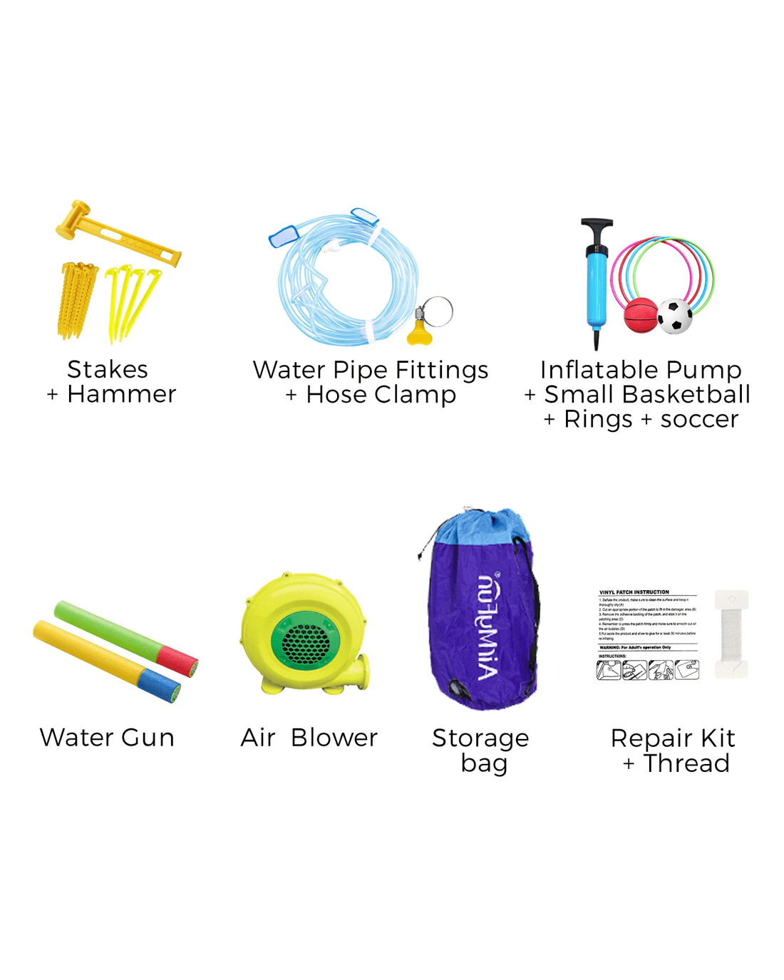 Setting up the water park is easy with full inflation in just 2 minutes with the supplied blower. The included accessories have all you need to get it up and equipped with all the necessary play gear, and anchored down for a steady and sturdy inflatable at all times.