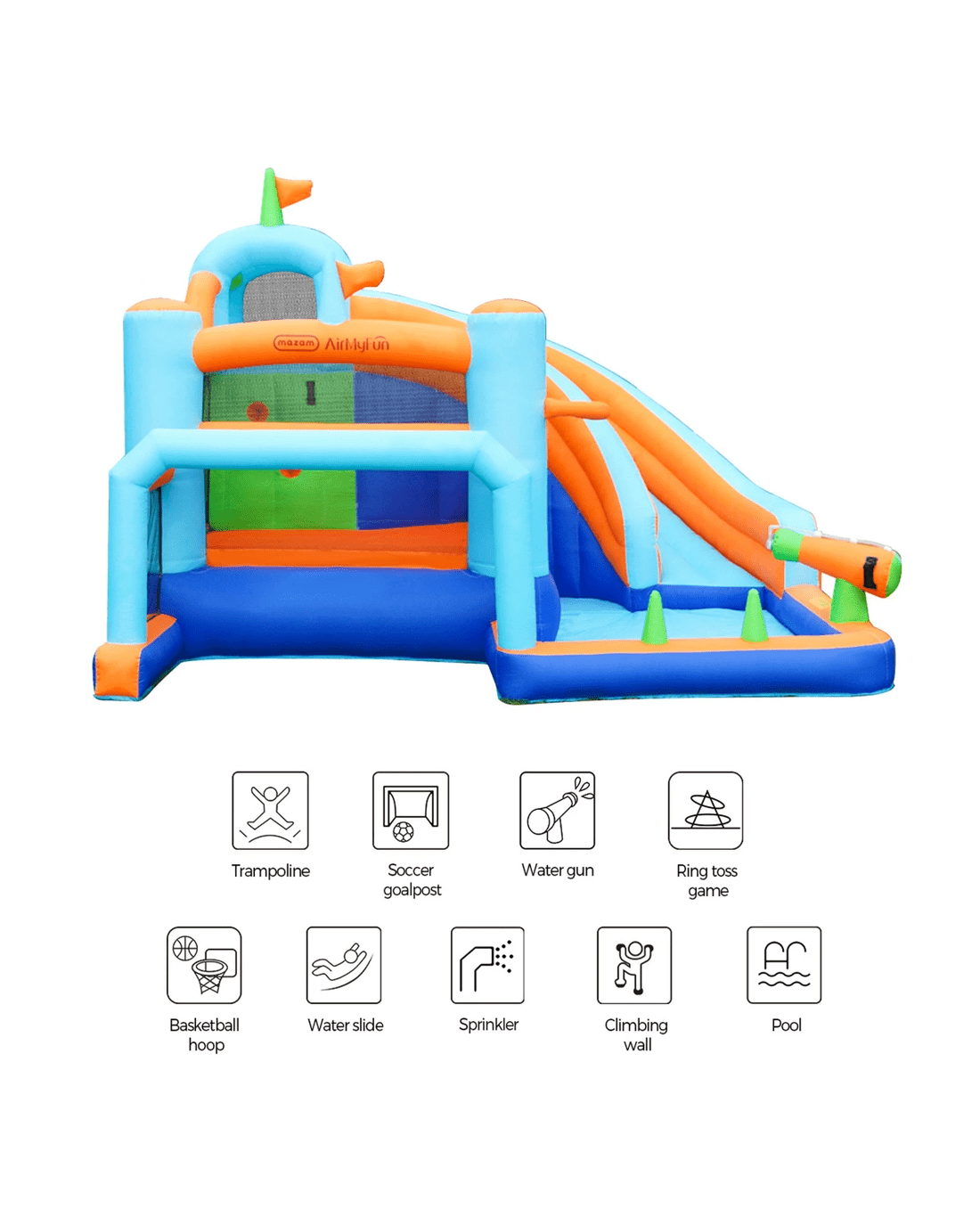 Fun with a mesmerising water park here in your own backyard! Nothing beats having that much far-out play for your kids to revel in. And with up to 9 awesome play zones, the thrilling Mazam + AirMyFun Inflatable Water Castle Park is simply an oasis of stupendous slides, exhilarating splashes and aquatic adventures for up to 5 kids. Climb, slide, glide, swim, jump, crawl, throw, splash or shoot, the water park lets your kids play out their fantastic fantasies for a whole lot of wet, wet, wet amusement and excitement.