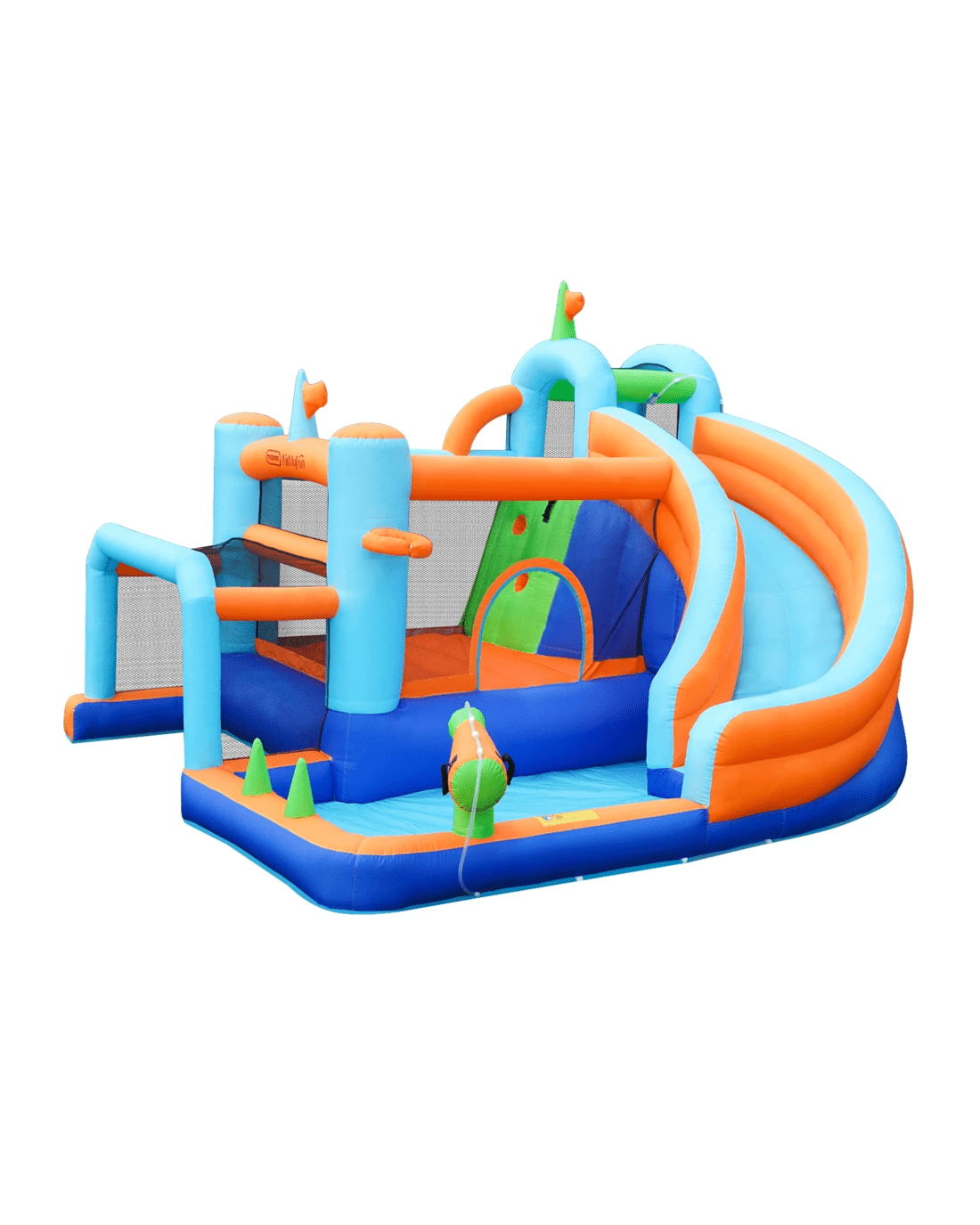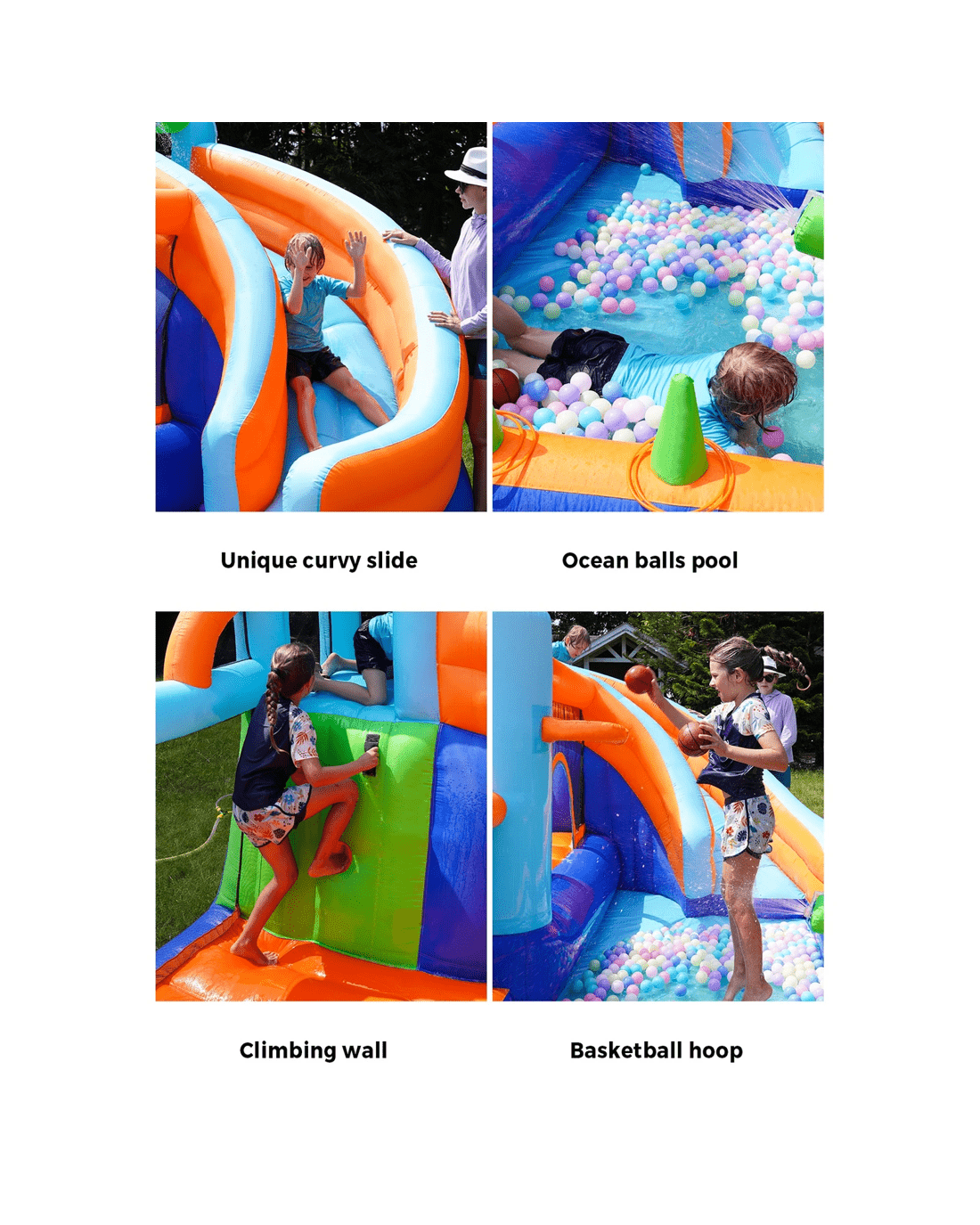 9 play zones: Unique curvy slide/Ocean ball pool/Climbing wall/Basketball hoop/Ring toss game/Water gun/Sprinkler/Soccer goalpost/Jumping zone
