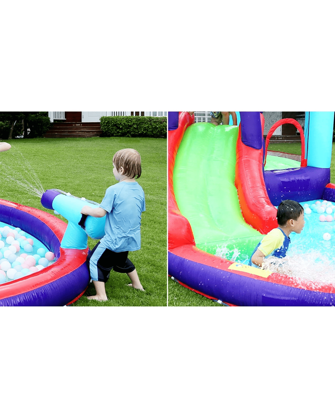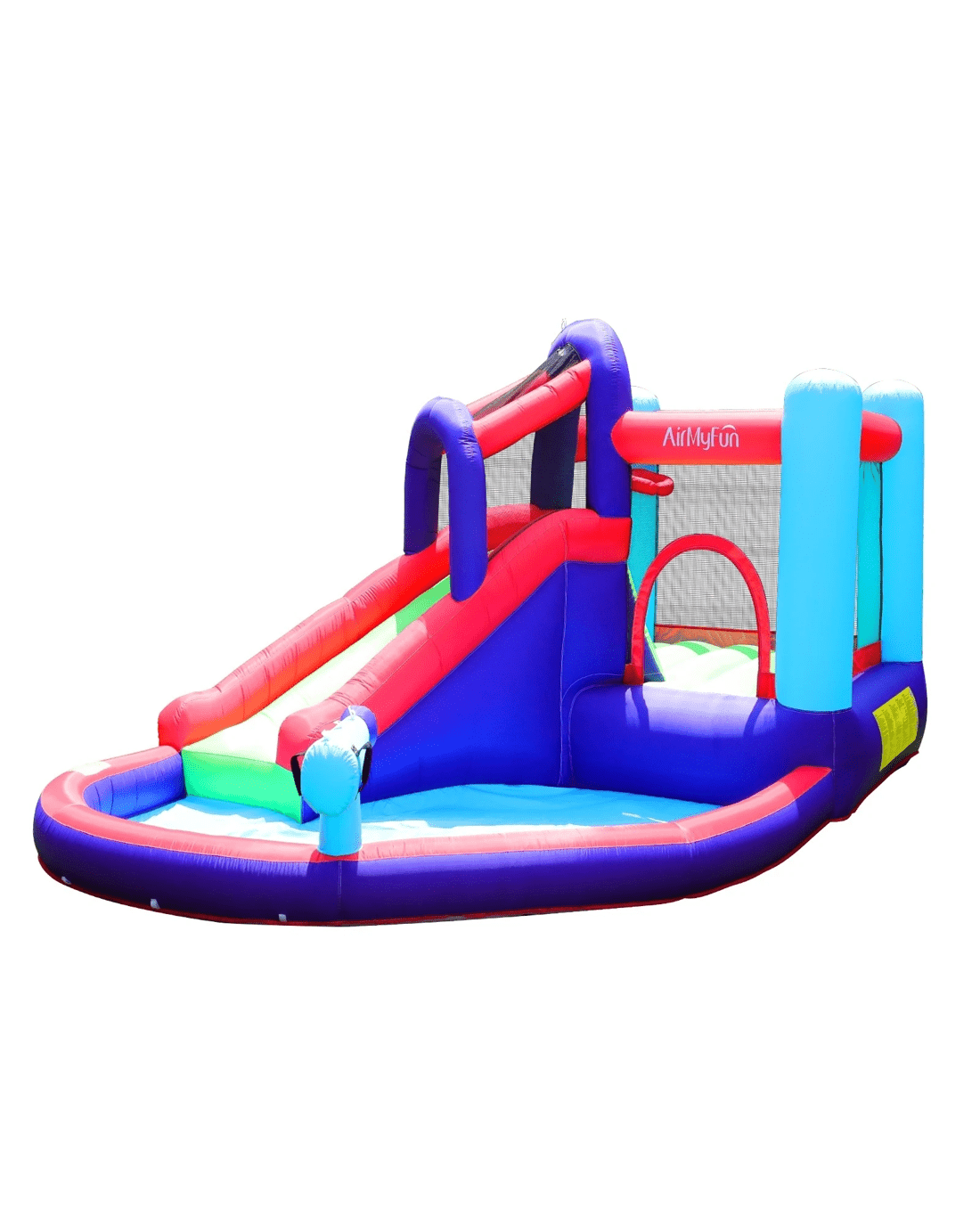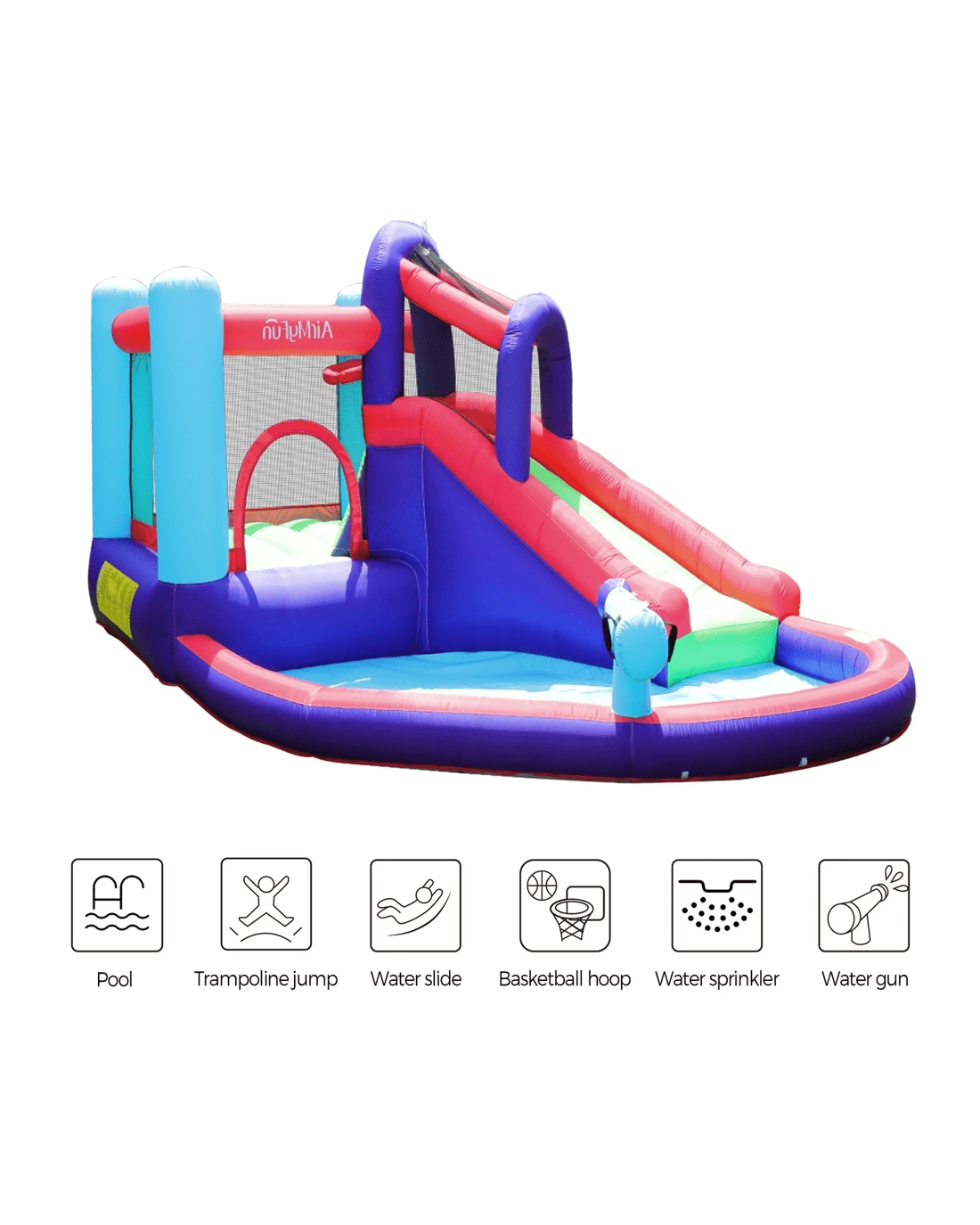 6 play zones: Pool, water slide, trampoline jump, sprinkler, water gun, basketball hoop