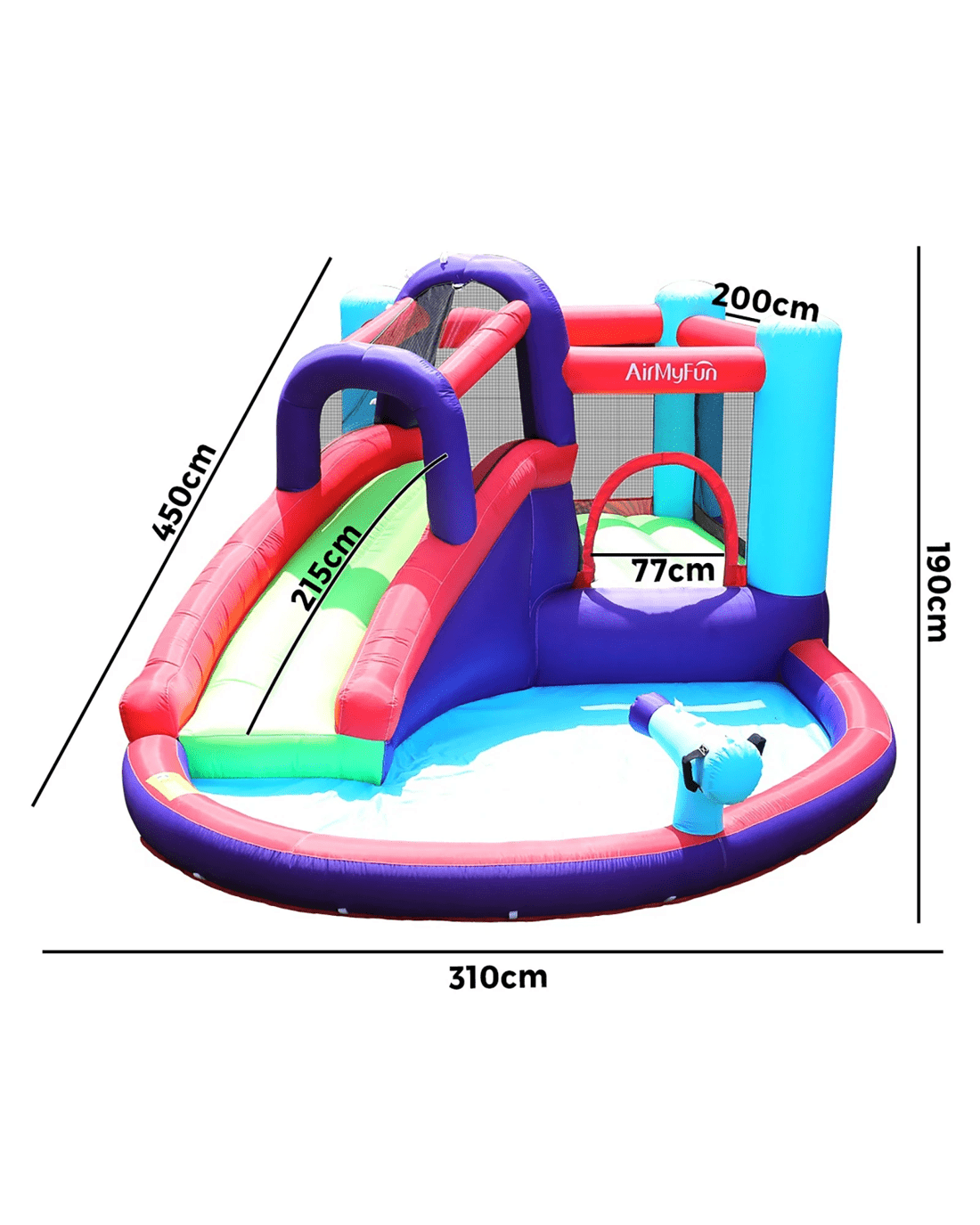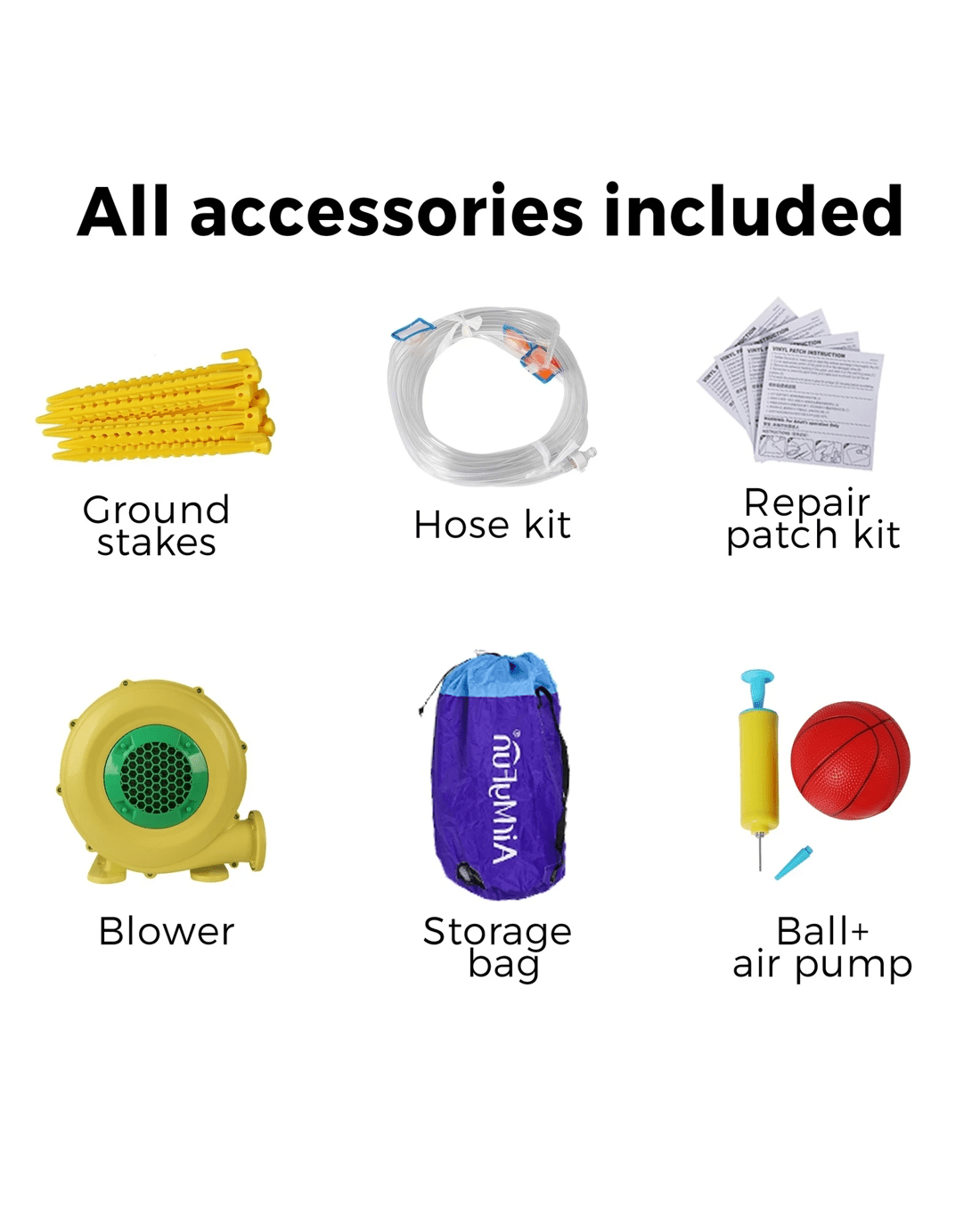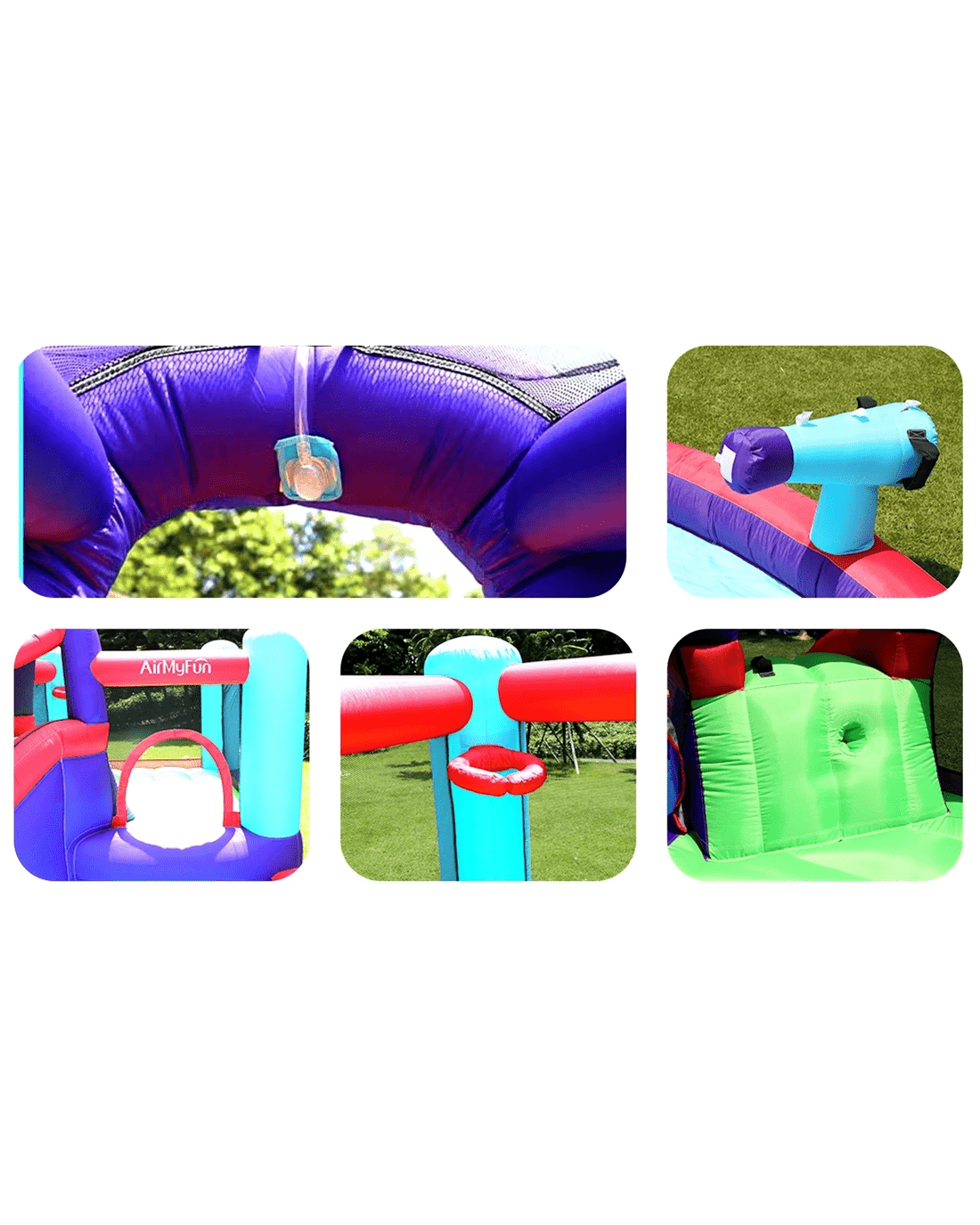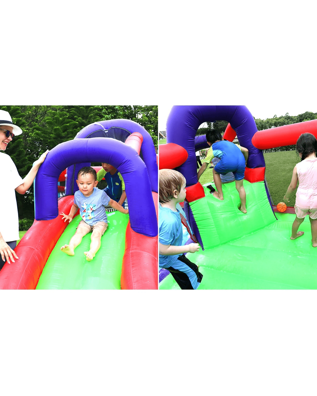 6 play zones: Pool, water slide, trampoline jump, sprinkler, water gun, basketball hoop