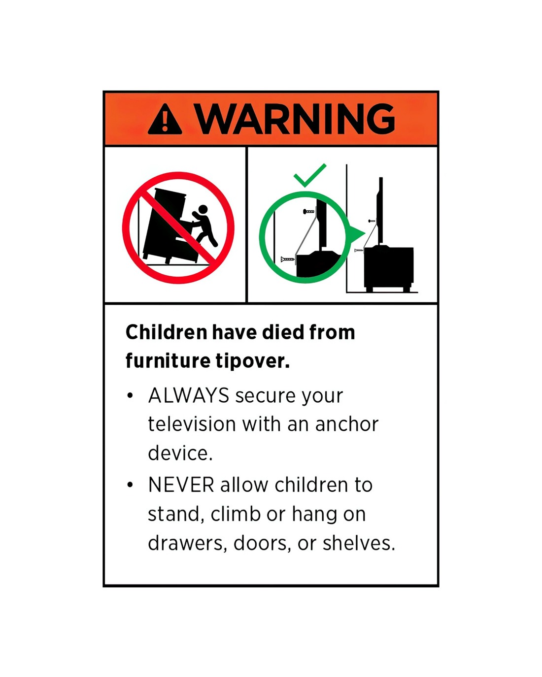 NEVER allow children to stand, climb or hang on drawers, doors, or shelves.