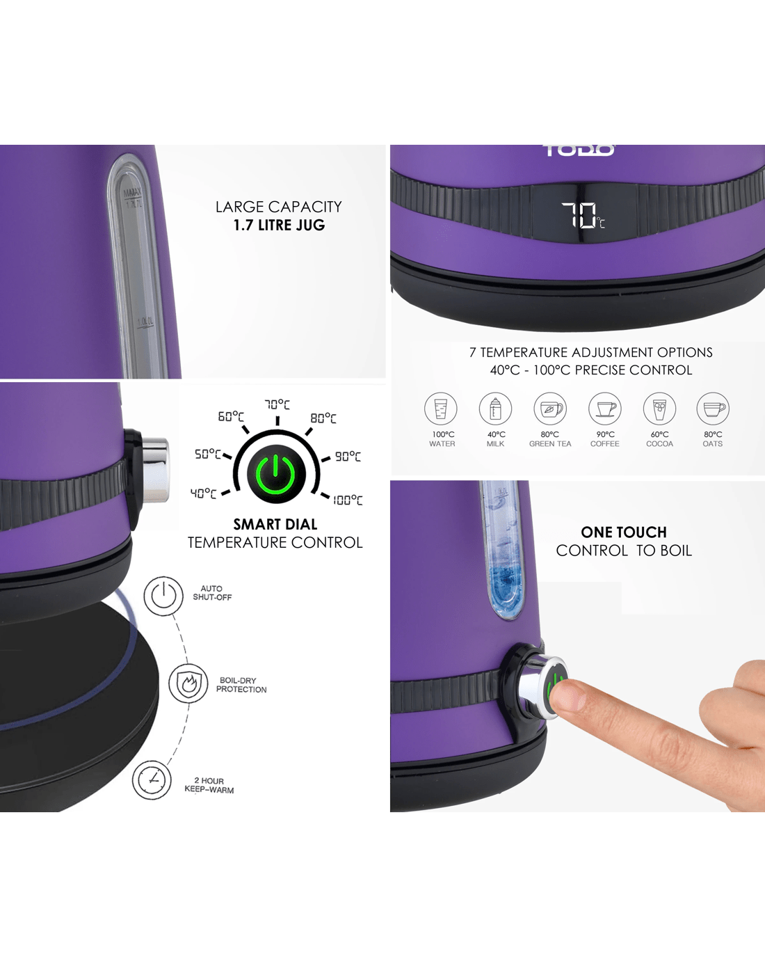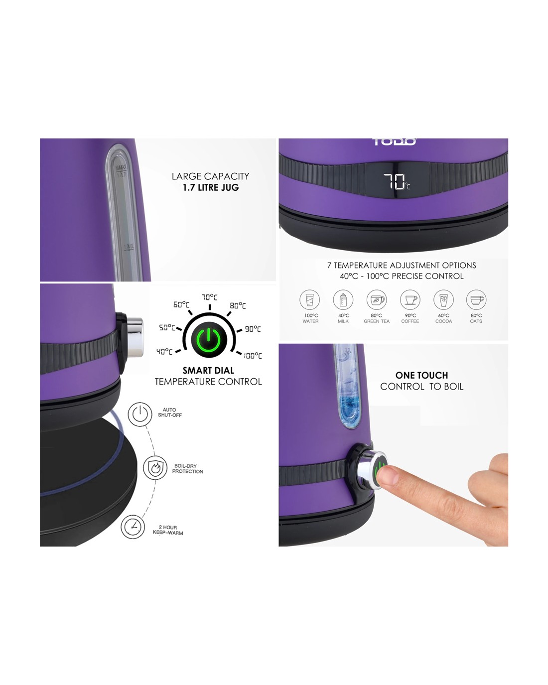 Always missing the right temperature for your cuppa? Preset your temperature with your new TODO smart kettle. More energy efficient as it re-heats only up to your preference rather than re-boiling. Simply press the one touch power button to boil, or set your own temperature with the easy to use smart dial temperature control with keep warm function.