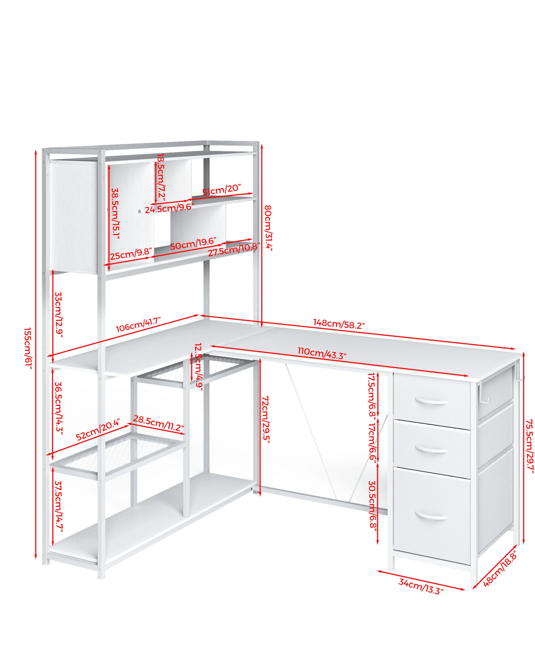• Ample Storage Space: This 148/110*48*155cm corner gaming desk offers wide desktops workspace and ample legroom designed for resting your legs. The bookshelf is divided into 11 areas, providing ample storage space for books, magazines or documents,