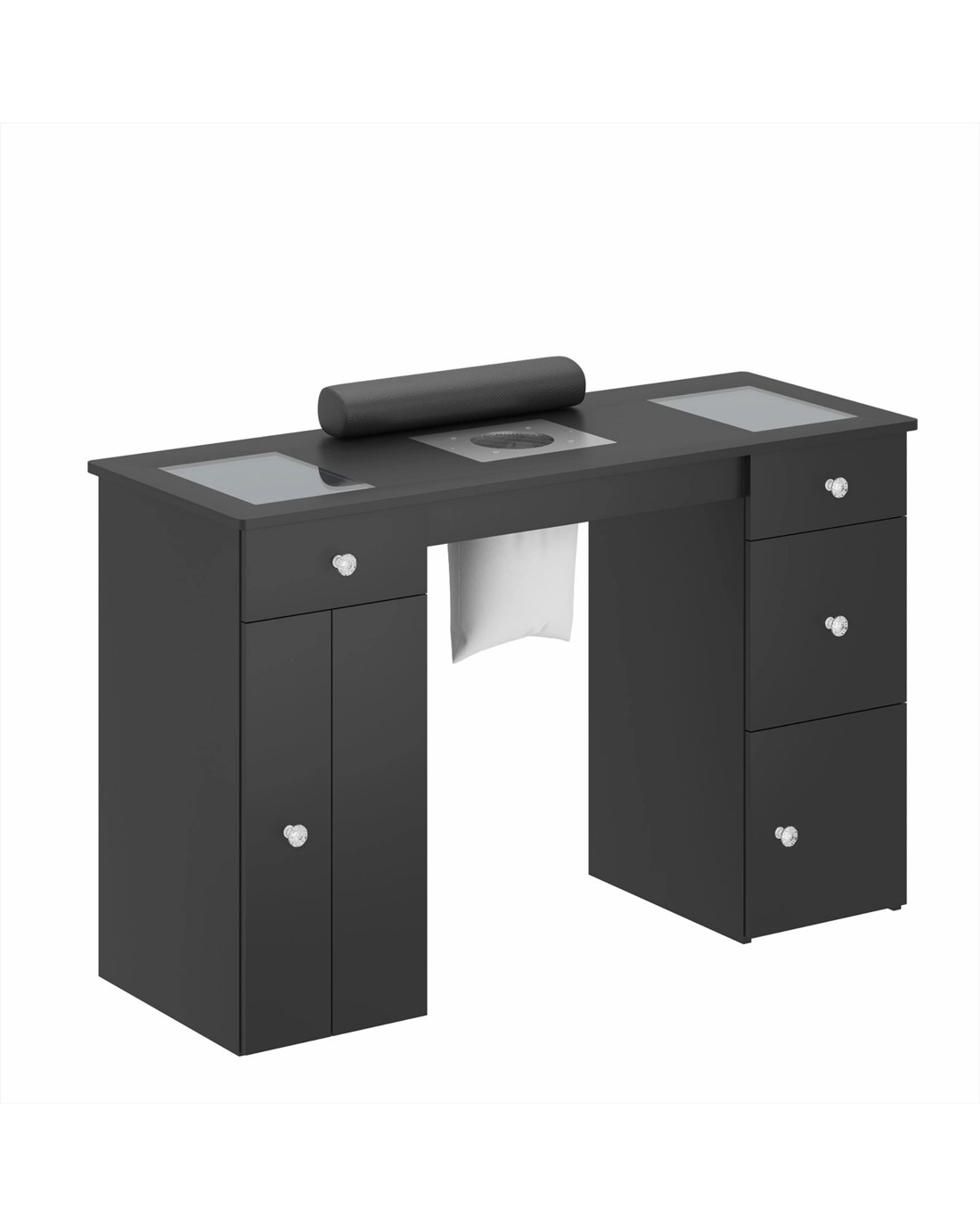 acetone-resistant glass and wooden tabletop is easy to maintain, and the table is equipped with soft wrist pads for customer comfort. With elegant crystal handles and rolling wheels for easy mobility, this versatile table can also serve as a dressing