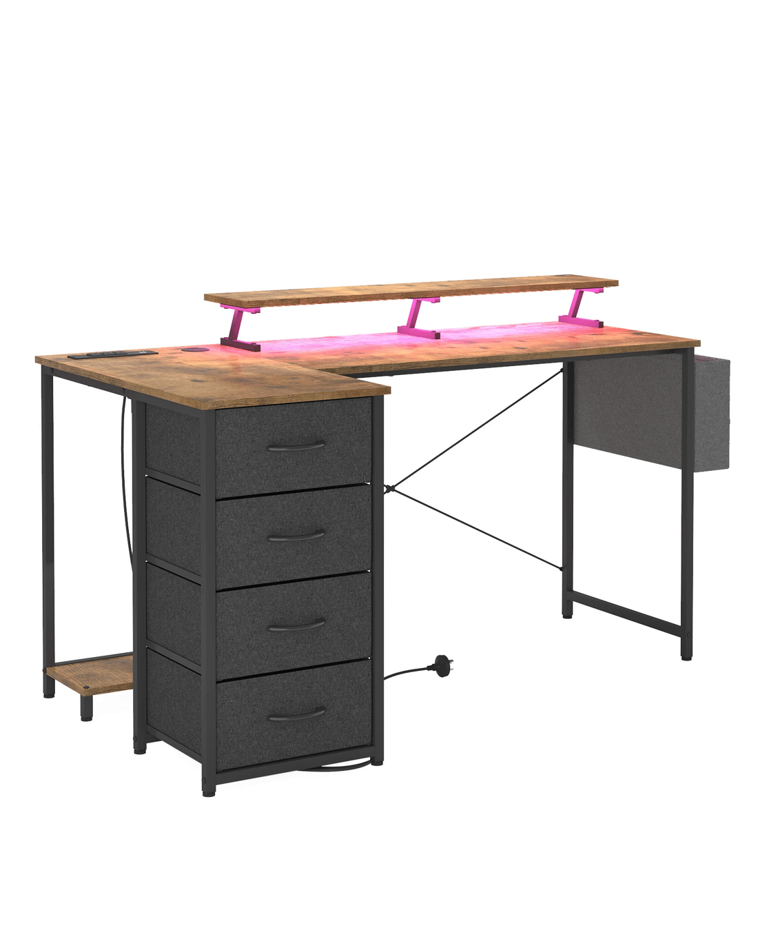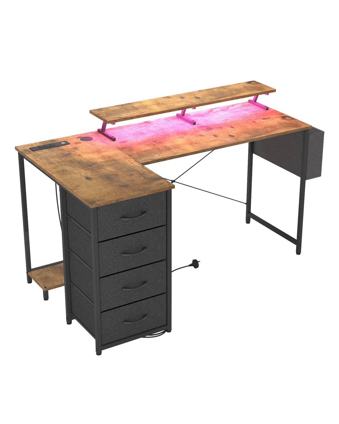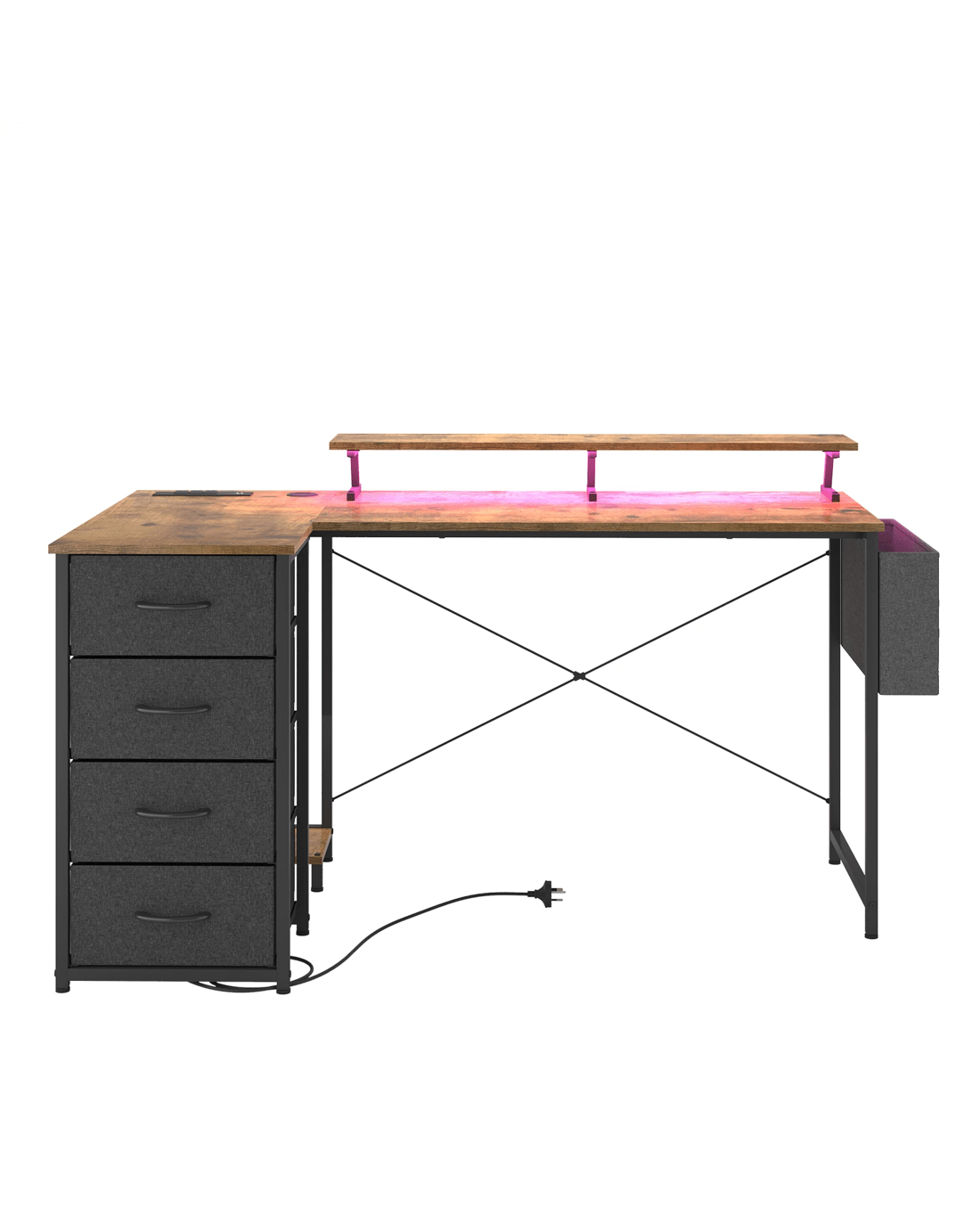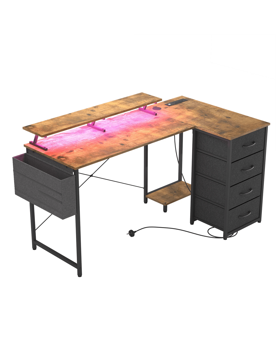 Presenting the ultimate gaming and productivity hub: the L-Shaped Gaming Desk with LED Lights, Power Outlets, and Monitor Stand. This versatile desk combines modern aesthetics with practical features.