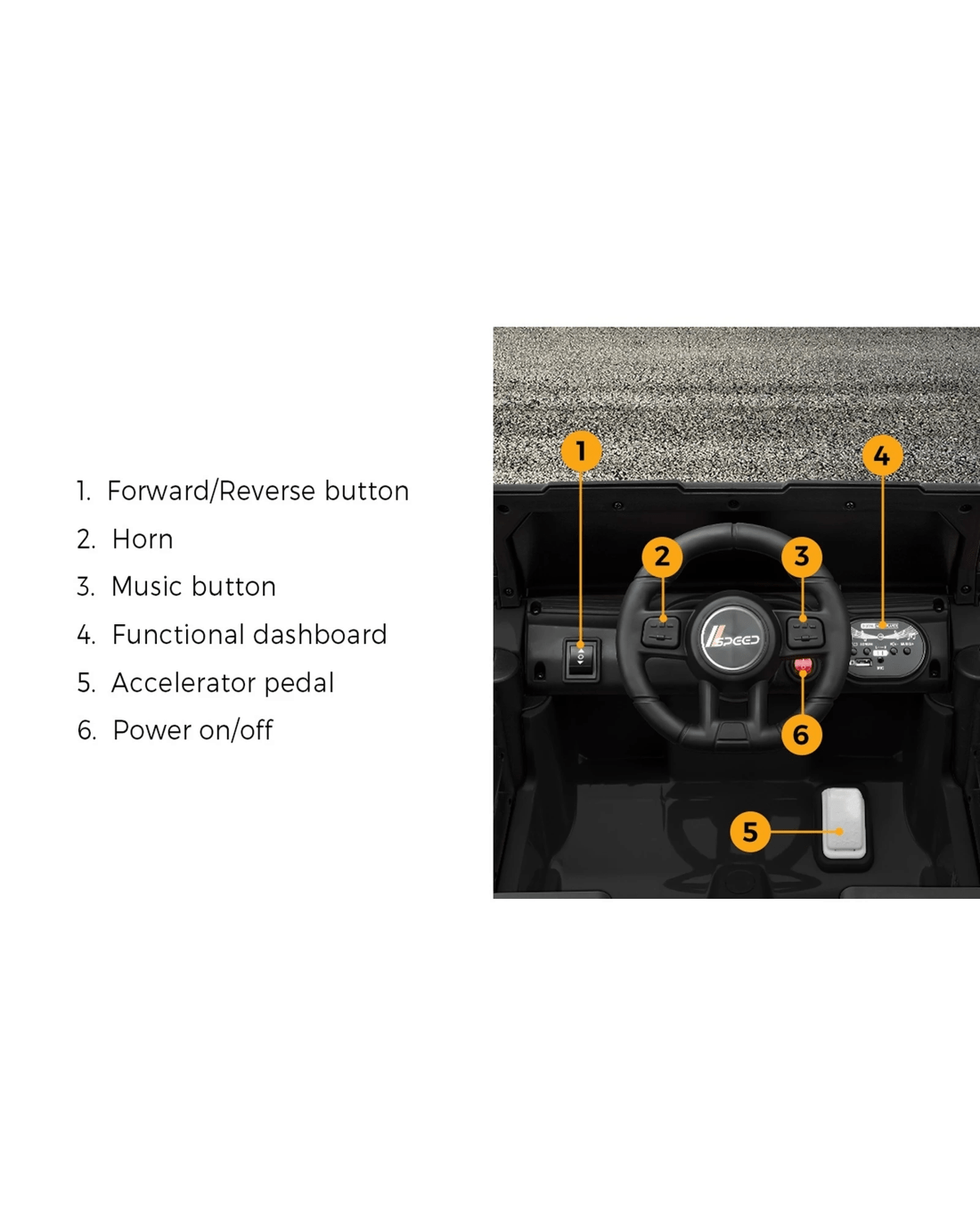 Inside the vehicle, there is plenty of in-car entertainment to keep your child immersed in a music-filled drive with workable dashboard features. Never a dull moment. Always a spirited drive. Plus, with a range of up to 25km on a single charge, this ride on car is ready for up to 2.5 hours of uninterrupted amusement.