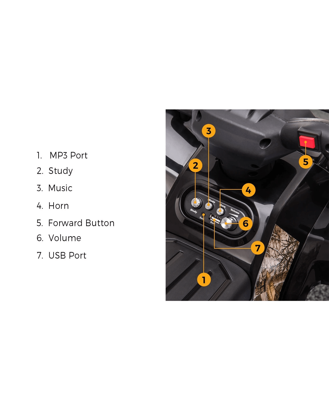 In car entertainment and riding control are also provided that includes a one-button start, music, horn, charging port, and built-in songs playback and MP3 connect for even more musical enjoyment.
